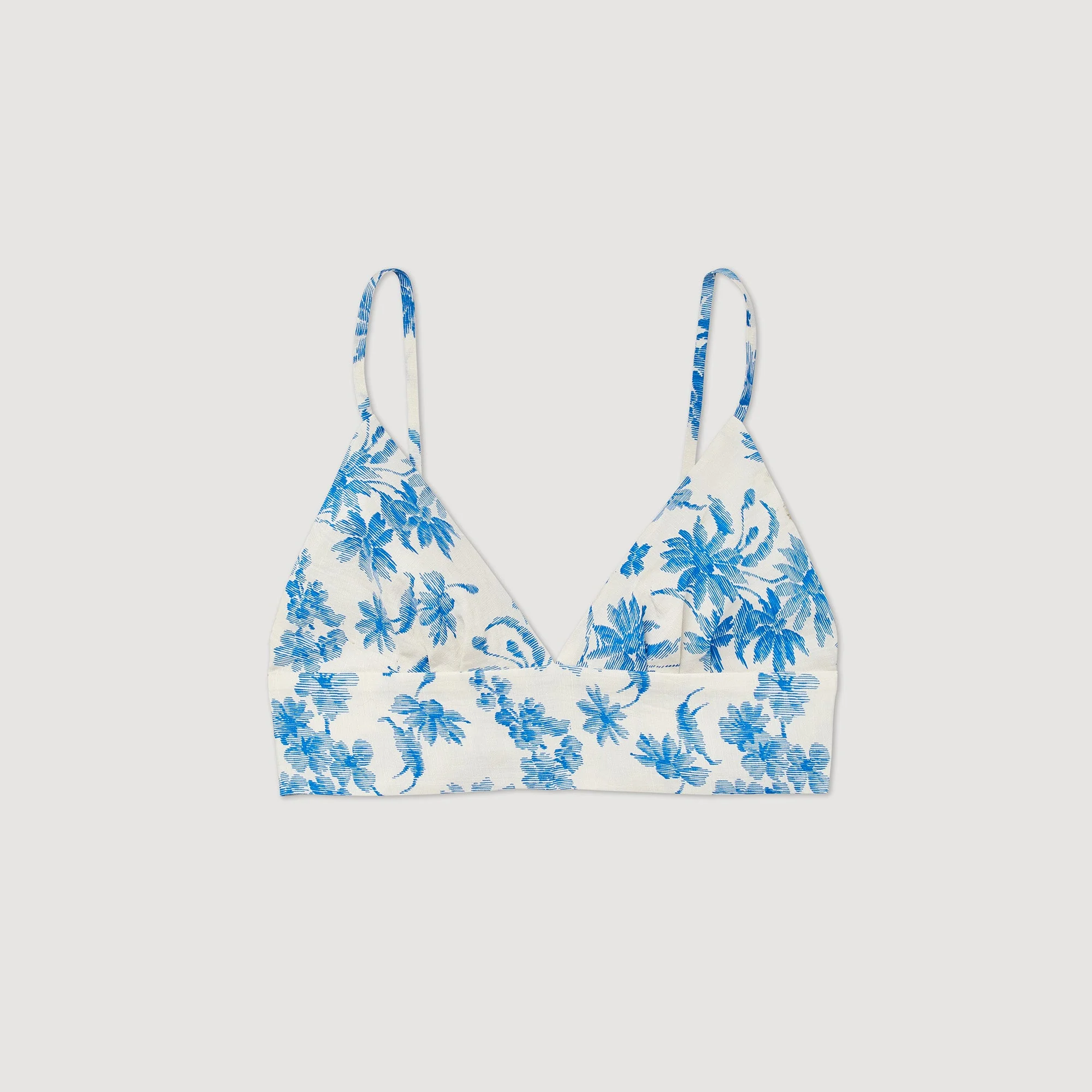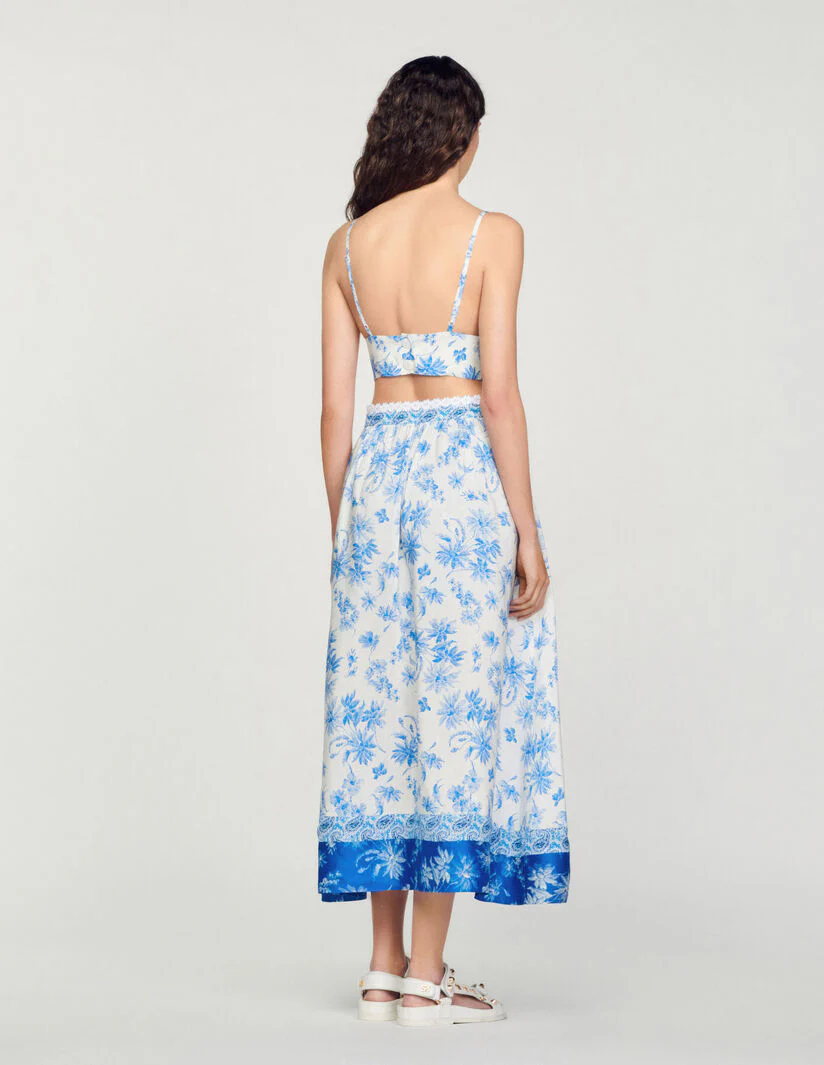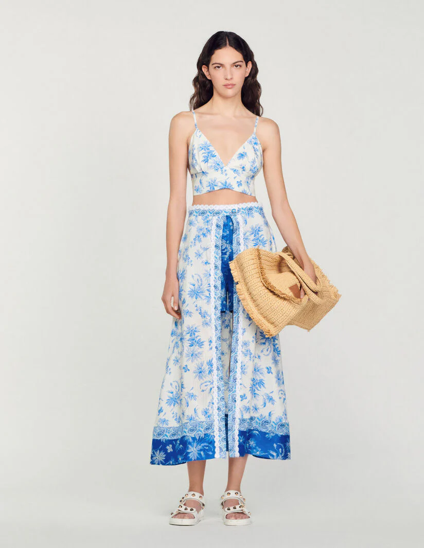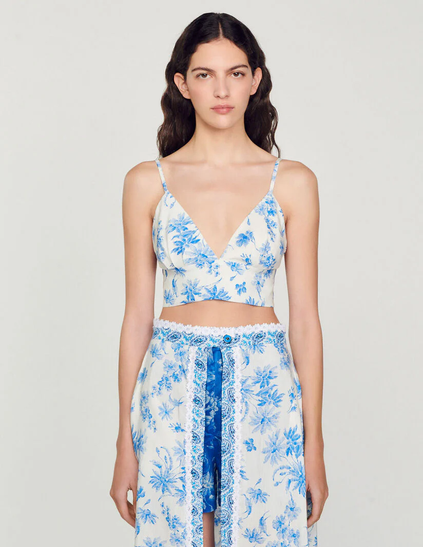 Top corpiño corto de tirantes finos y escote en V, sublimado con un estampado de palmeras «Fleur de Jouy».• Top corpiño Sandro de mujer