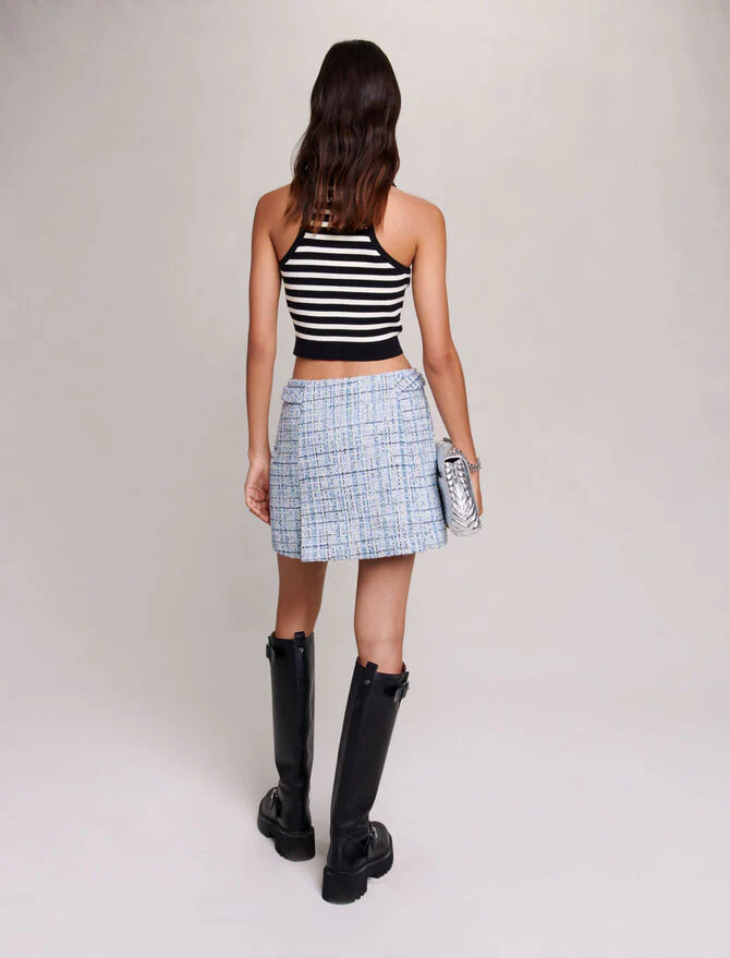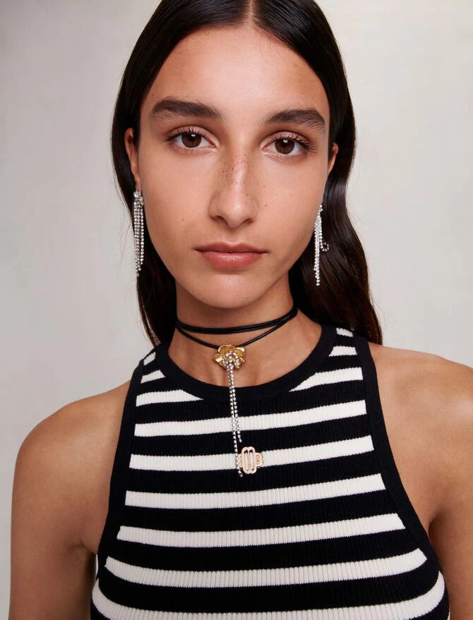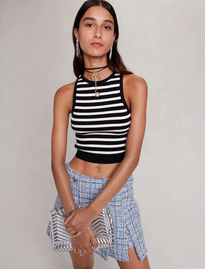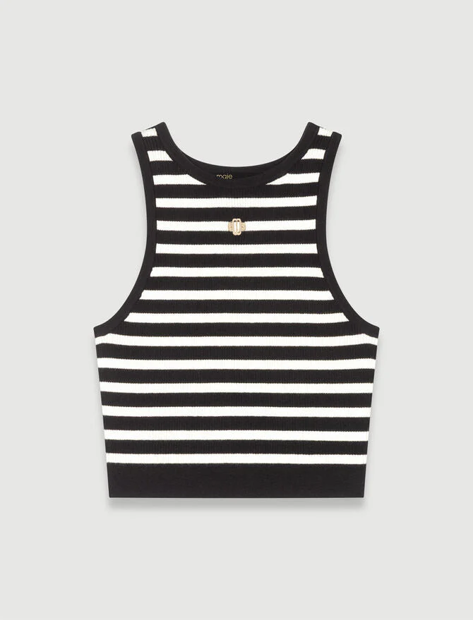 Esta temporada, Maje se inspira en el mundo urbano y revisita con atrevimiento piezas intemporales de su guardarropa para dar una vuelta de tuerca a sus «looks» de diario.Un juego de rayas se invita en este top corto de canalé que combina comodidad y elegancia.Sin mangas, revela un cuello redondo, una espalda cruzada y bordes en contraste. ¿El detalle elegante? Revela un trébol insignia dorado en la parte delantera para marcar su figura con estilo.Ideal para cualquier estilo, combínelo con una falda texturada, un bolso metalizado, botas altas y bisutería para un «look» decididamente informal.Ref.: MFPTO00892