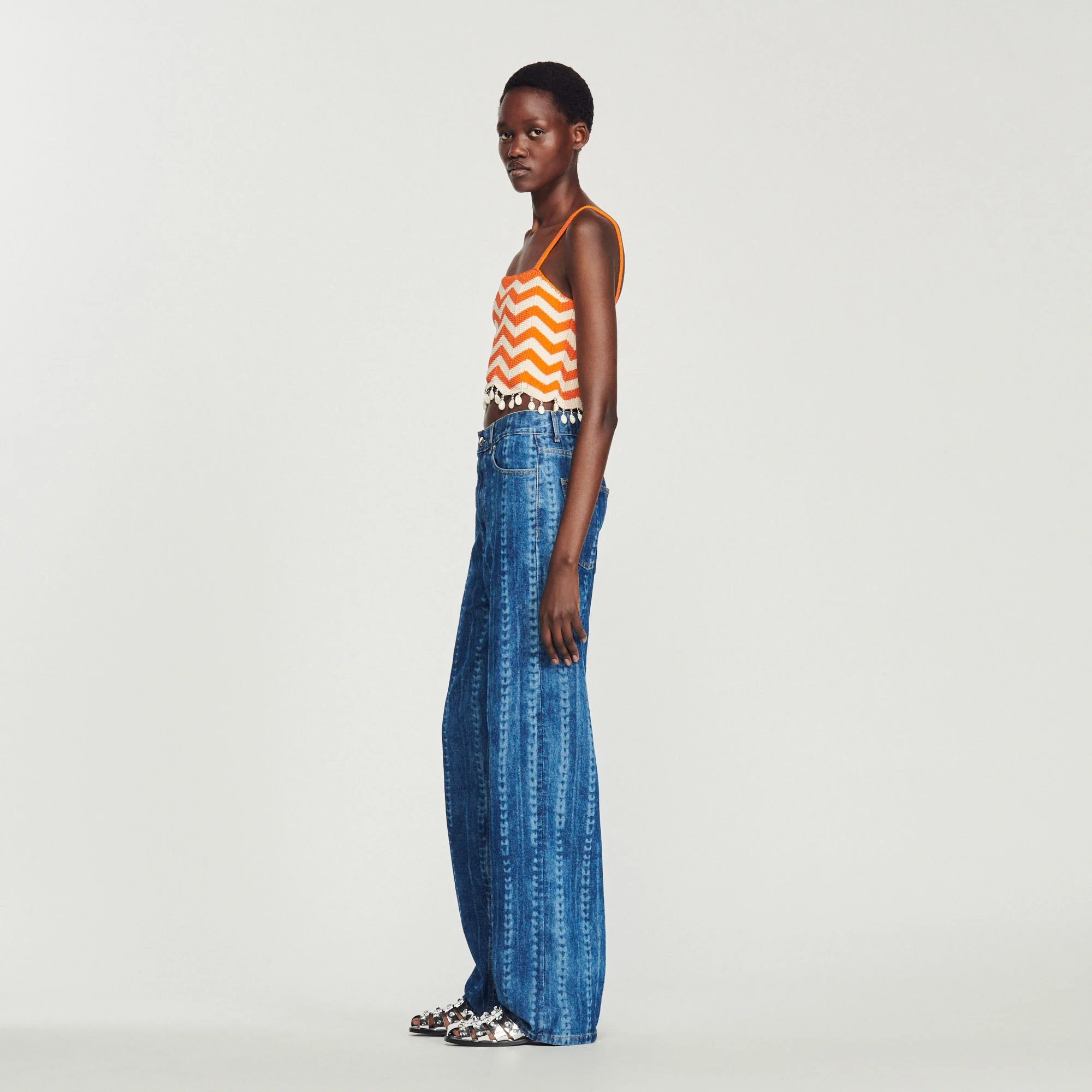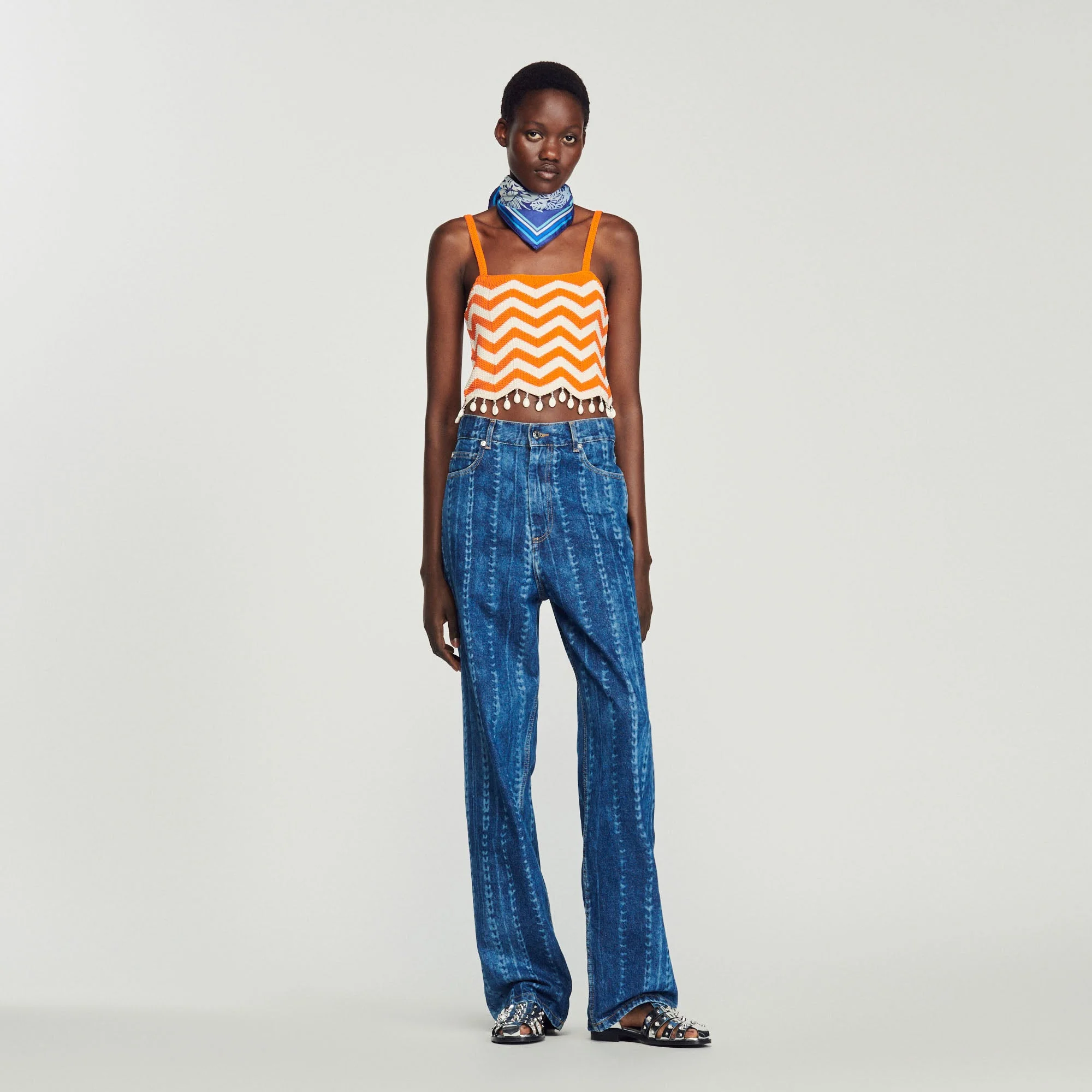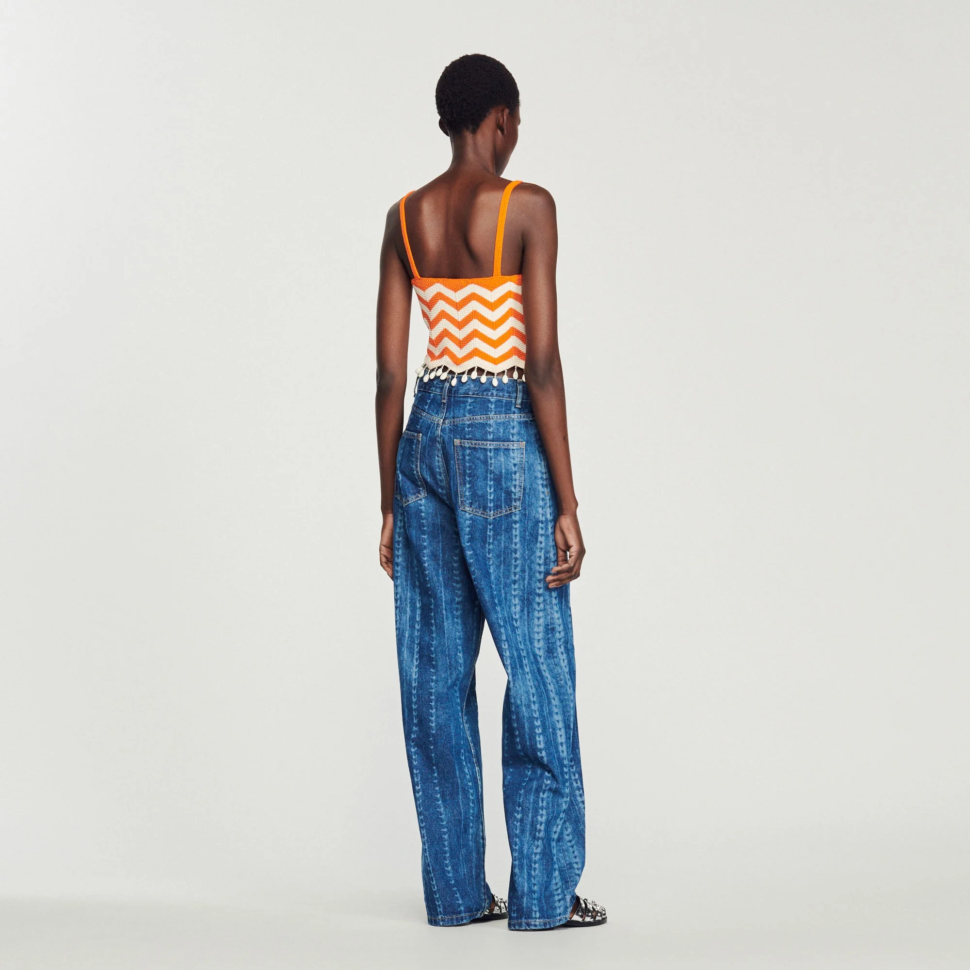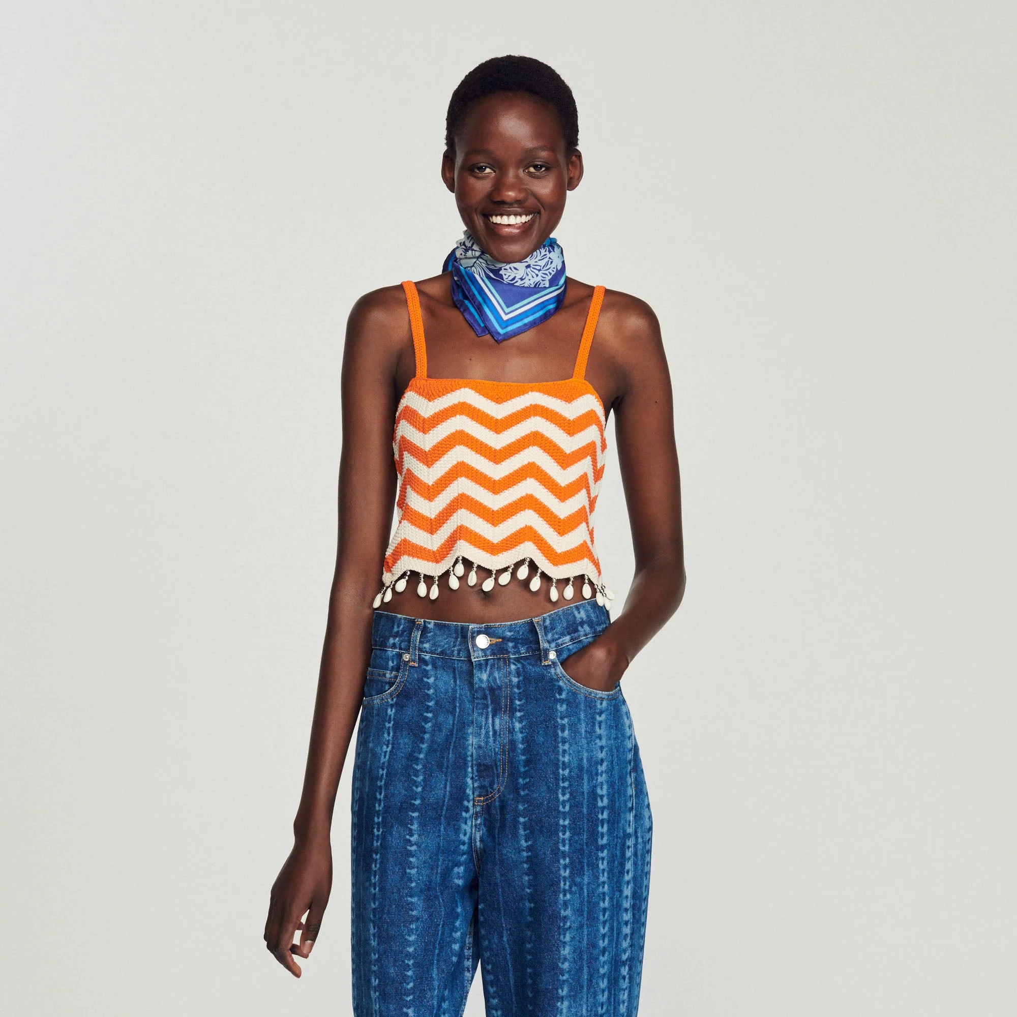 Top corto de tirantes finos de punto con motivos de olas bicolores, con acabados festoneados y sublimado con adornos de perlas y conchas en la parte inferior.• Top corto de punto Sandro de mujer