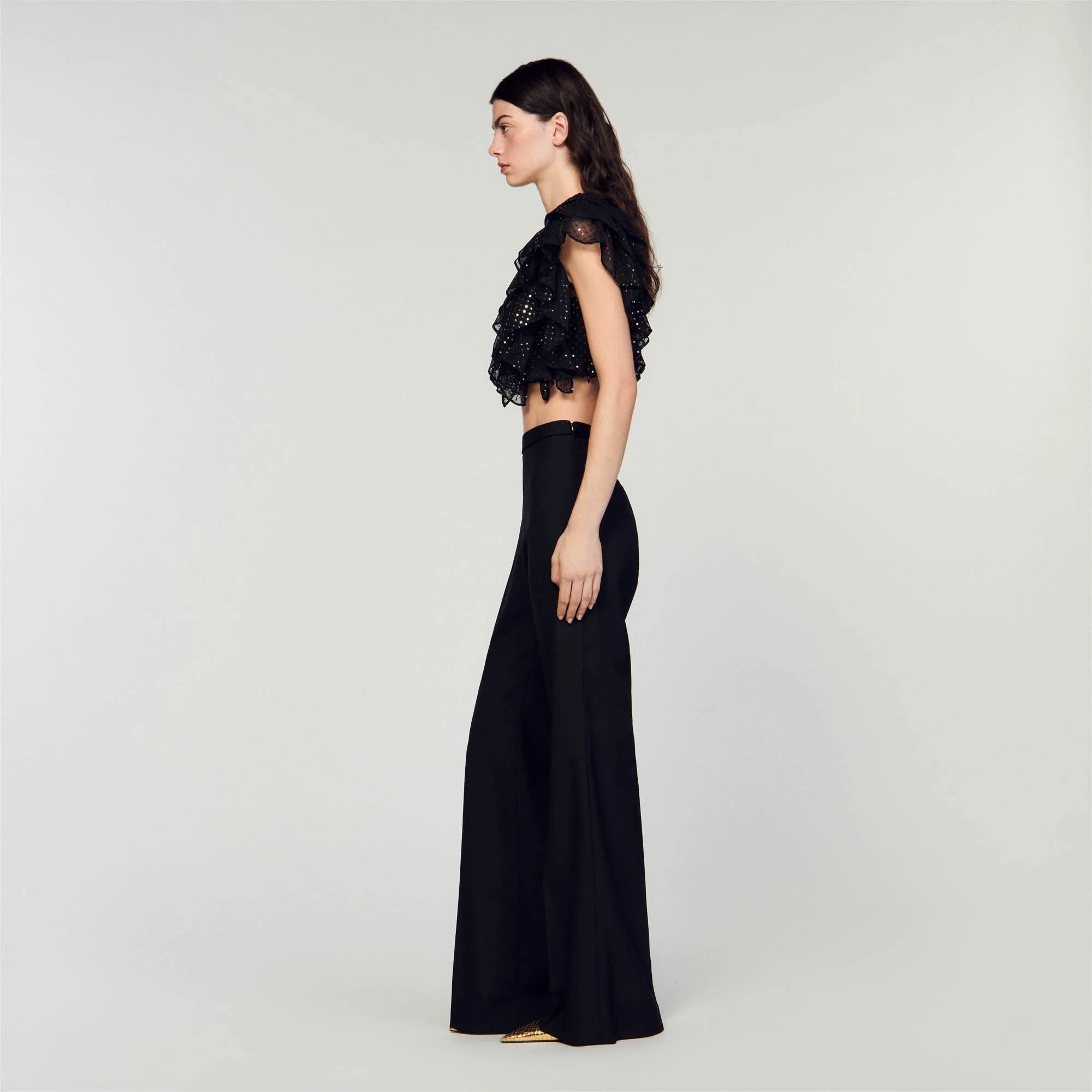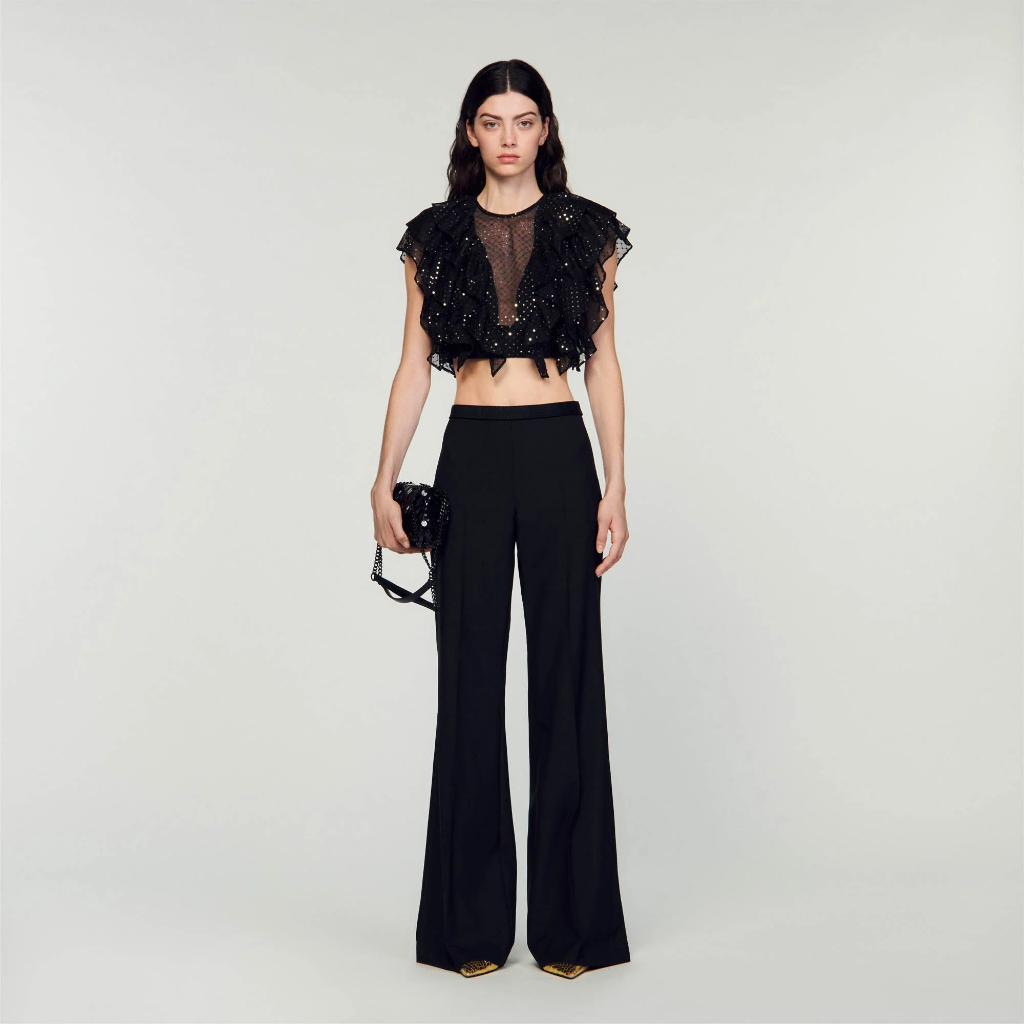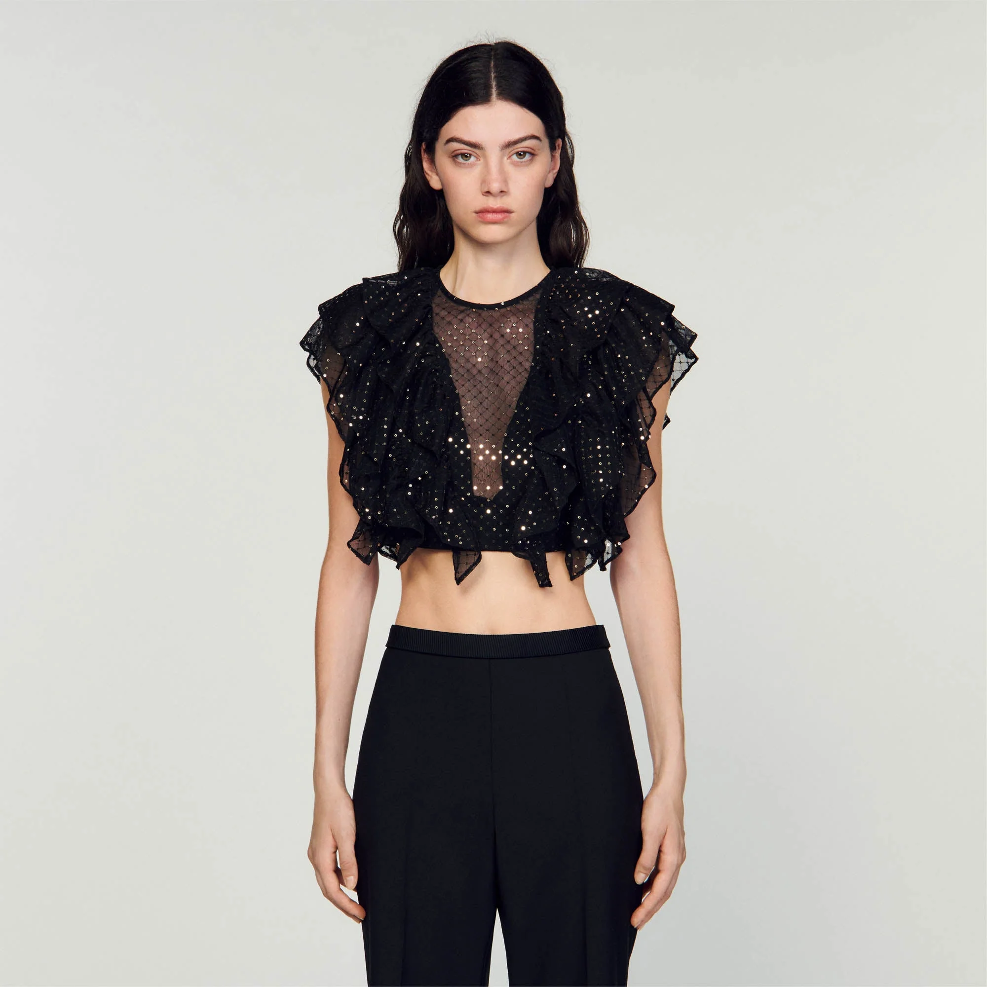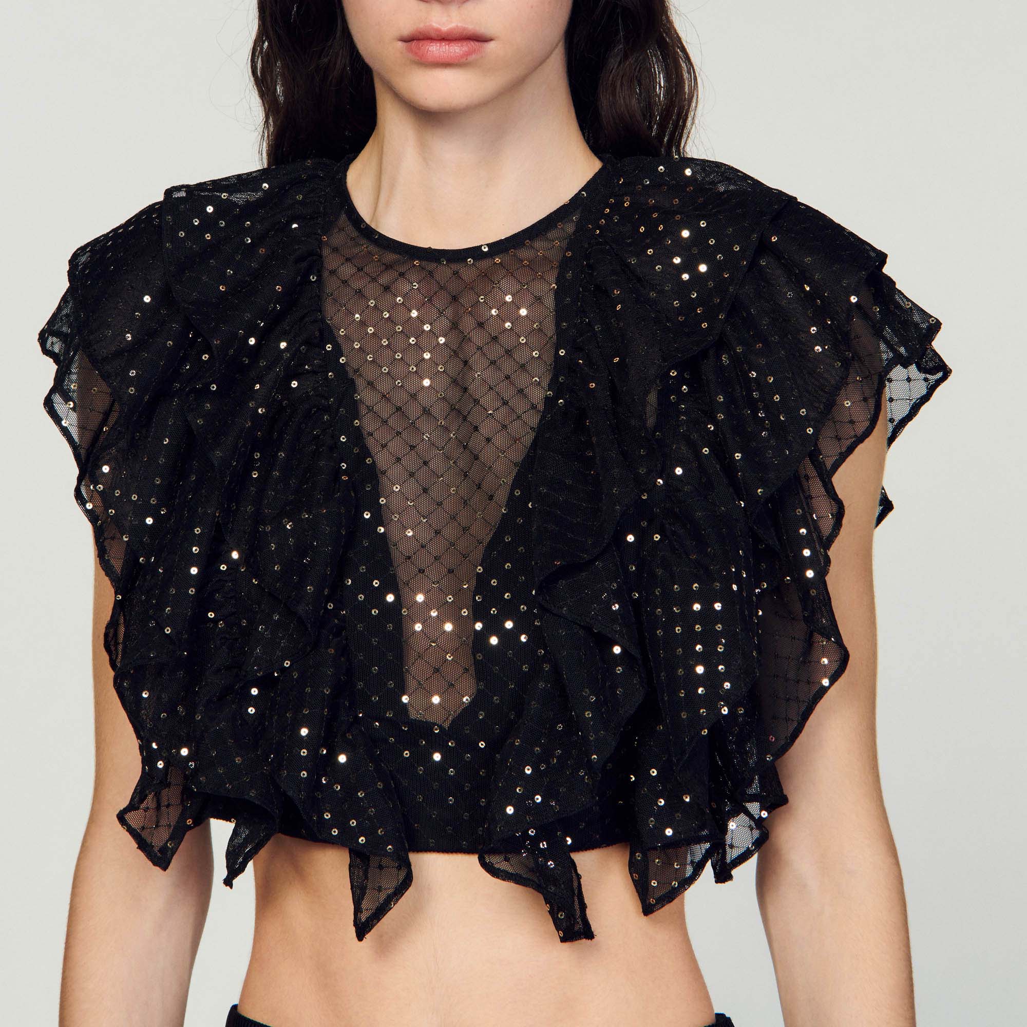 Top corto con volantes de tul bordado de lentejuelas, con cuello redondo y mangas cortas.