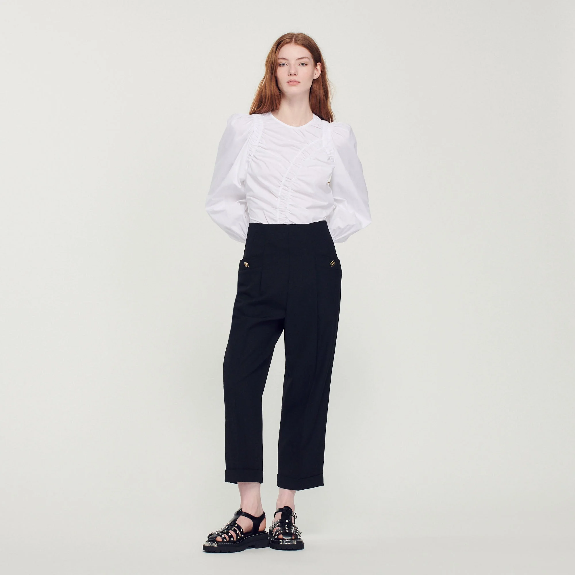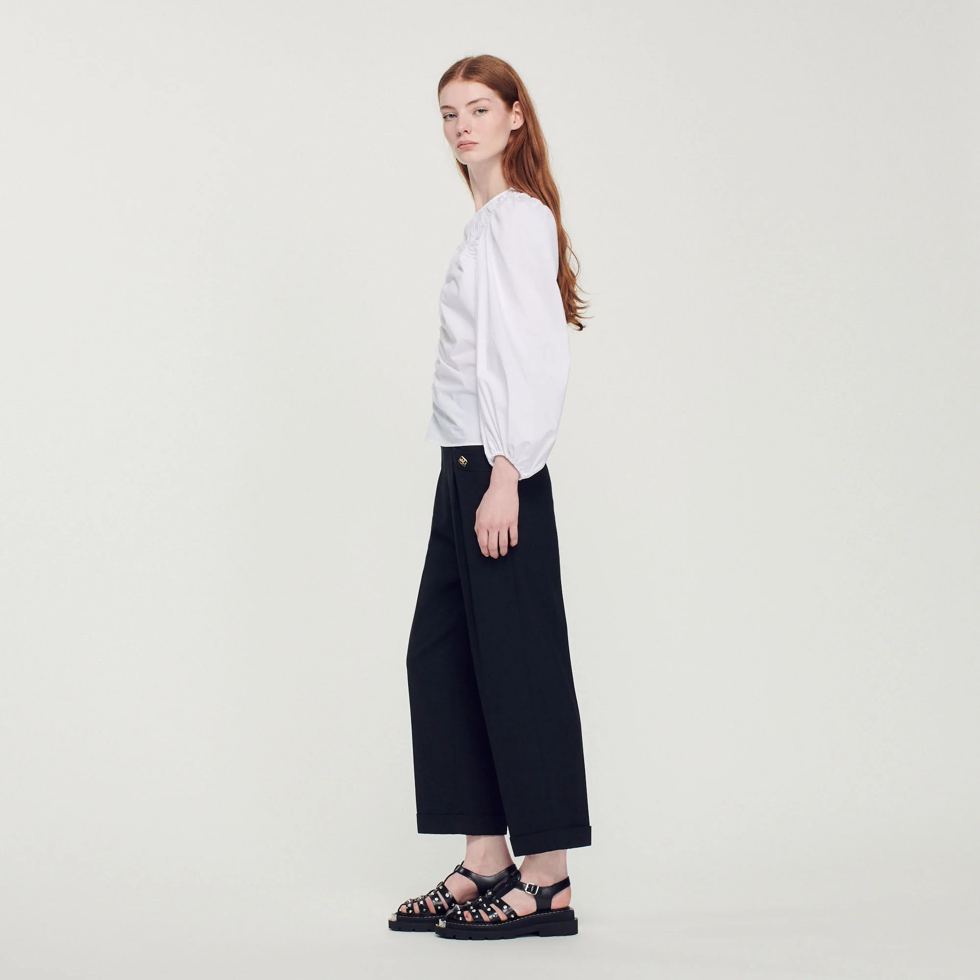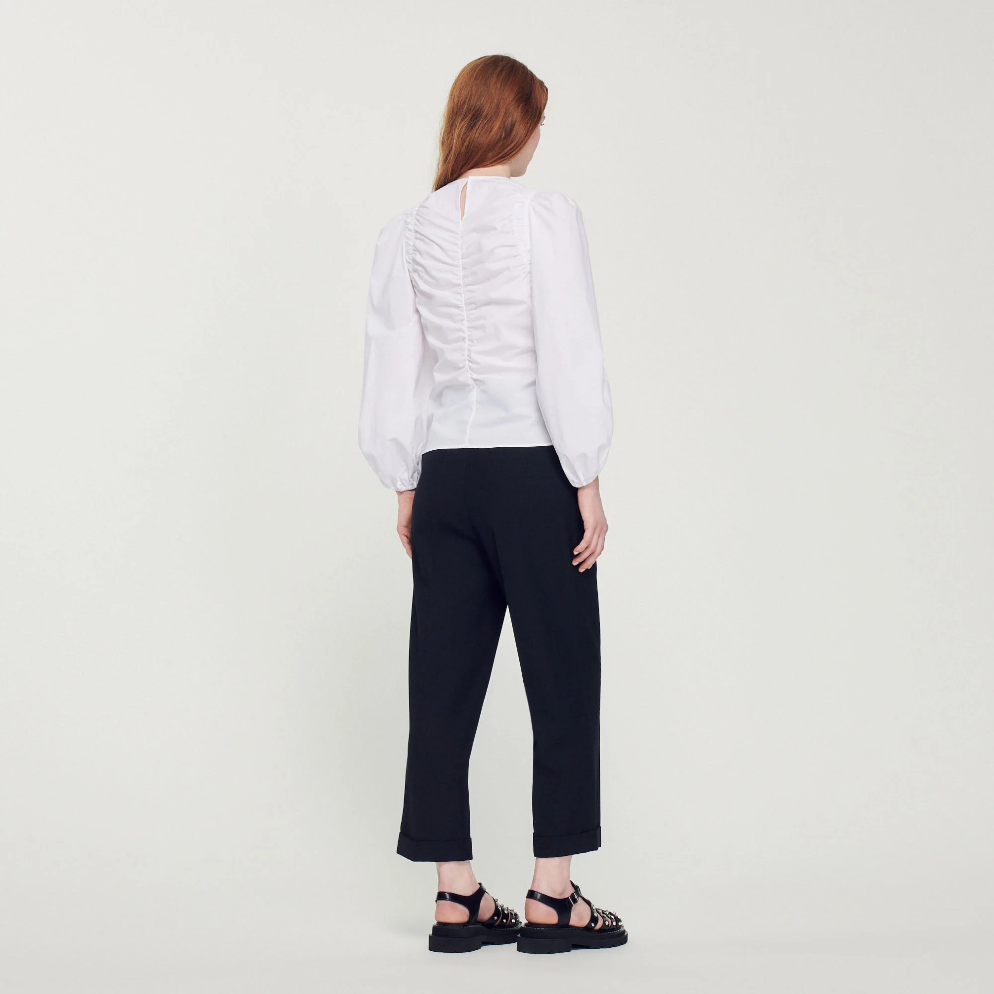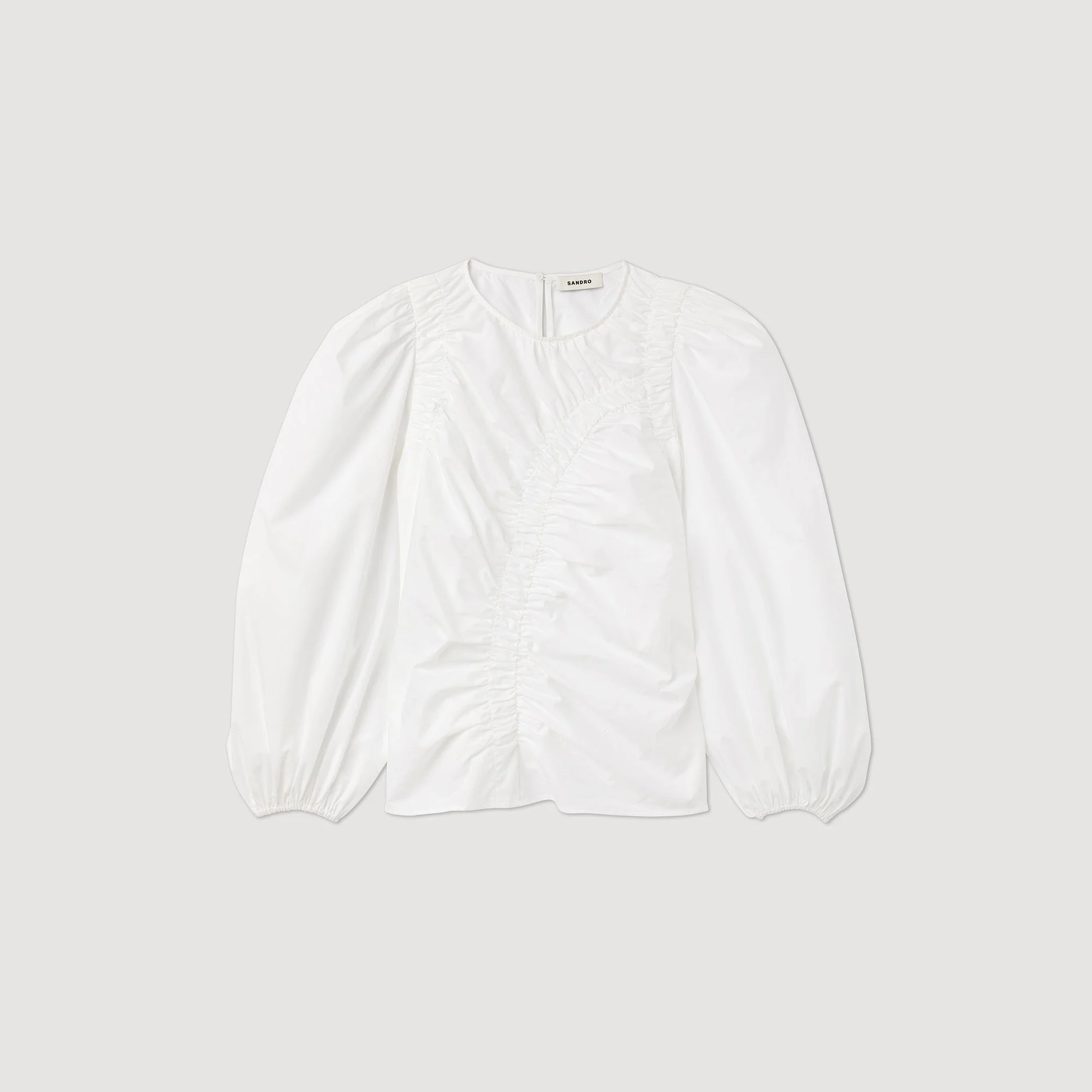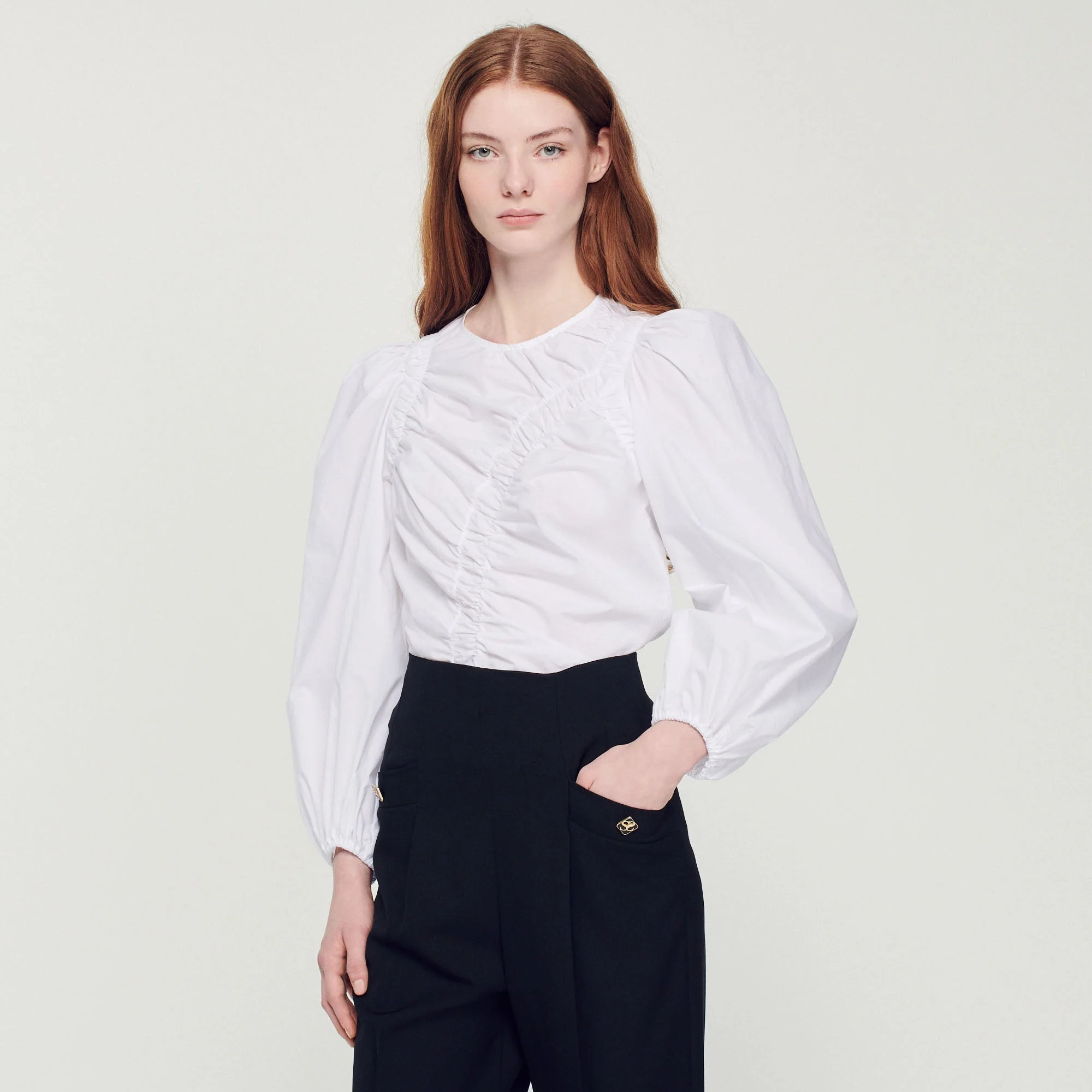 Top de manga larga de popelina de algodón con juego de frunces en la parte delantera.• Top Sandro de mujer