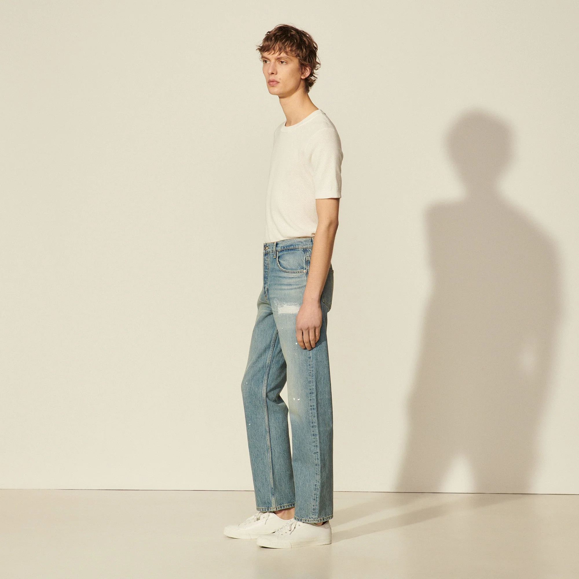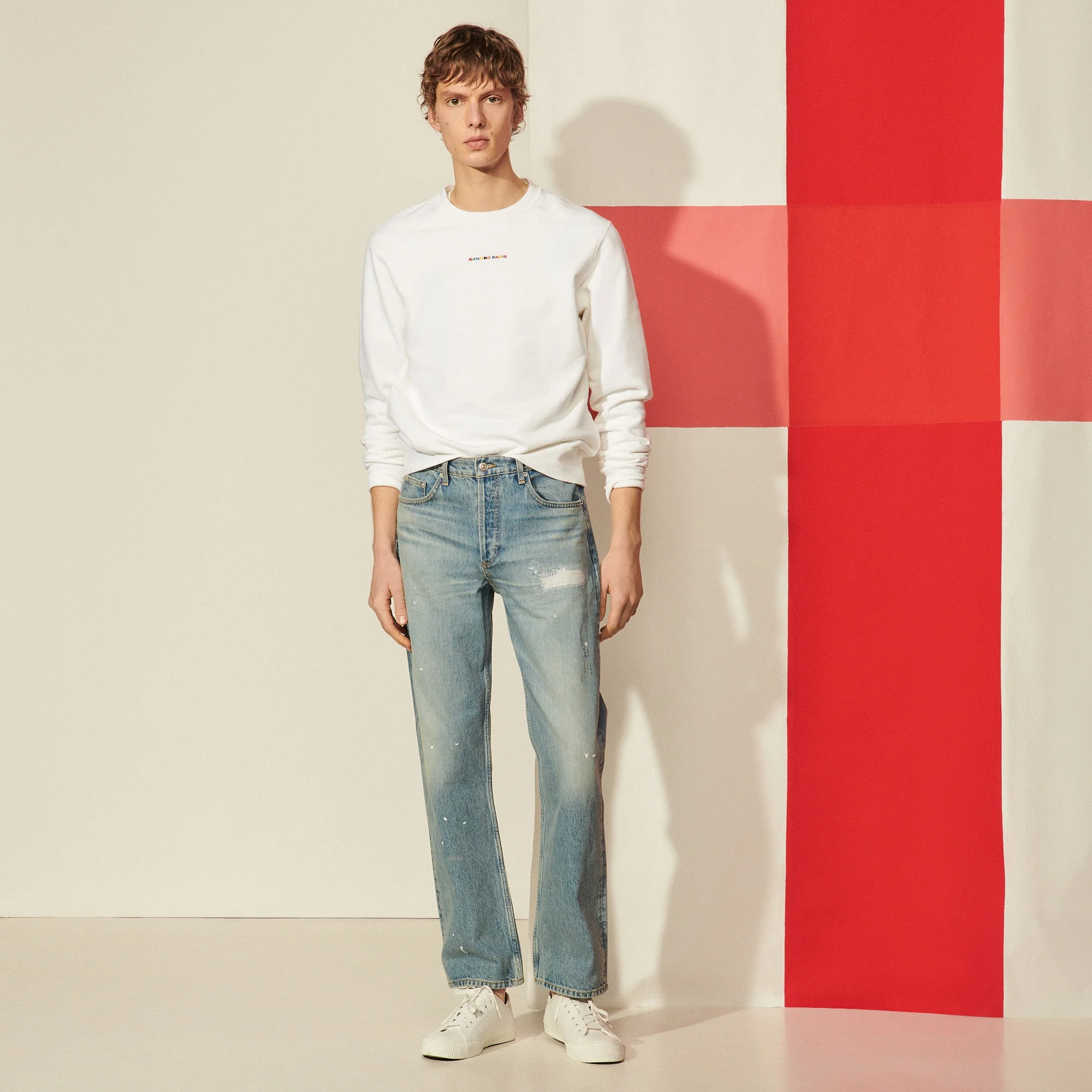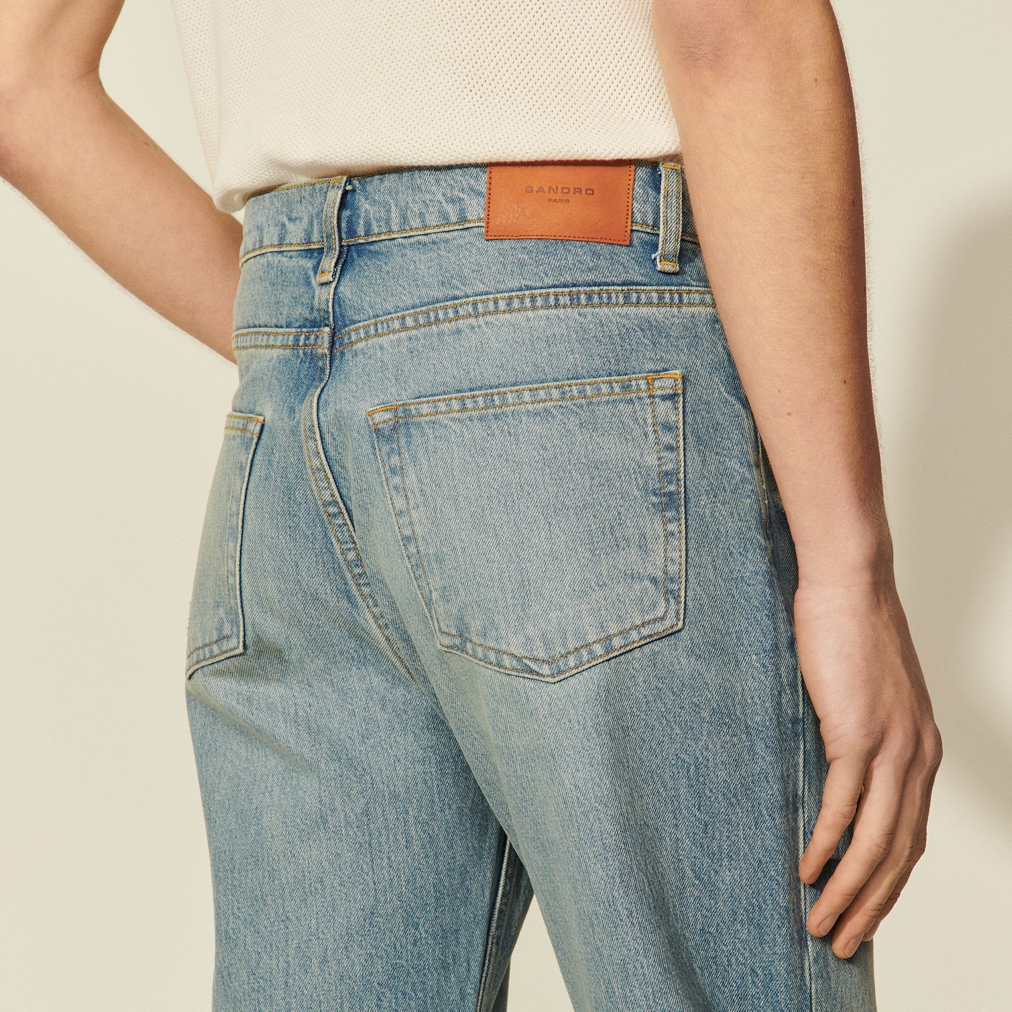 Vaquero de hombre Sandro Vaquero desteñido Corte recto Cinco bolsillos Talle clásico Botonadura oculta bajo tapeta El modelo lleva la talla 30 Este denim de algodón procedente de la agricultura orgánica está fabricado mediante un proceso respetuoso con el medioambiente que reduce el consumo de agua en un 95 % y conlleva una disminución significativa del uso de energía y de productos químicos. REFERENCIA : SHPJE00165 COMPOSICIÓNTejido principal: 100% algodón Forro bolsillos: 65% algodón, 35% poliéster