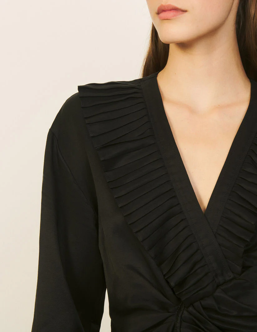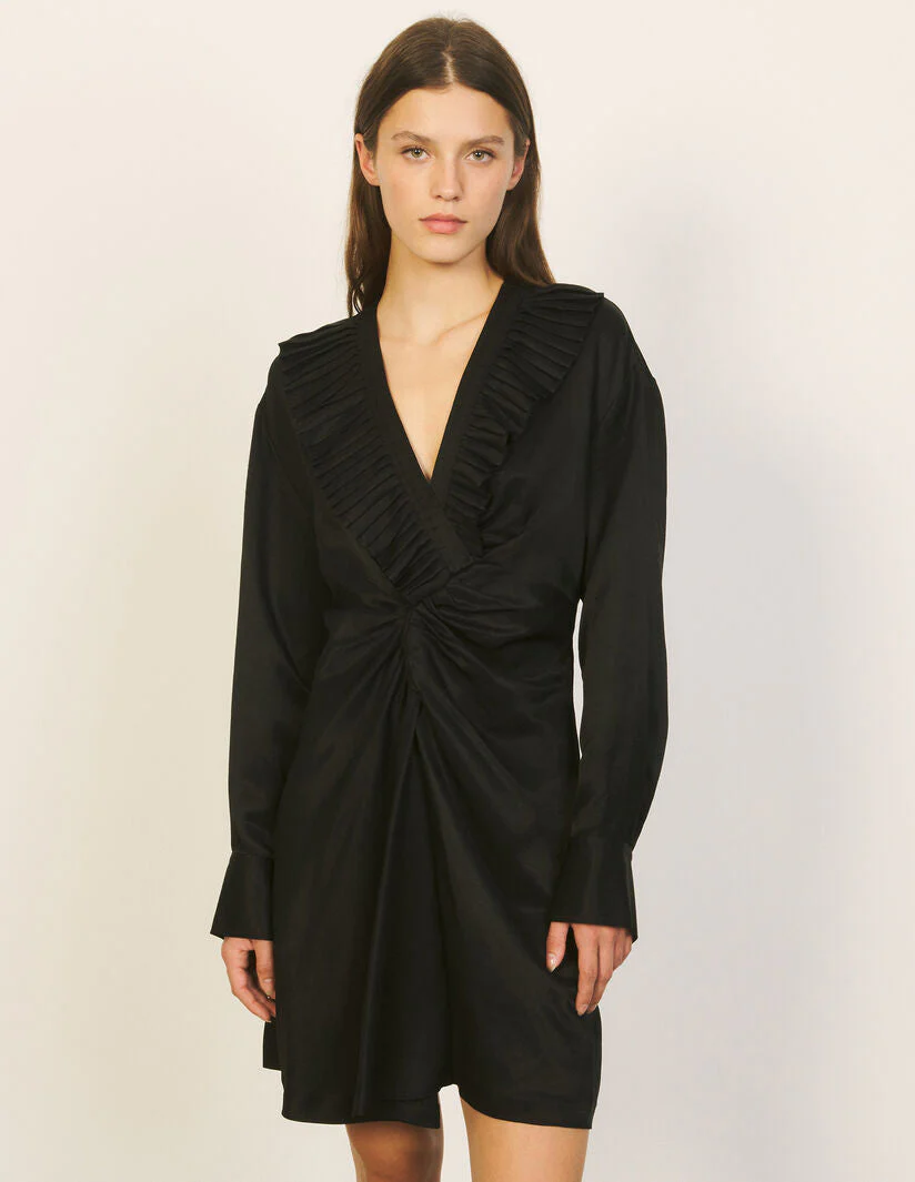 Vestido De Mujer Sandro Vestido Corto De Viscosa Y Lino Escote En V Cruzado Con Volantes Fruncidos Manga Larga Ajustada Por Puños Corte Ajustado En La Cintura Largo Hasta La Mitad Del Muslo Sfpro01936 Tejido Principal: 67% Viscosa, 33% Lino