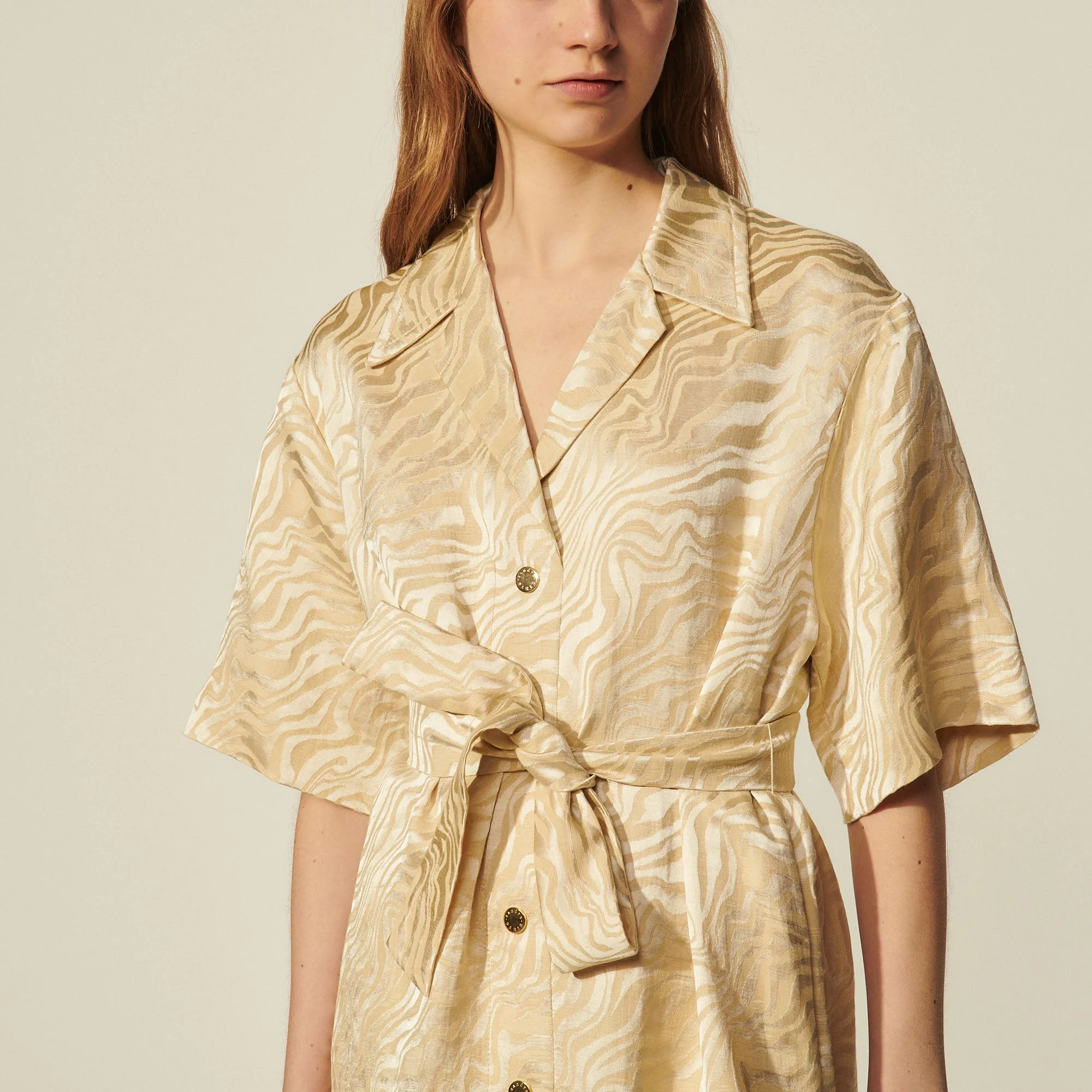 Vestido Aimee Arena. Vestido de mujer Sandro • Vestido camisero de jacquard tono sobre tono • Cuello sastre • Manga corta • Cinturón extraíble • Bolsillos en las costuras laterales • Cierre de botones automáticos en mitad de la parte delantera • La modelo lleva la talla 36 Référence : SFPRO01594COMPOSICIÓN Tejido principal: 43% viscosa, 32% lino, 25% algodón Forro bolsillos: 100% algodón