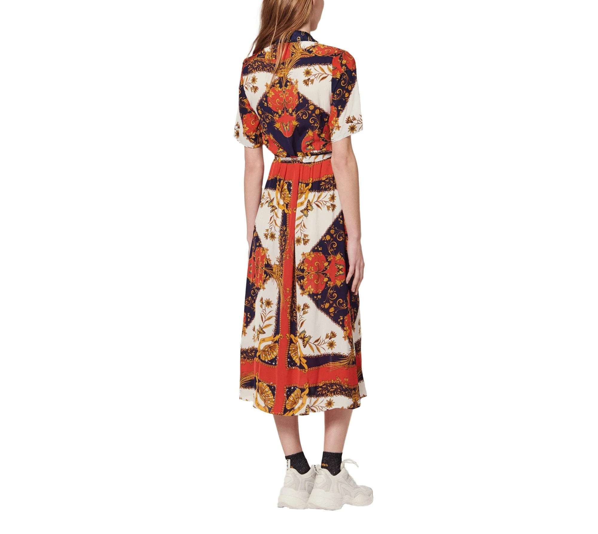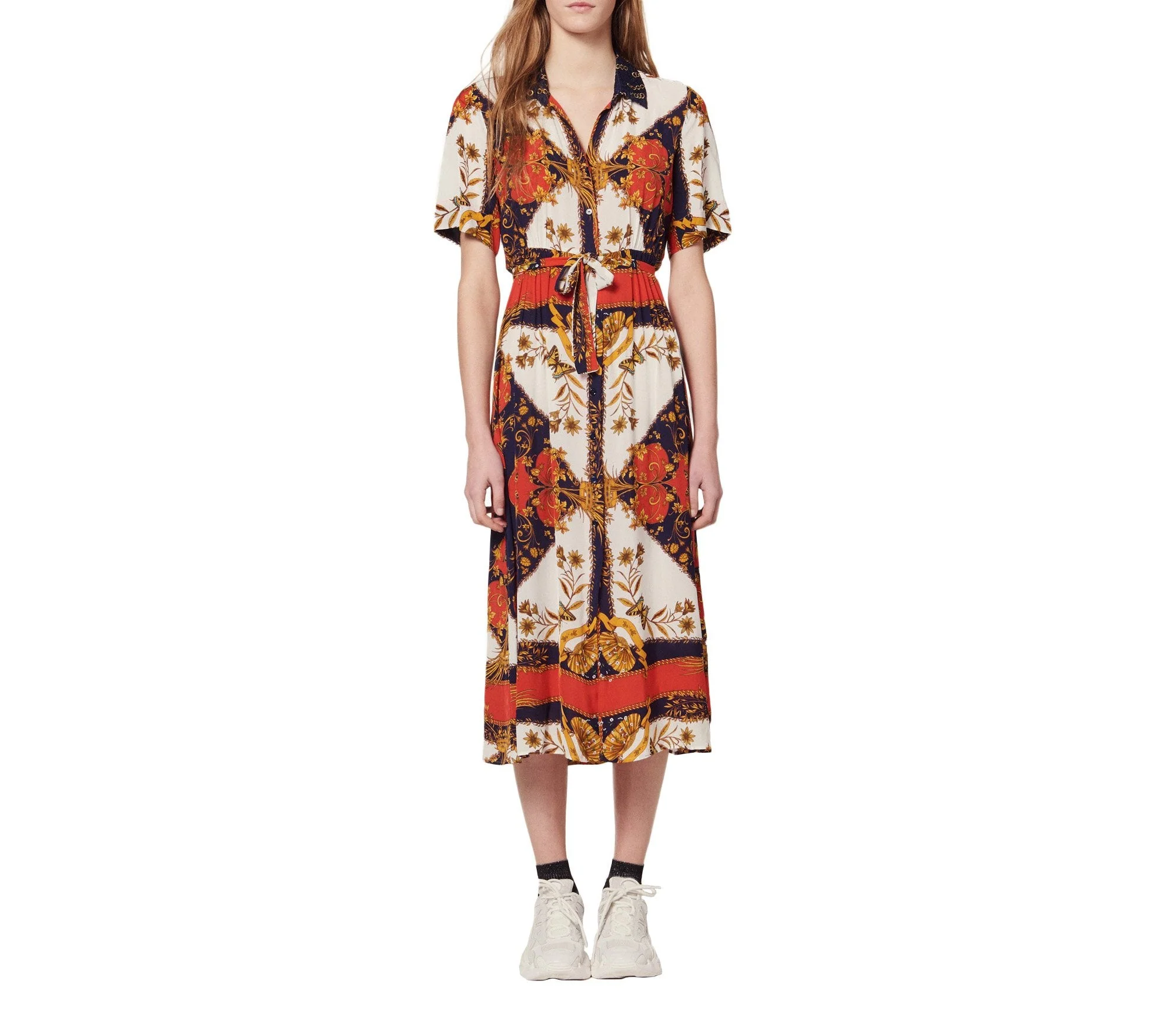 VESTIDO LARGO ESTAMPADO, CON BOTONES FRONTALES, MANGA CORTA Y LAZO EN CINTURA., MARCA SANDRO. 100% VISCOSA. LIMPIEZA EN SECO PROFESIONAL. REVISAR ETIQUETA INTERNA DE LAVADO PARA MÁS INFORMACIÓN.