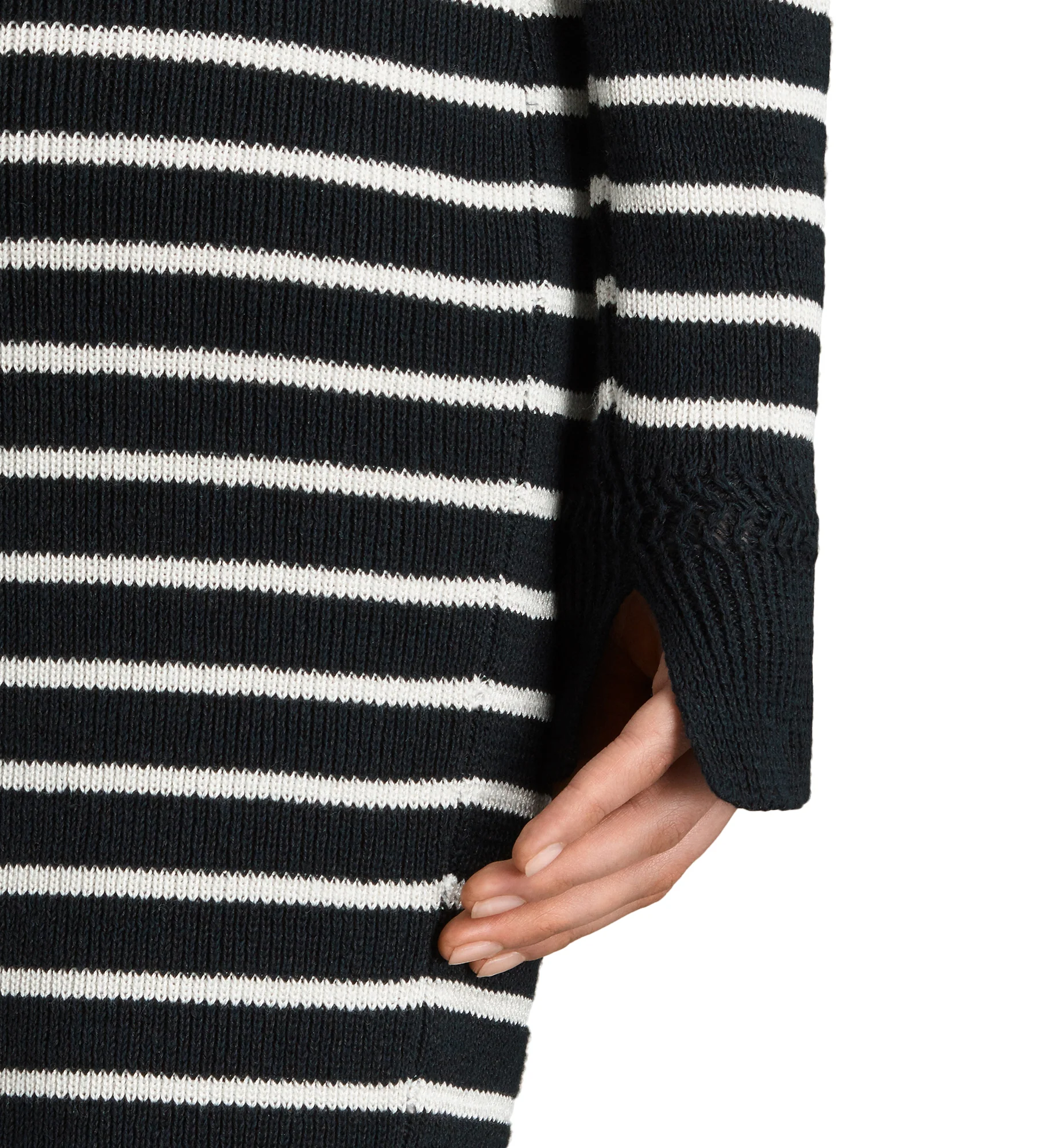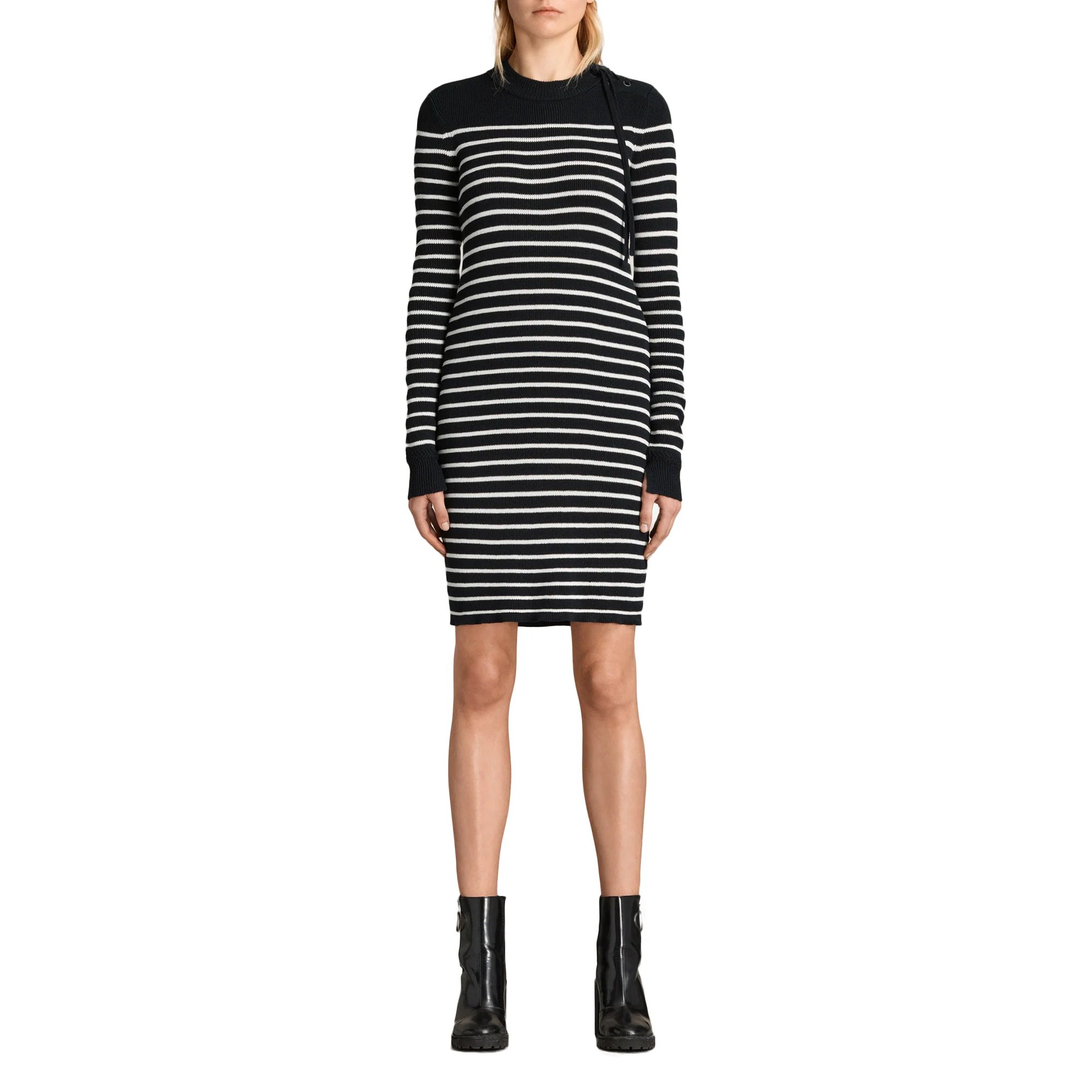 VESTIDO ASH, MARCA ALLSAINTS. VESTIDO CORTO DE PUNTO, CUELLO REDONDO, MANGAS LARGAS, DETALLE DE CORDÓN Y OJALES EN HOMBRO IZQUIERDO, LÍNEAS HORIZONTALES A CONTRASTE.