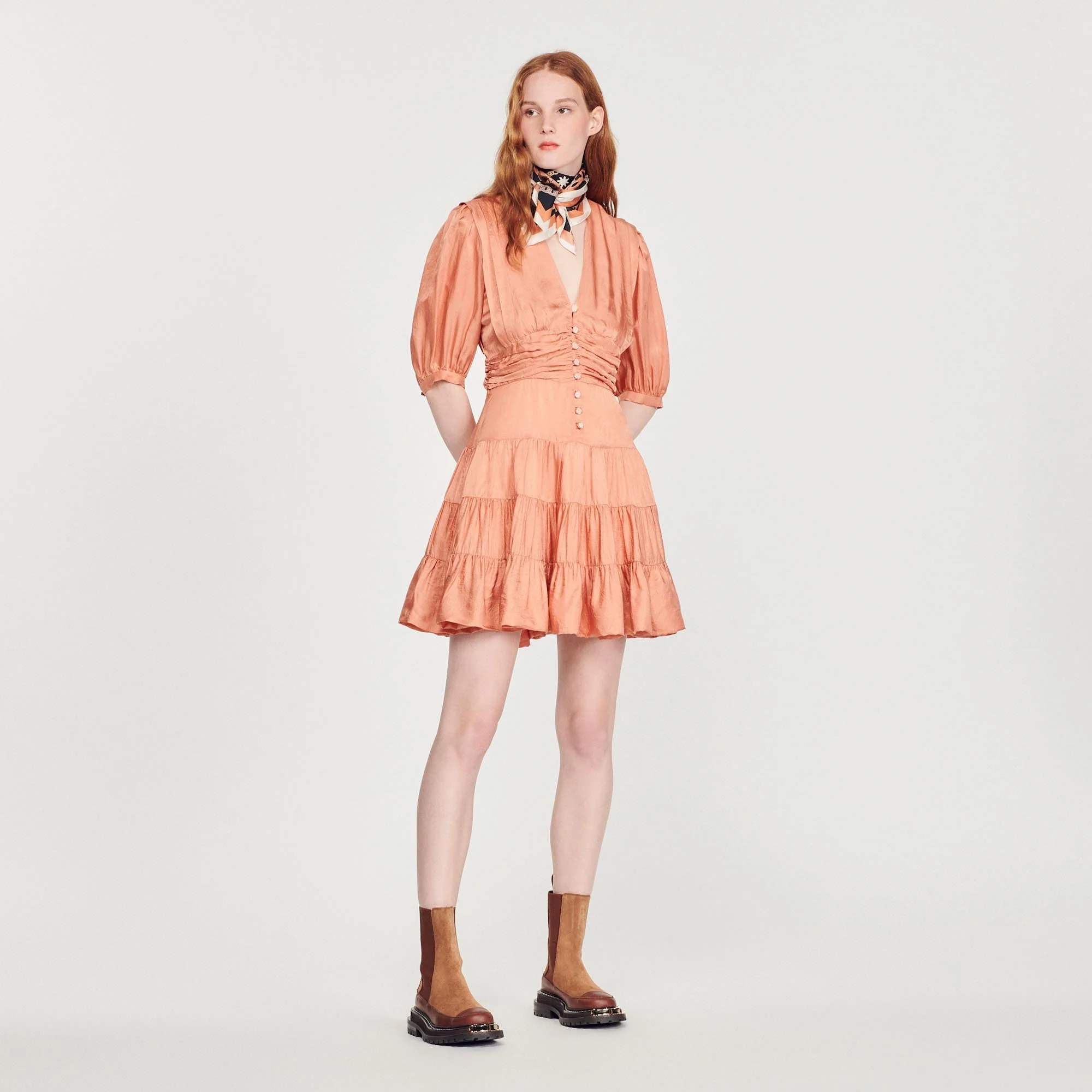 Vestido corto y fluido de manga corta abullonada y cuello en V, ligeramente satinado, con falda con bandas avolantadas.