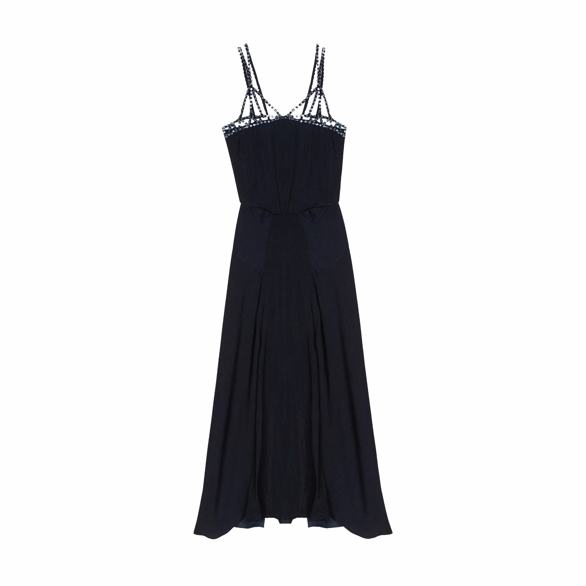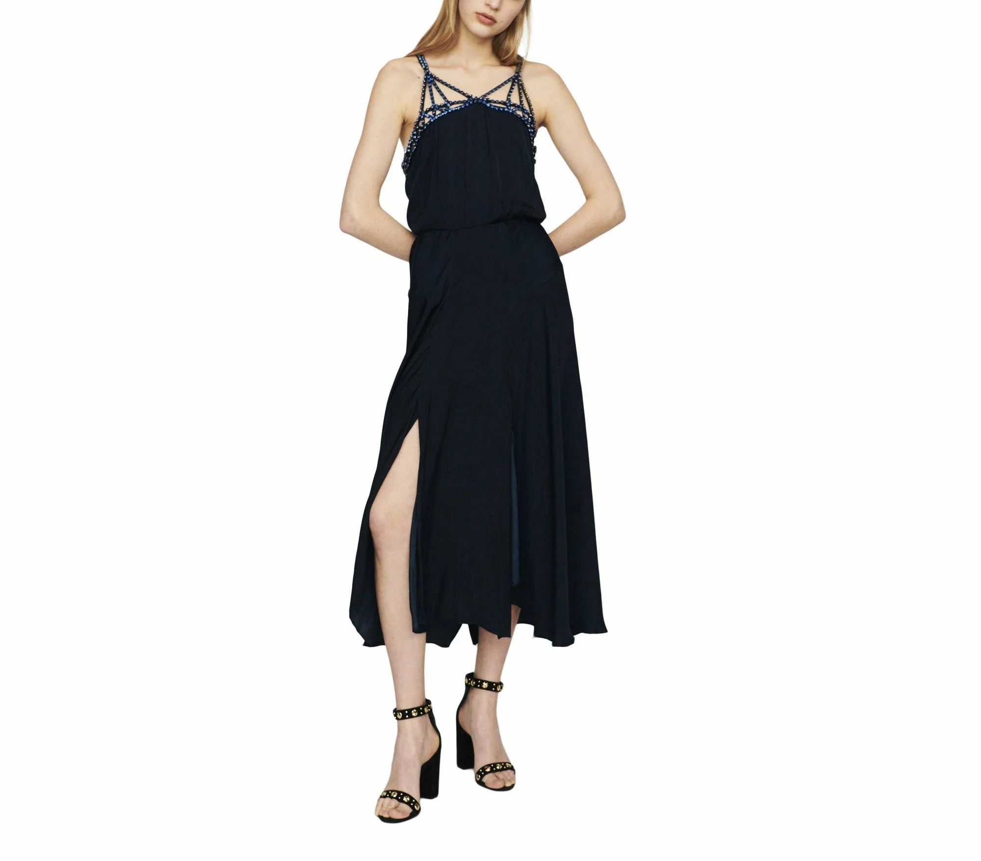 VESTIDO AZUL MARINO, MARCA MAJE. VESTIDO LARGO ENTRECRUZADO CON PEDRERIA Y TIRANTES FINOS, TEJIDO SATINADO CUELLO REDONDO, AZUL MARINO. TEJIDO PRINCIPAL:100% POLIÉSTER;.