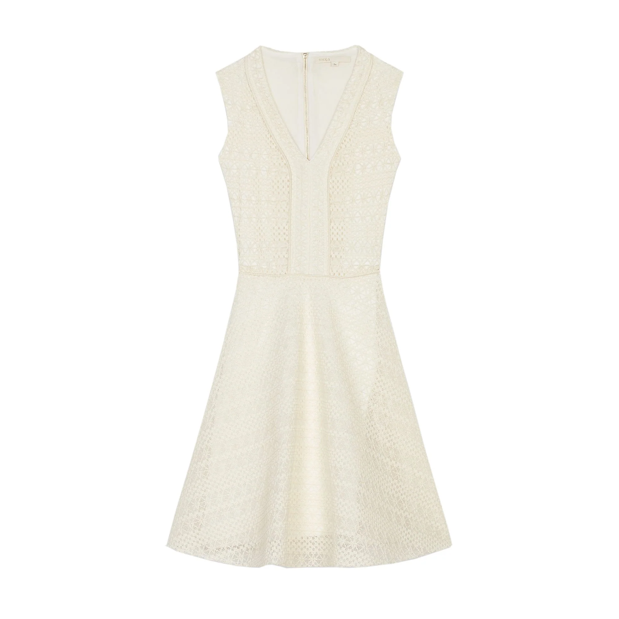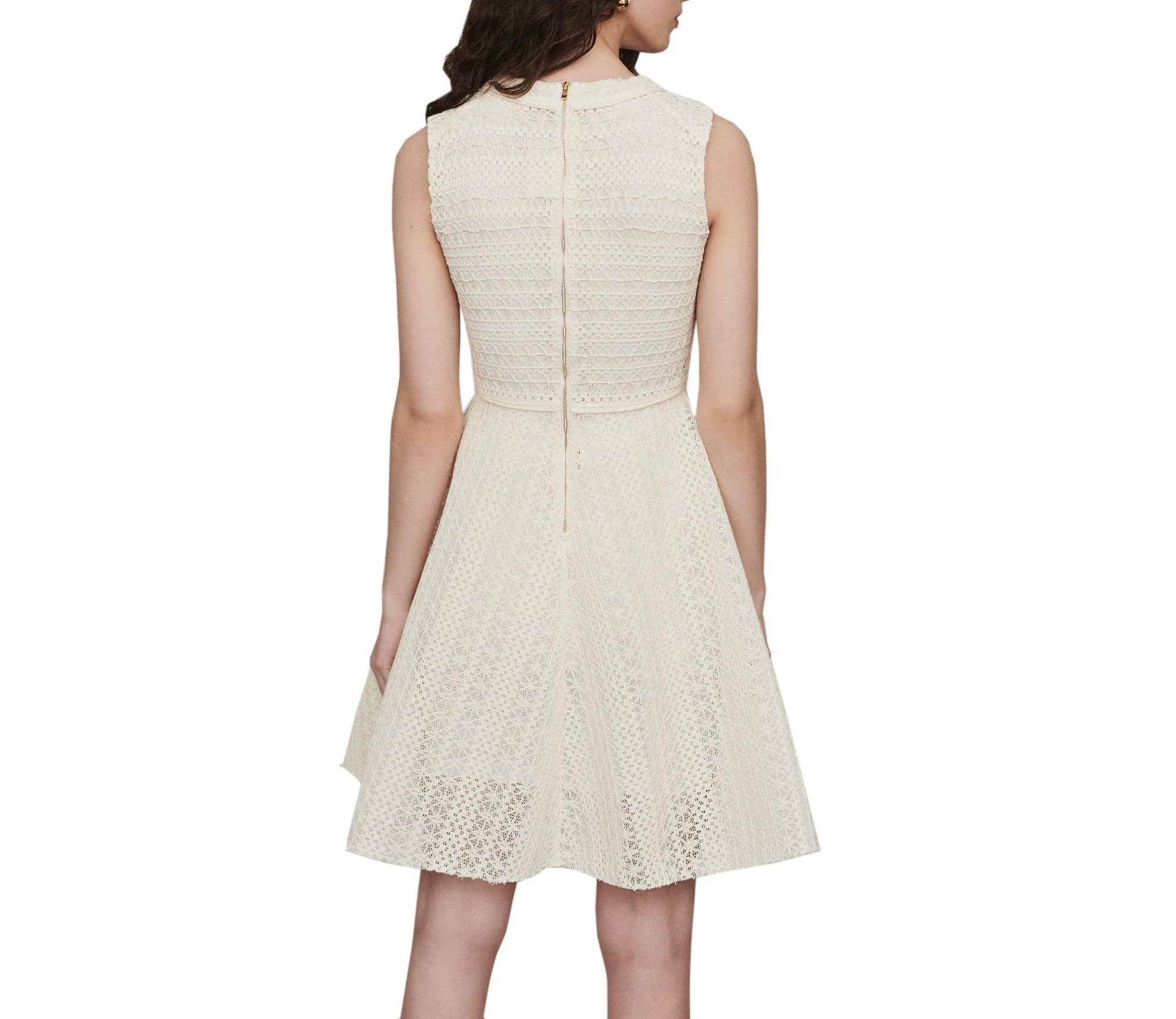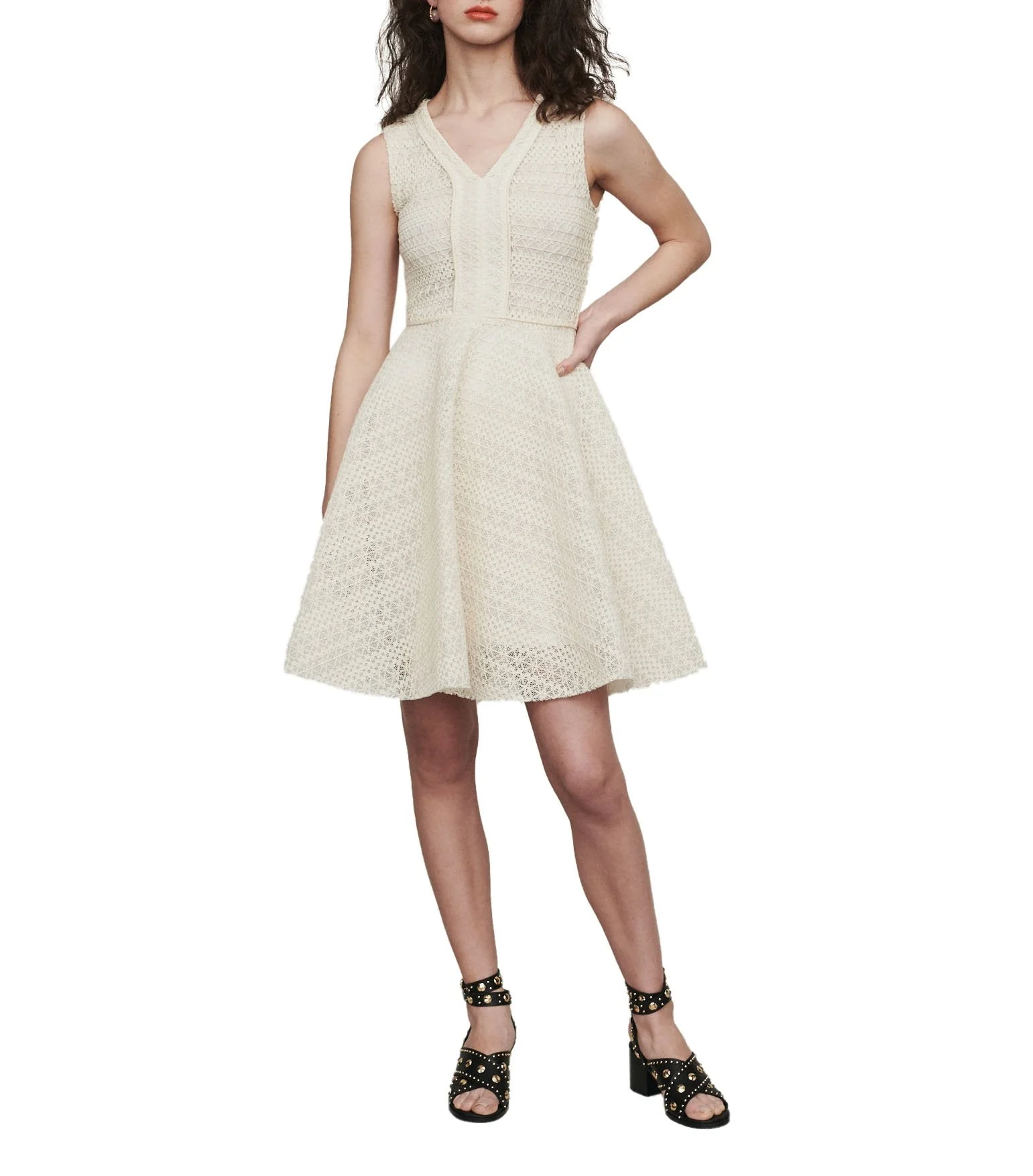 VESTIDO DE GUIPUR, CIERRE CON CREMALLERA EXPUESTA EN LA ESPALDA, CUELLO EN V, SIN MANGAS, SILUETA ESTRUCTURADA, FALDA ACAMPANADA, FORRO COMPLETO, MARCA MAJE. COMPOSICIÓN: 69% POLIÉSTER, 28% ALGODÓN, 3% ELASTANO