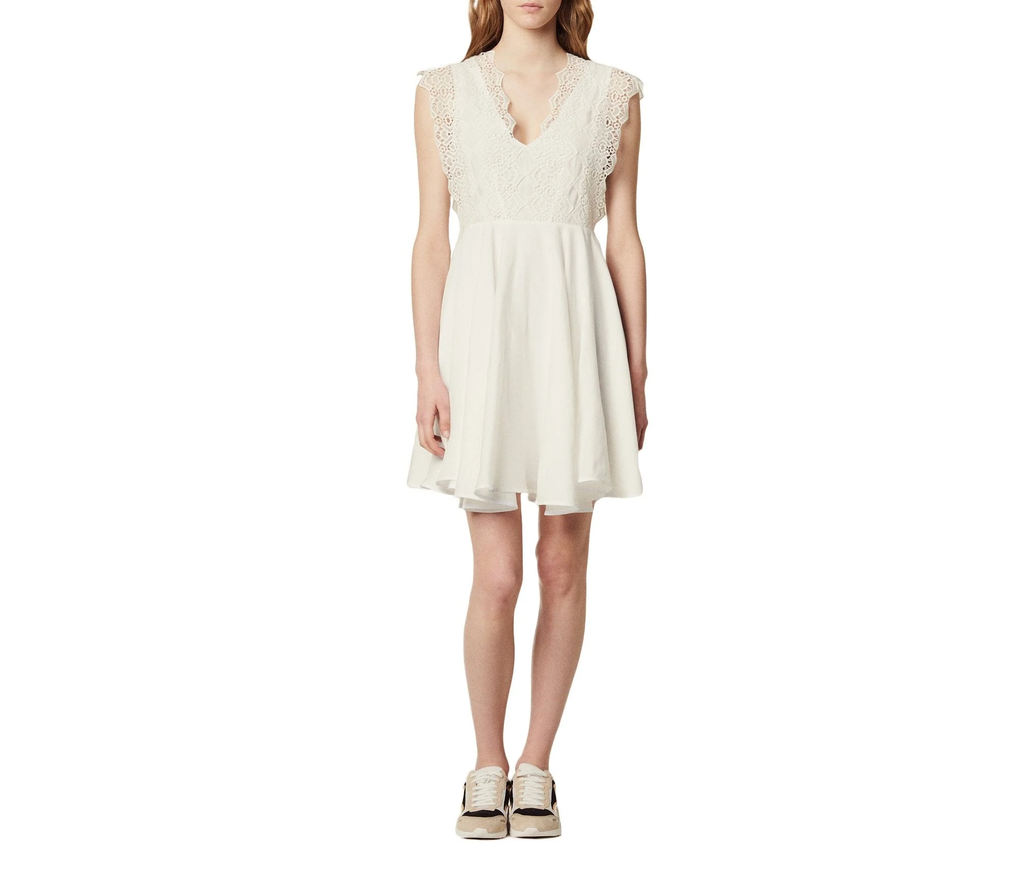 VESTIDO LISO CORTO, SIN MANGAS, PARTE SUPERIOR DE ENCAJE., MARCA SANDRO.