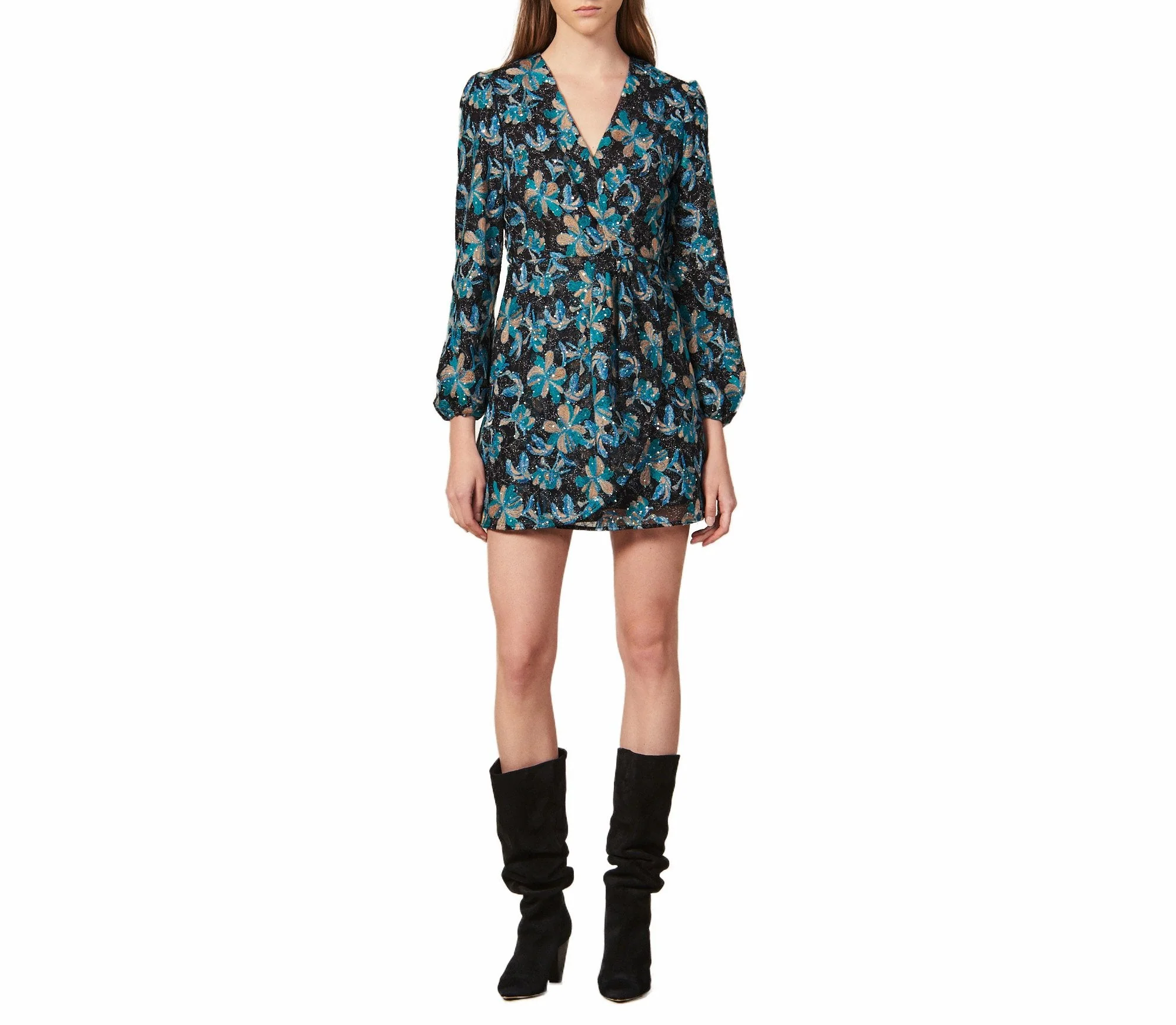VESTIDO CORTO ESTAMPADO MANGA LARGA ABOMBADA Y ESCOTE V, MARCA SANDRO. 81% POLIÉSTER 19% POLIAMIDA. LAVADO A MANDO DELICADO, SIN BLANQUEADOR, NO SECADORA. REVISAR ETIQUETA INTERNA DE LAVADO PARA MÁS INFORMACIÓN.