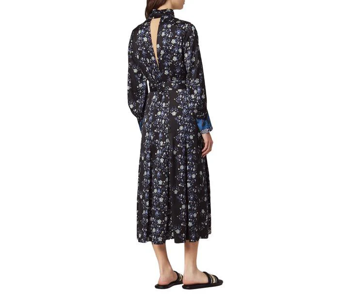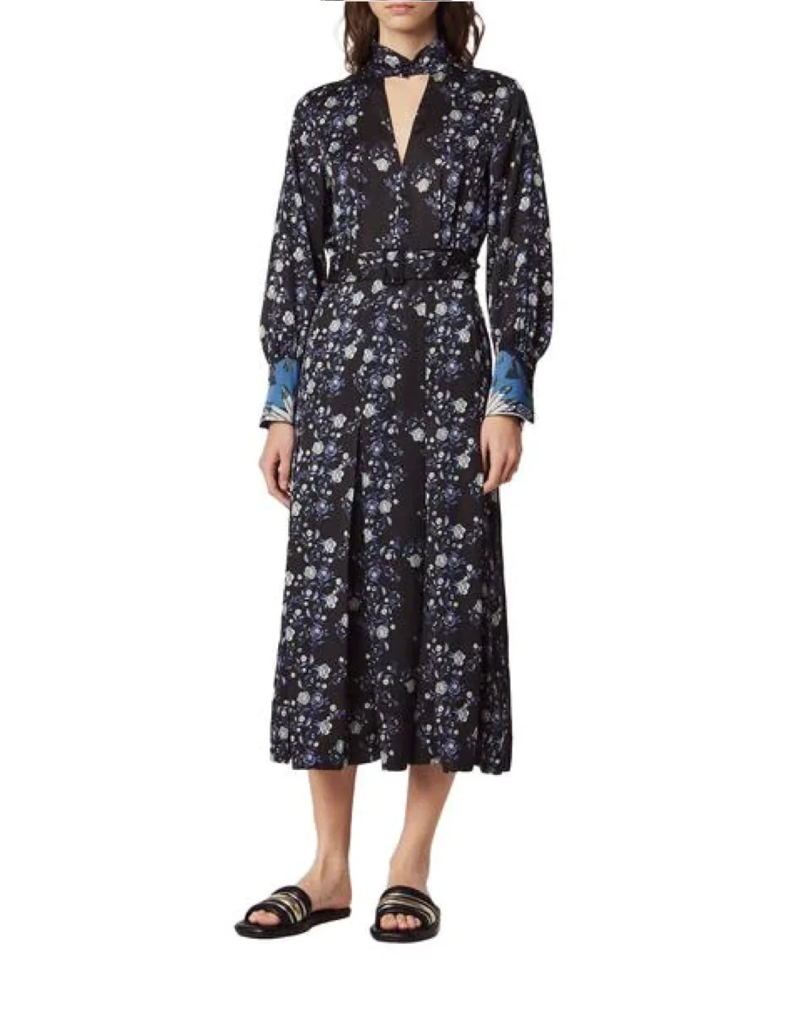 VESTIDO ESTAMPADO MANGA LARGA Y ESCOTE V, MARCA SANDRO. 100% POLIÉSTER. LAVADO A MANDO DELICADO, SIN BLANQUEADOR, NO SECADORA. REVISAR ETIQUETA INTERNA DE LAVADO PARA MÁS INFORMACIÓN.