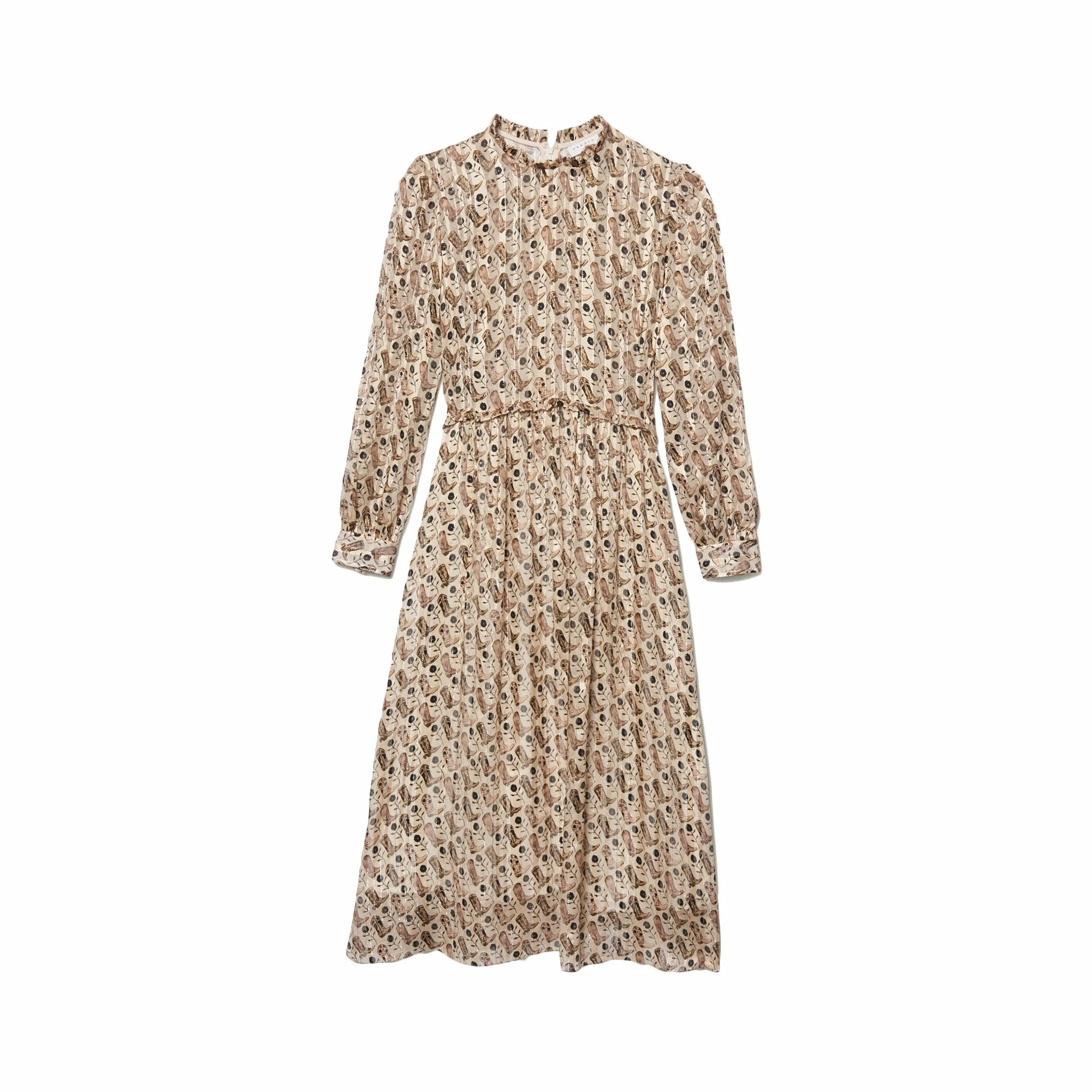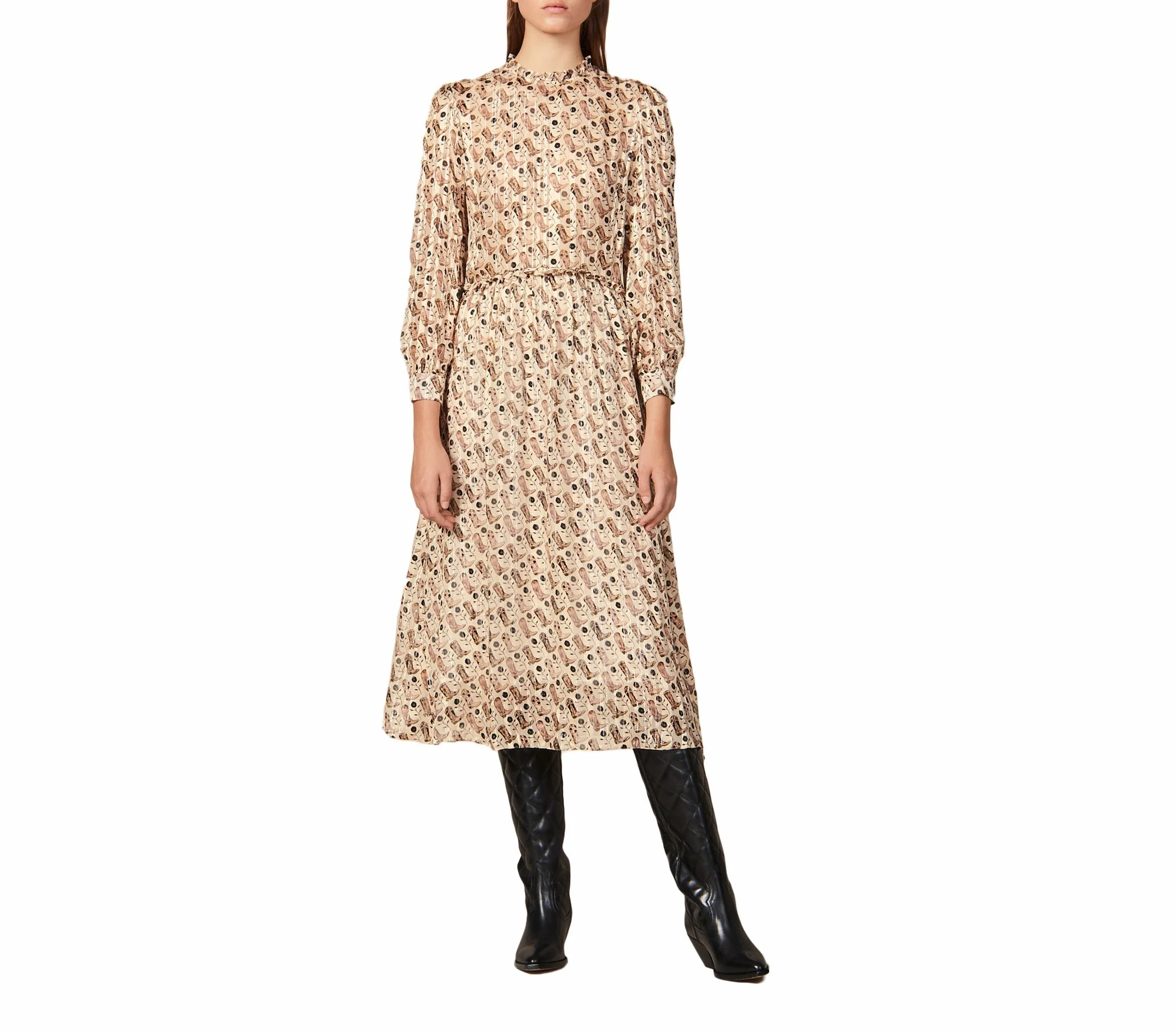 VESTIDO LARGO ESTAMPADO MANGA LARGA, CON CORTE EN CINTURA, MARCA SANDRO. COMPOSICIÓN:53% SEDA 44% VISCOSA 3% FIBRAS METÁLICAS. INSTRUCCIONES DE LAVADO: LIMPIEZA EN SECO PROFESIONAL. REVISAR ETIQUETA INTERNA DE LAVADO PARA MÁS INFORMACIÓN..
