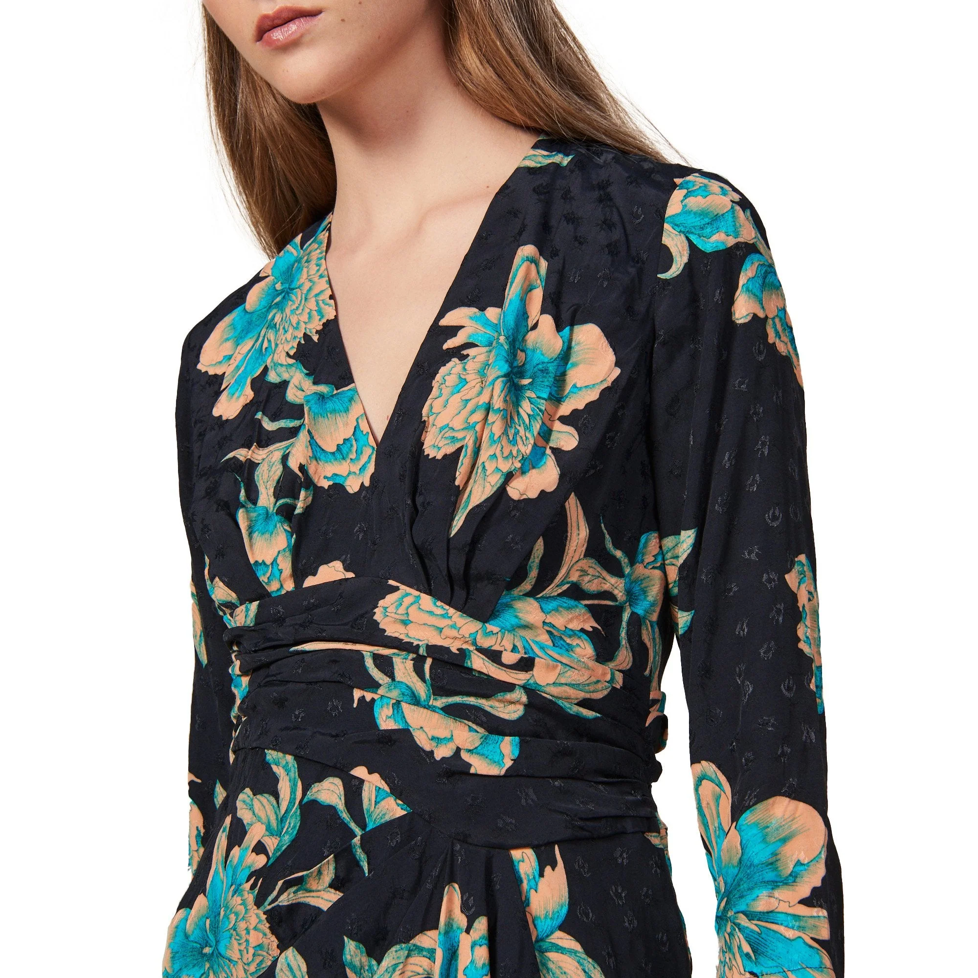 Vestido Corto Estampado, Manga Larga Y Drapeado Frontal. 100% Viscosa. Limpieza En Seco Profesional. Revisar Etiqueta Interna De Lavado Para MáS Información.