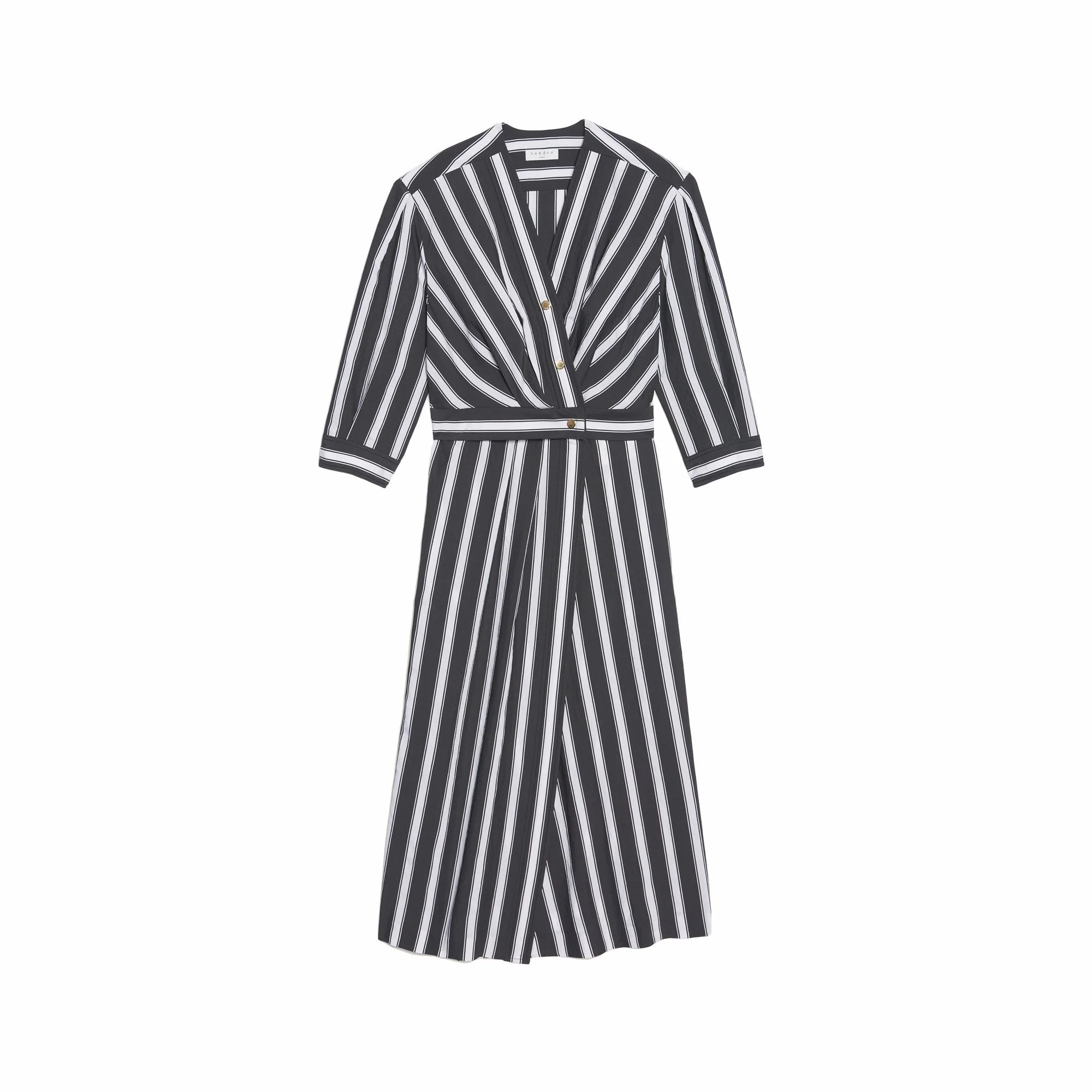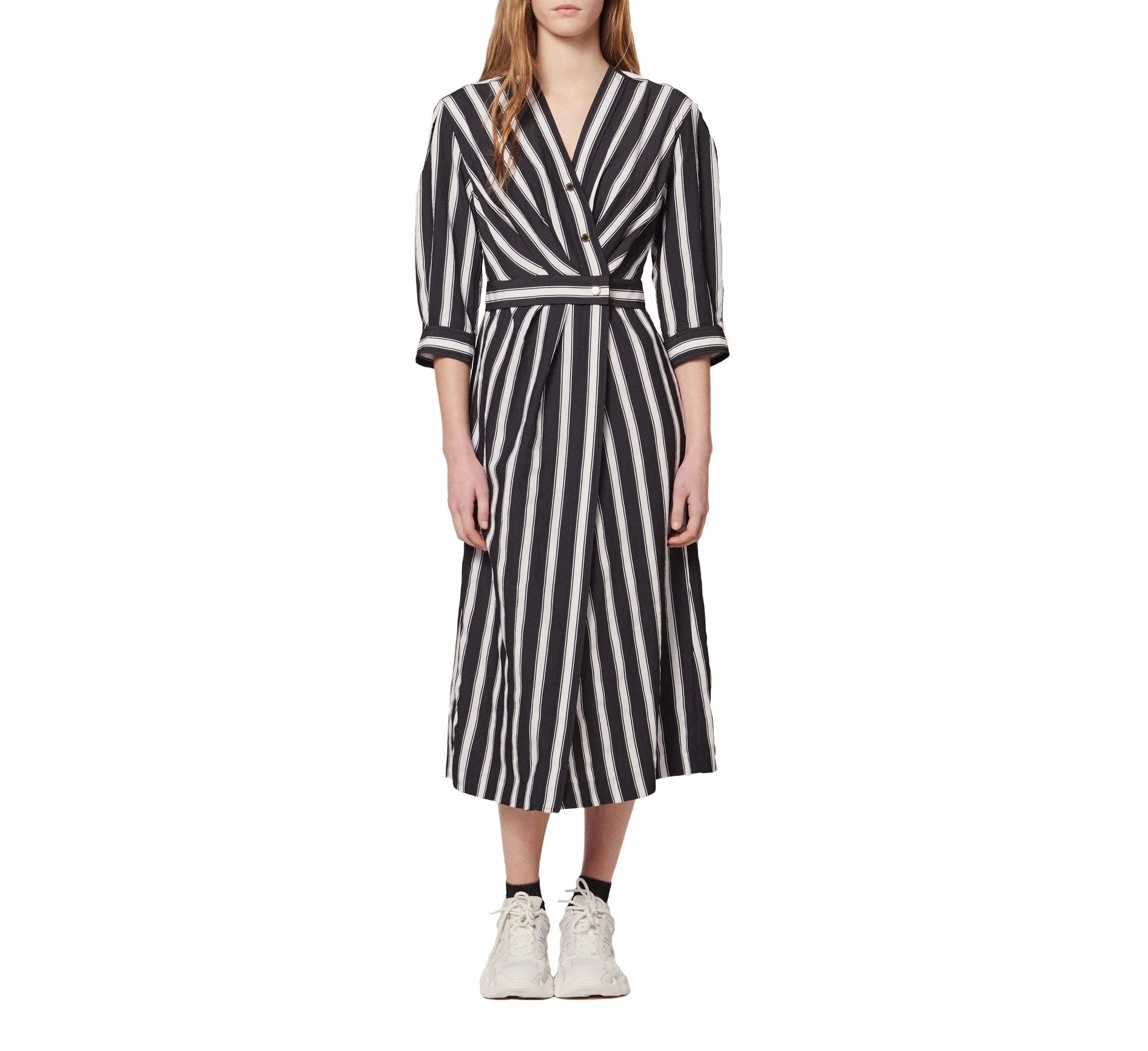 Vestido Largo A Rayas Manga 3/4 Y Escote V, Marca Sandro. Consultar Composición E Instrucciones De Lavado En Etiqueta Interna.