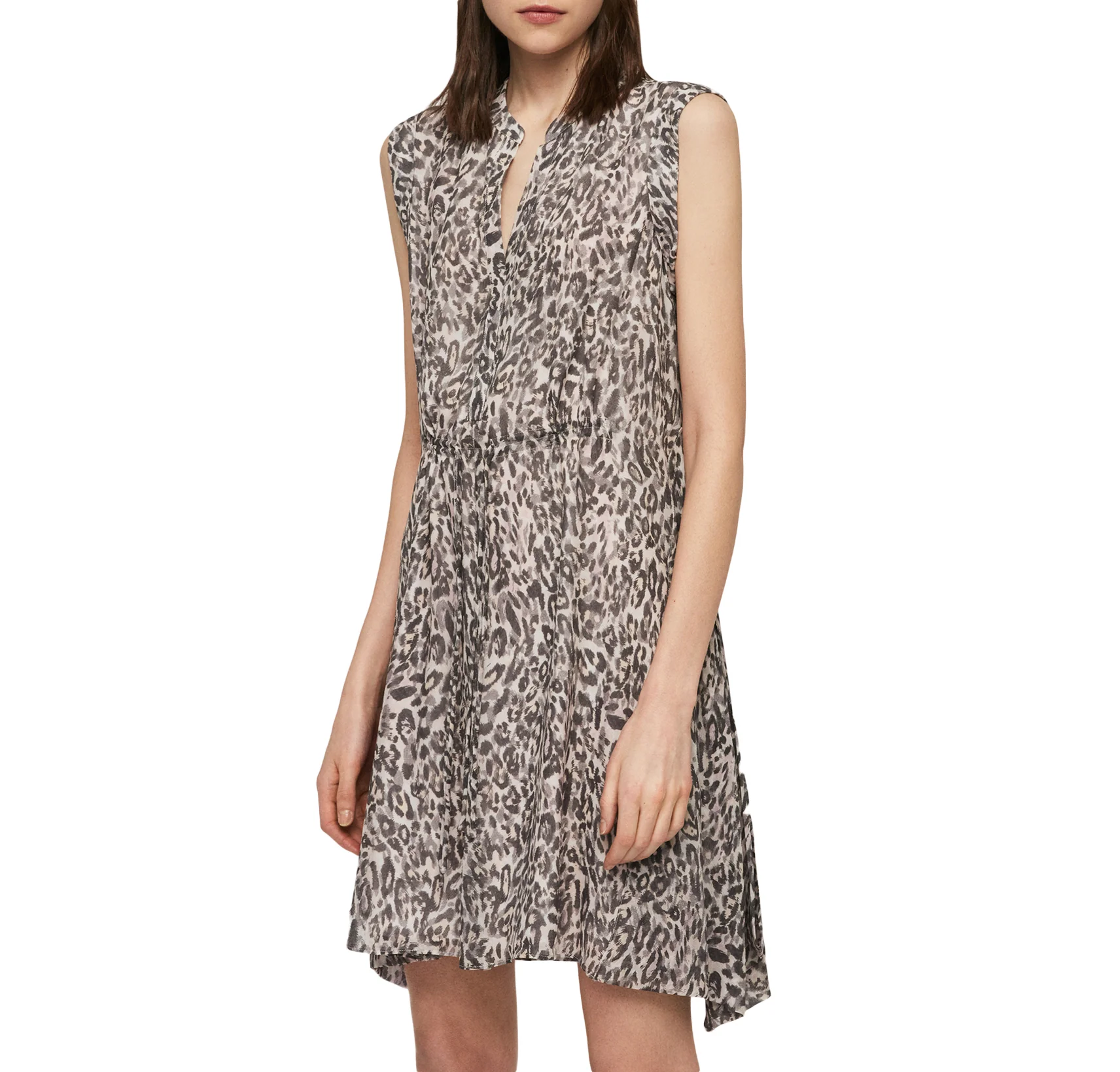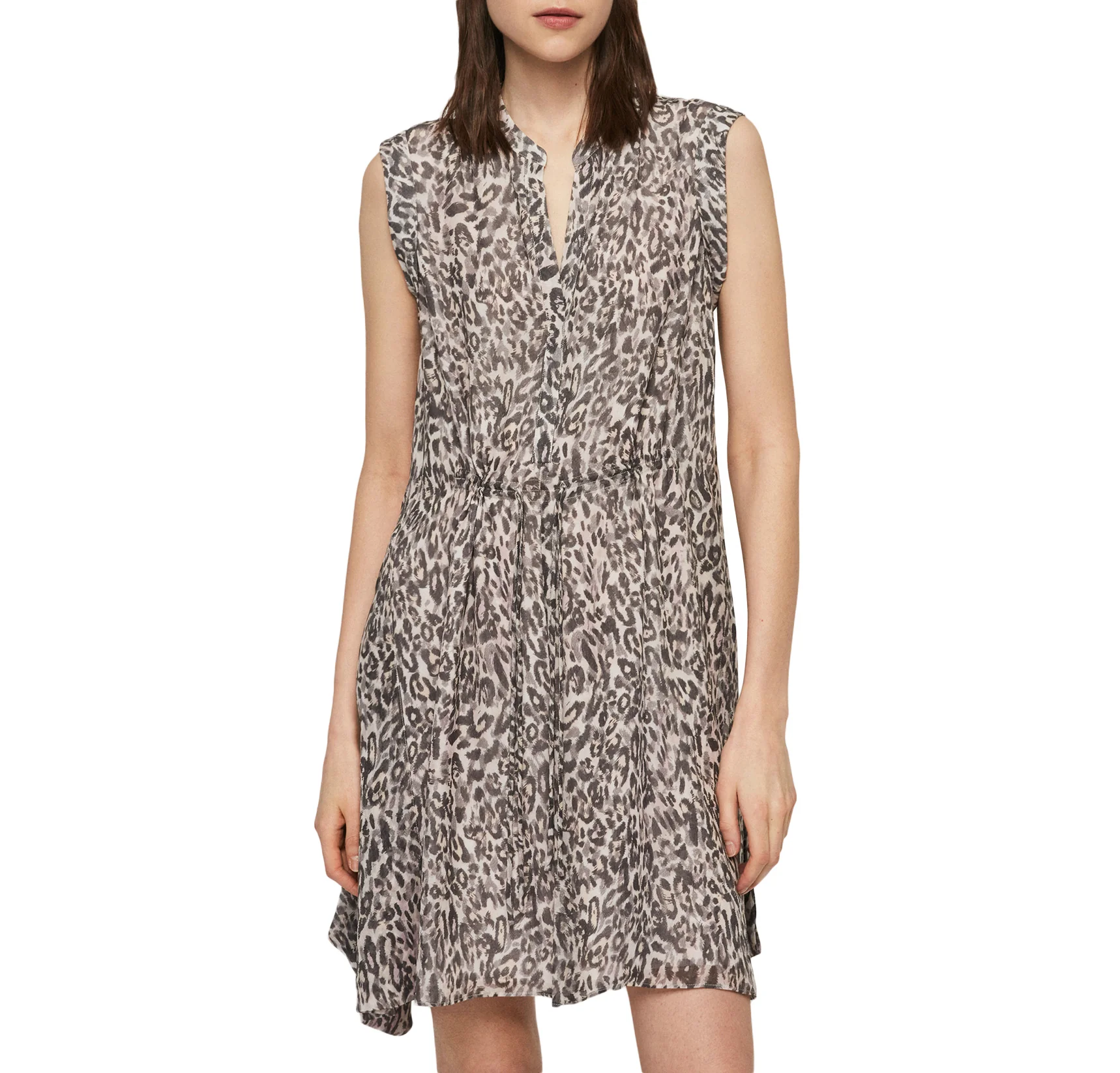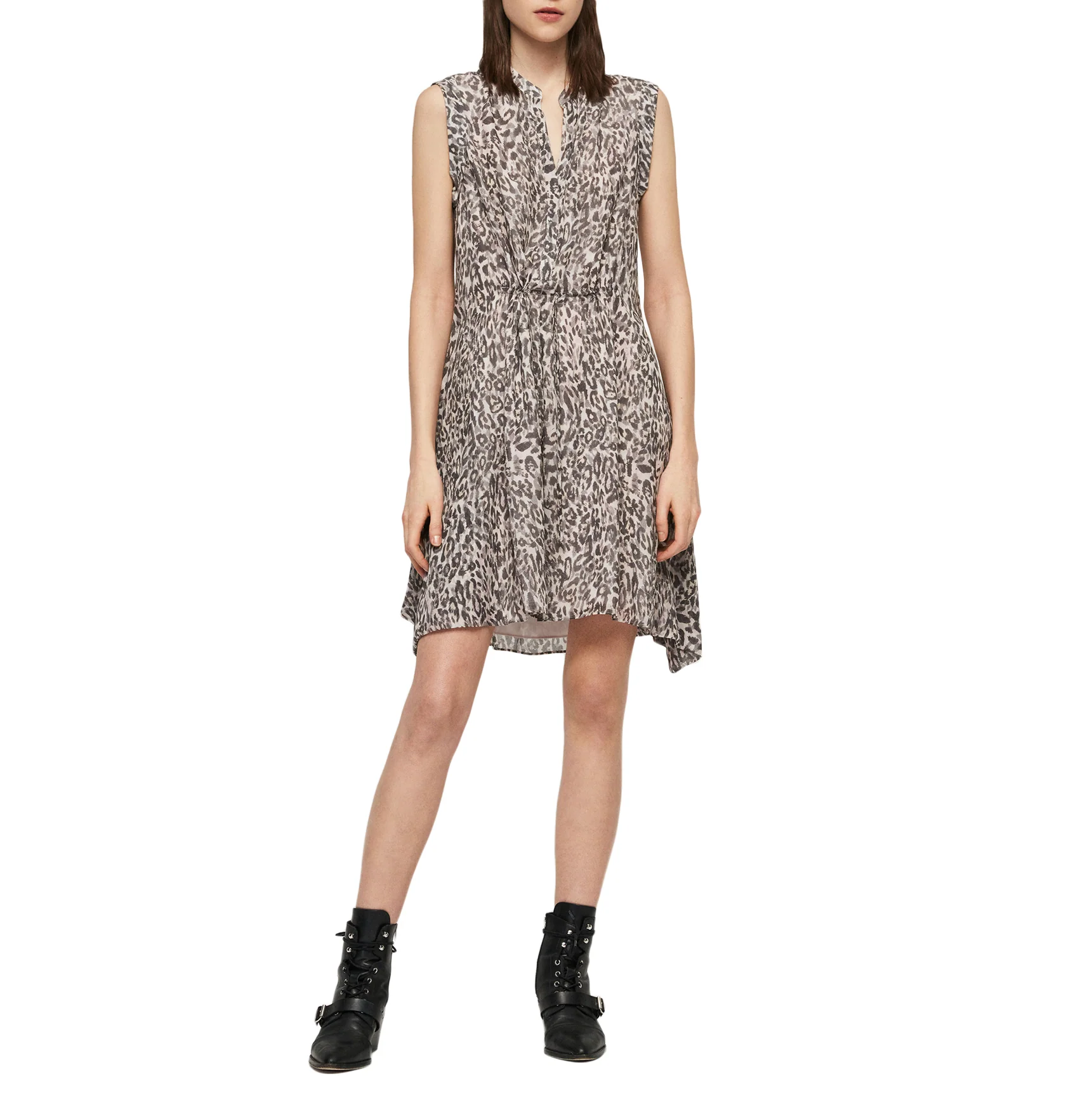 VESTIDO CLARI KARA, MARCA ALLSAINTS. VESTIDO CORTE HOLGADO ESCOTE EN V, MANGA CORTA CON CORDON AUTOAJUSTABLE, ROSA CLARO CON ESTAMPADO PRINT.