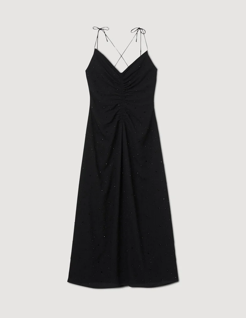 Vestido largo de tirantes finos cruzados y anudados en la parte trasera con falda evasé, sublimado con un gran escote fruncido y strass en toda la prenda.• Vestido largo Sandro de mujer