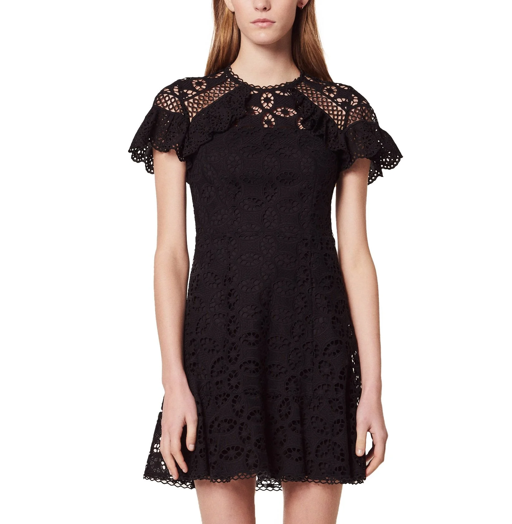 VESTIDO CORTO EN TIRA BORDADA, MANGA CORTA, MARCA SANDRO. 100% ALGODÓN. LAVADO A MANDO DELICADO, SIN BLANQUEADOR, NO SECADORA. REVISAR ETIQUETA INTERNA DE LAVADO PARA MÁS INFORMACIÓN.