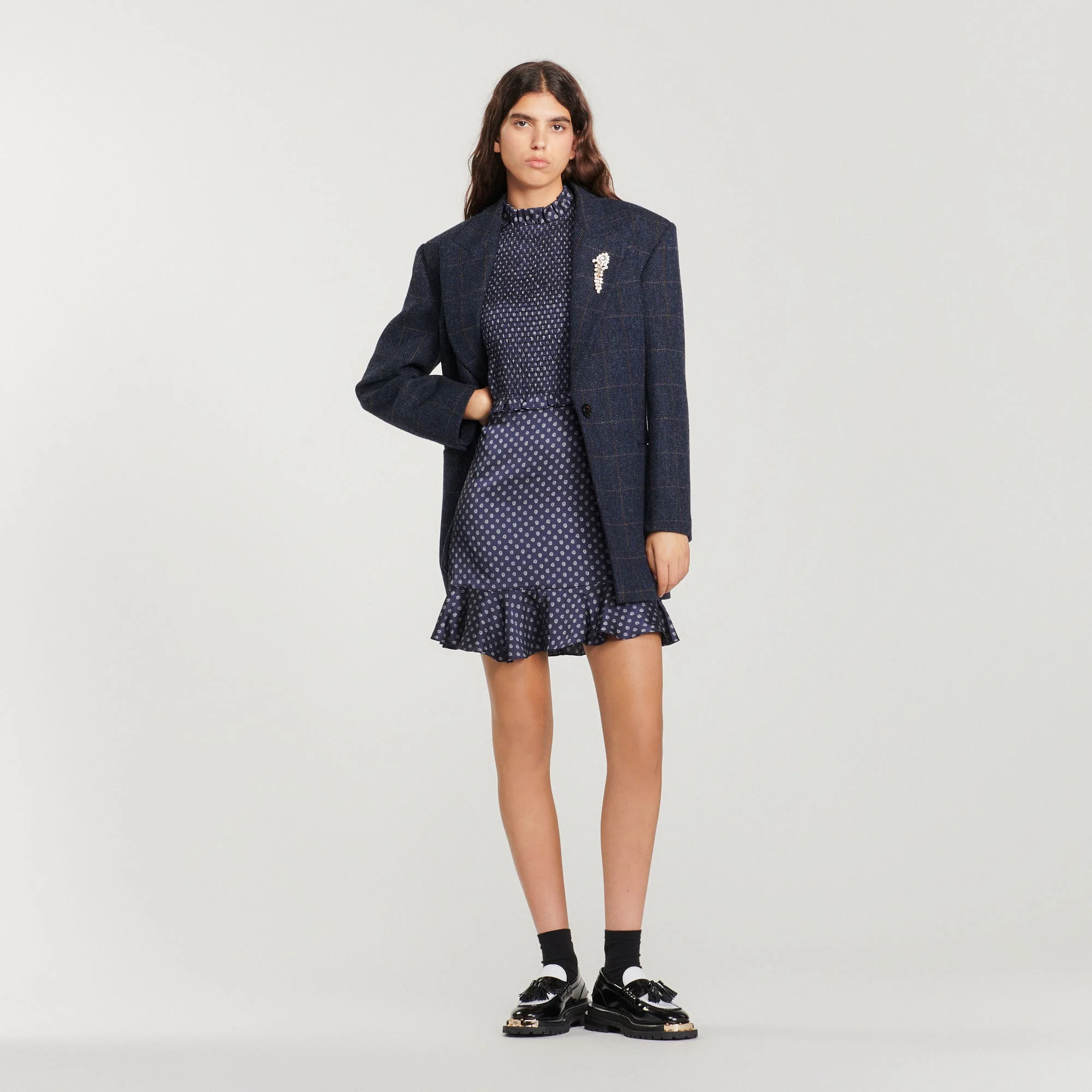Vestido corto fluido y fruncido, de manga corta voluminosa y cuello alto, con falda avolantada, sublimado con un estampado de lunares.