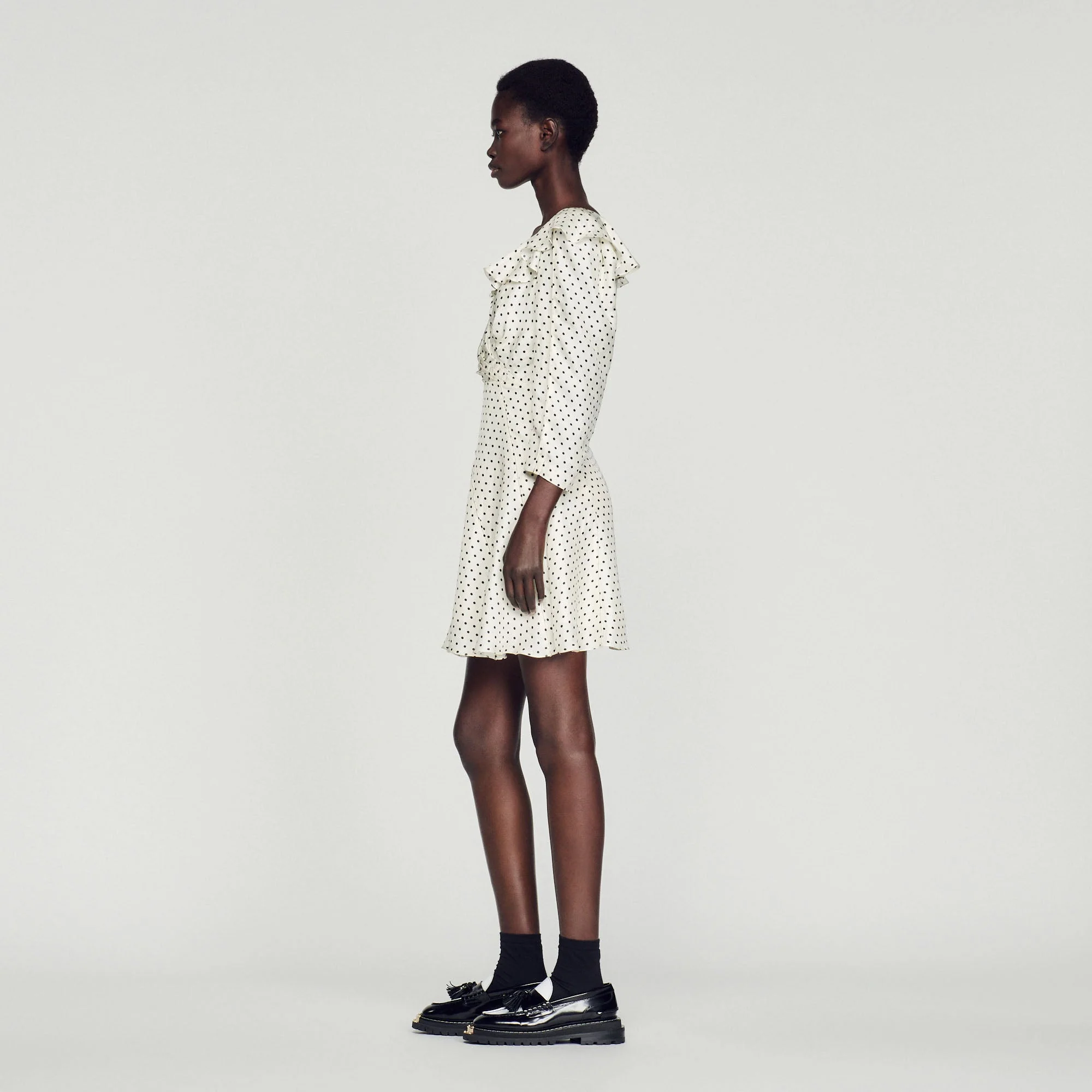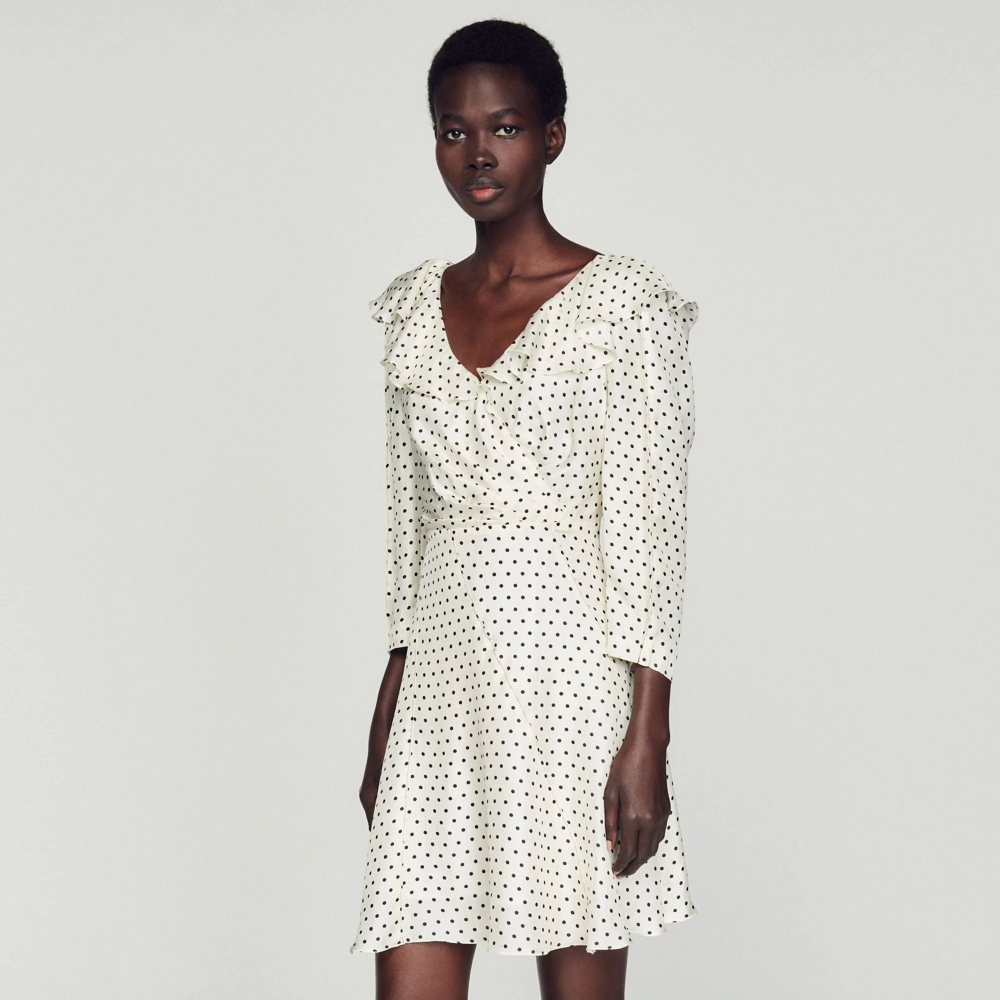 Vestido corto fluido de manga larga y escote y falda avolantados, sublimado con un estampado de lunares en contraste.• Vestido corto fluido Sandro de mujer