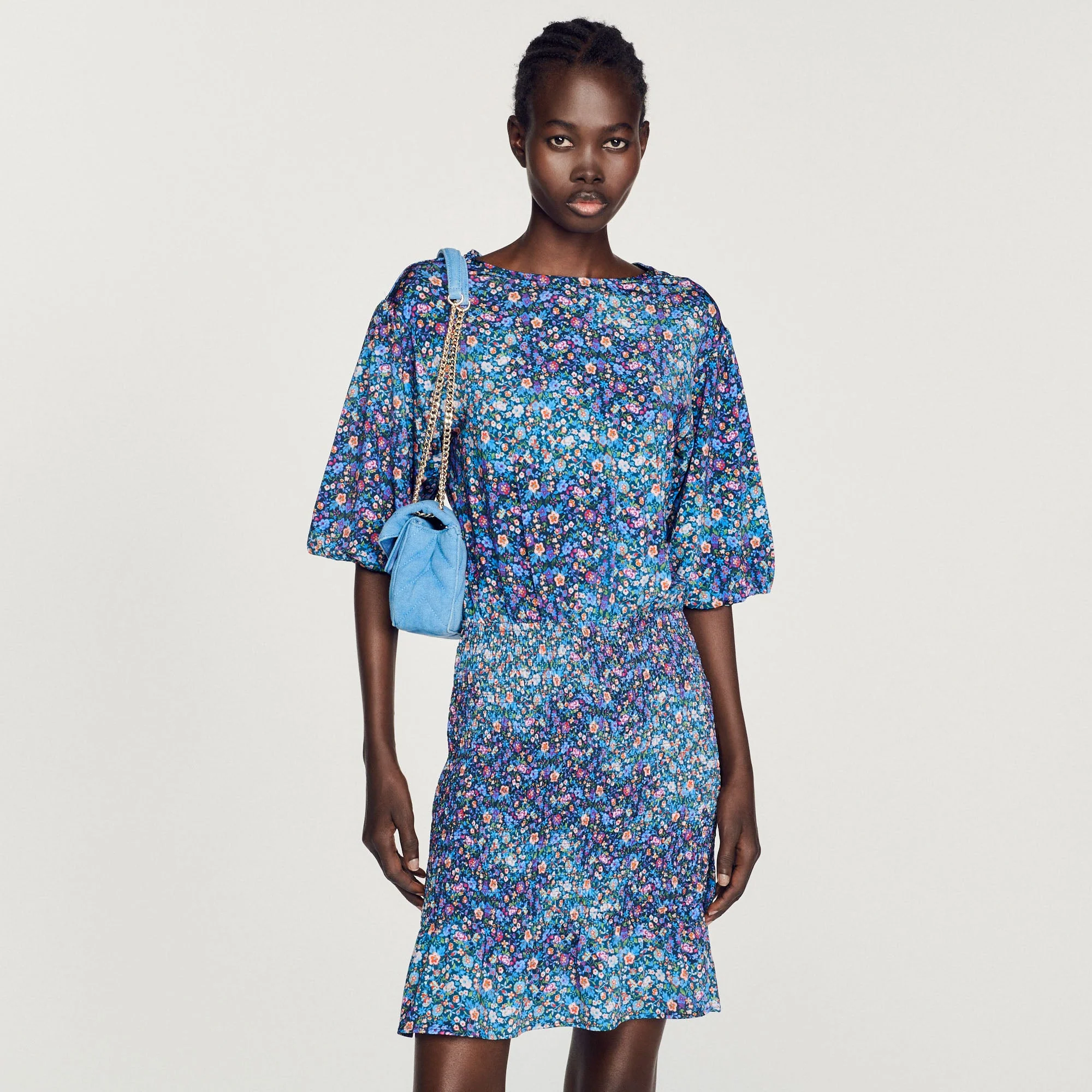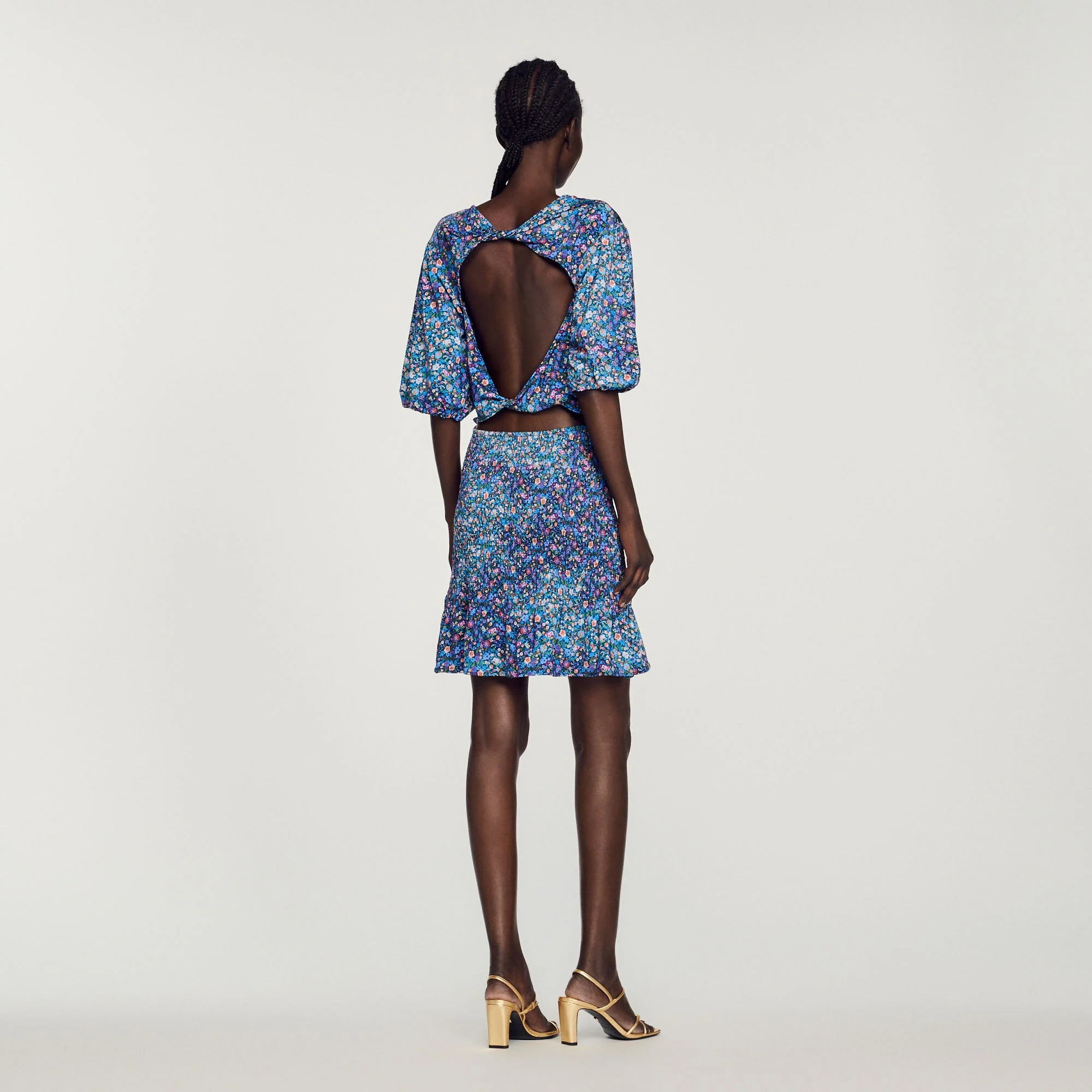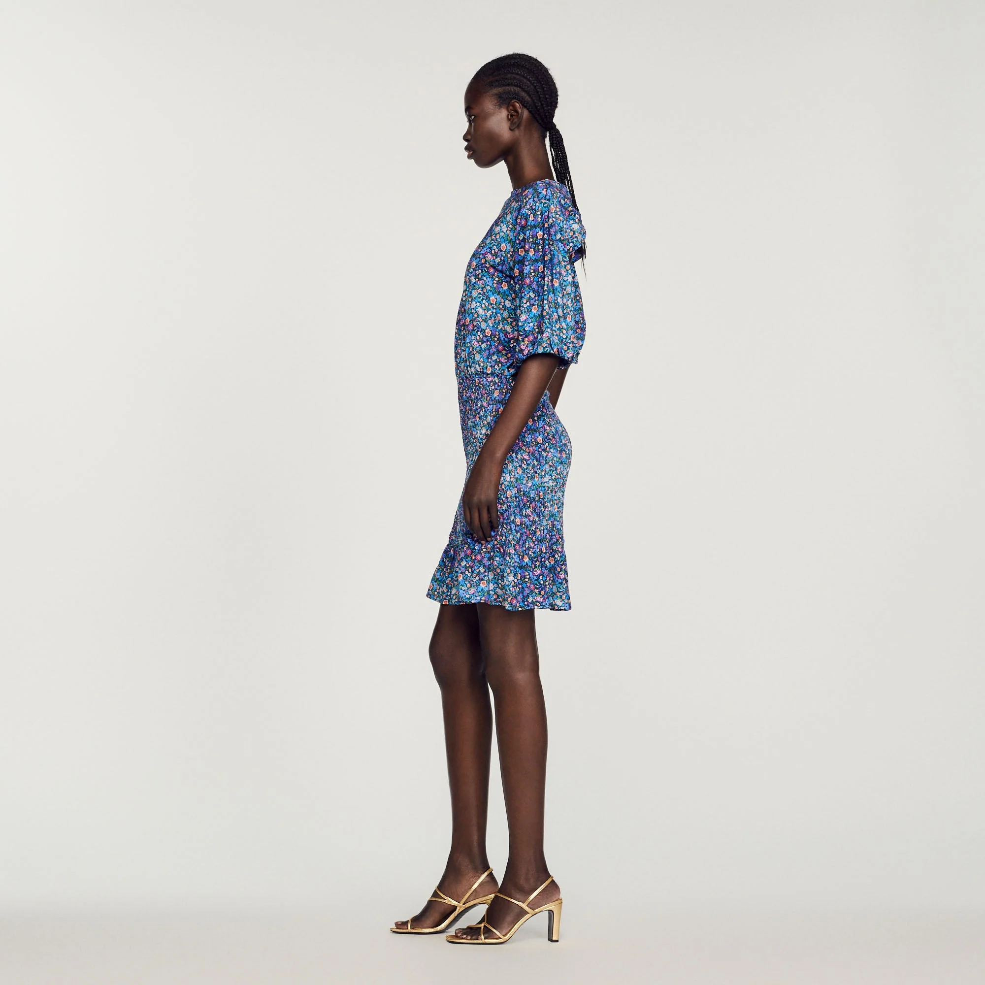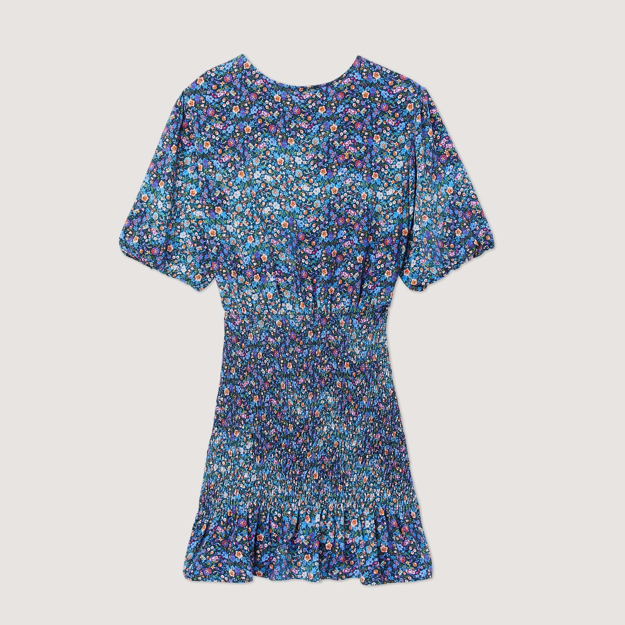 Vestido corto de cuello redondo, manga corta elástica, cintura fruncida, falda con volantes y estampado floral.• Sandro Vestido corto mujer