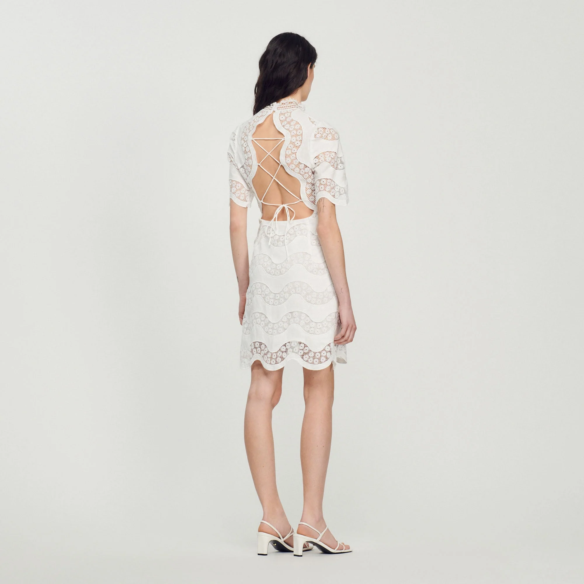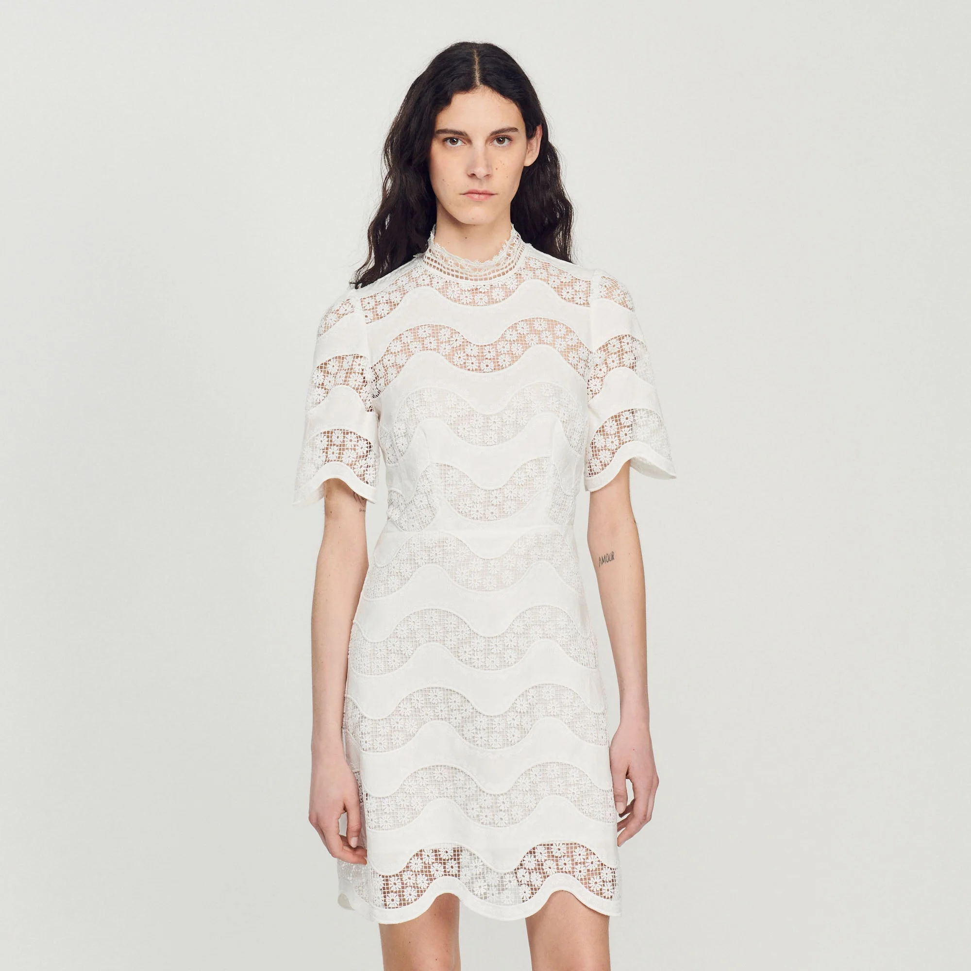 Vestido corto de manga corta y cuello alto de guipur calado, sublimado con bordados de flores y motivos de olas, con parte trasera con lazada y acabados festoneados.• Vestido corto Sandro de mujer