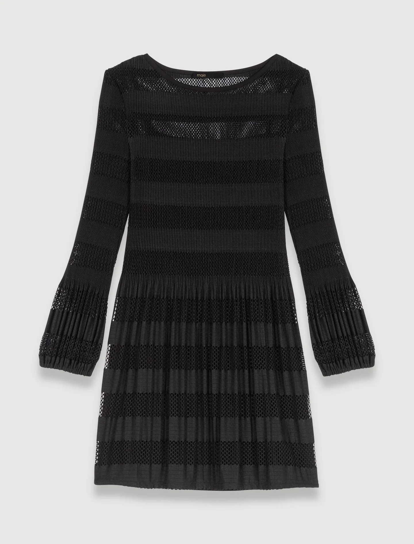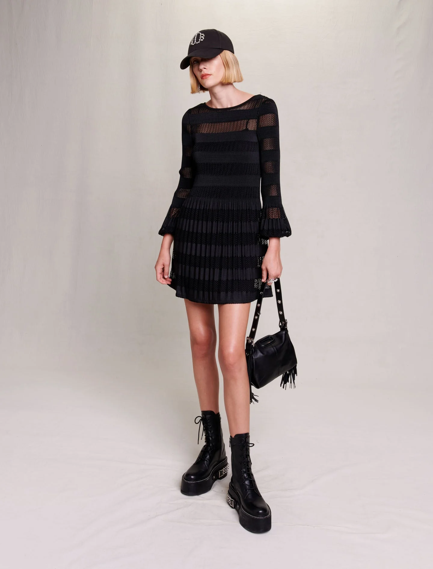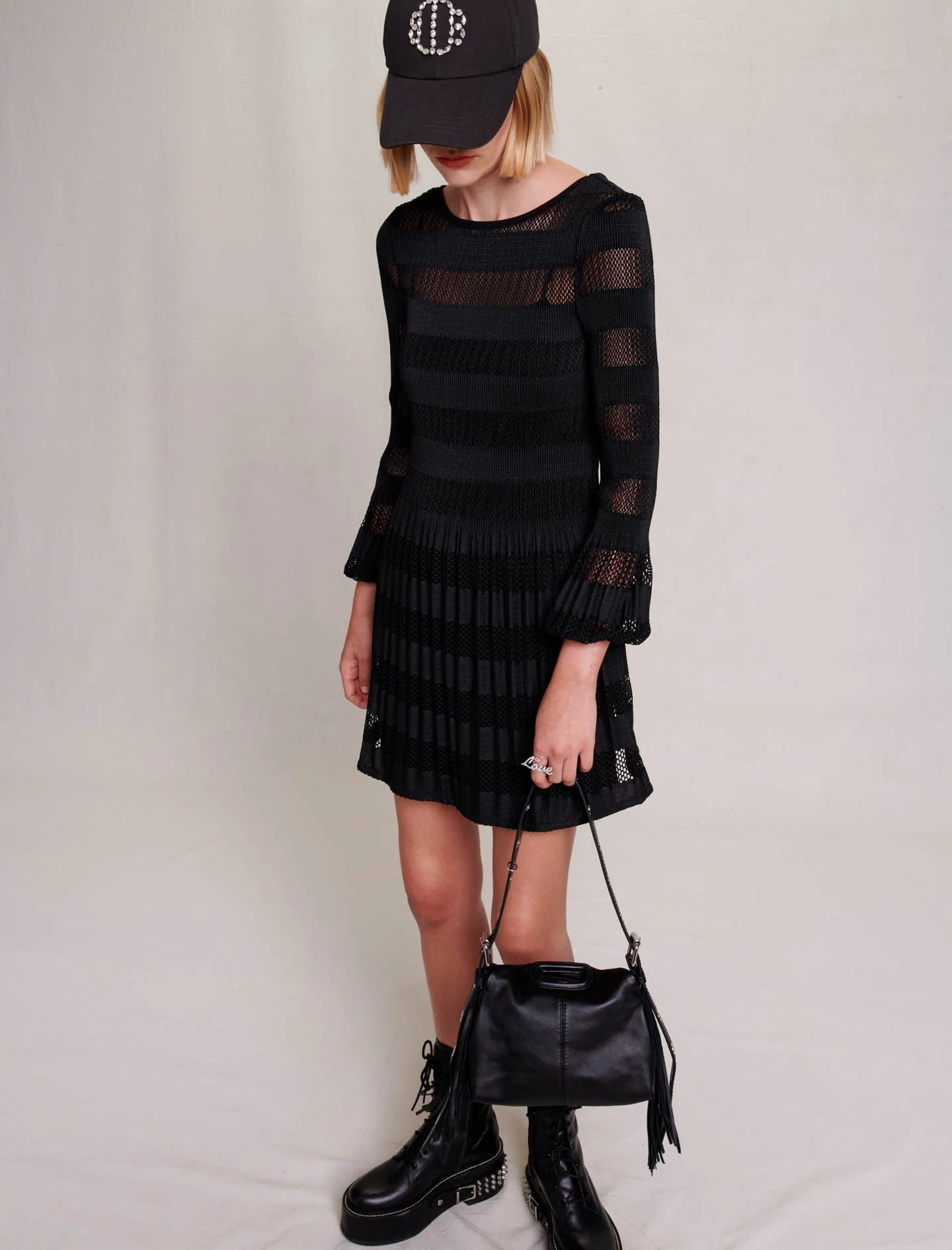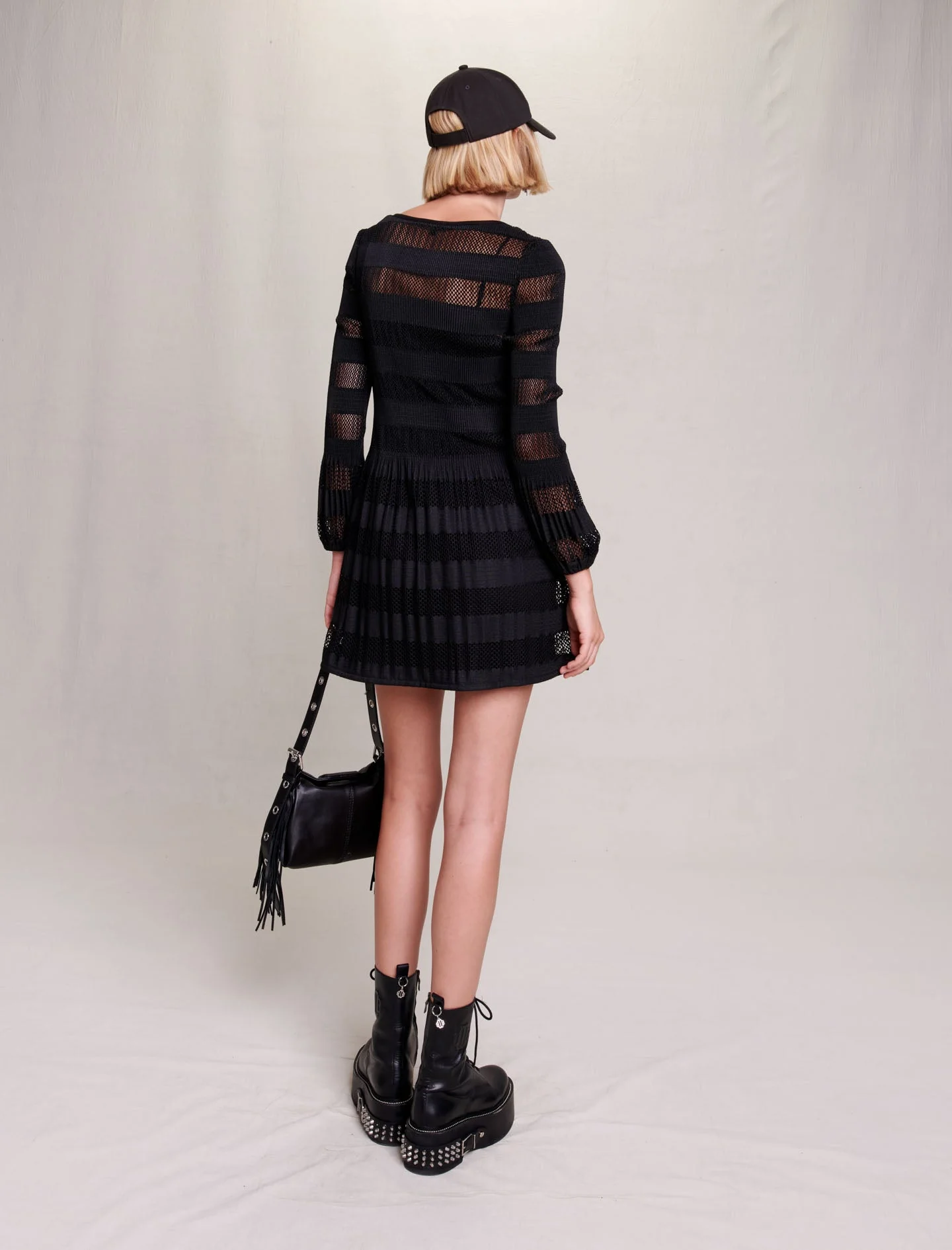 Inspirándose en la elegancia británica de los años 90, el estudio reinterpreta las prendas de punto con detalles atrevidos para crear siluetas sofisticadas y sexis.Este vestido corto y recto, de punto calado efecto malla, presenta un juego de líneas y transparencias que dejan entrever sutilmente la piel. Combinación desmontable, cuello redondo, mangas largas y puños ligeramente abombados.Con un look sexi y reafirmado, crea una silueta estructurada gracias a una falda plisada y voluminosa con una caída fluida y ligera.Elegante y desenfadado a la vez, combínelo con una gorra, un bolso exclusivo y botines de plataforma decorados con tachuelas.Ref.: MFPRO03280