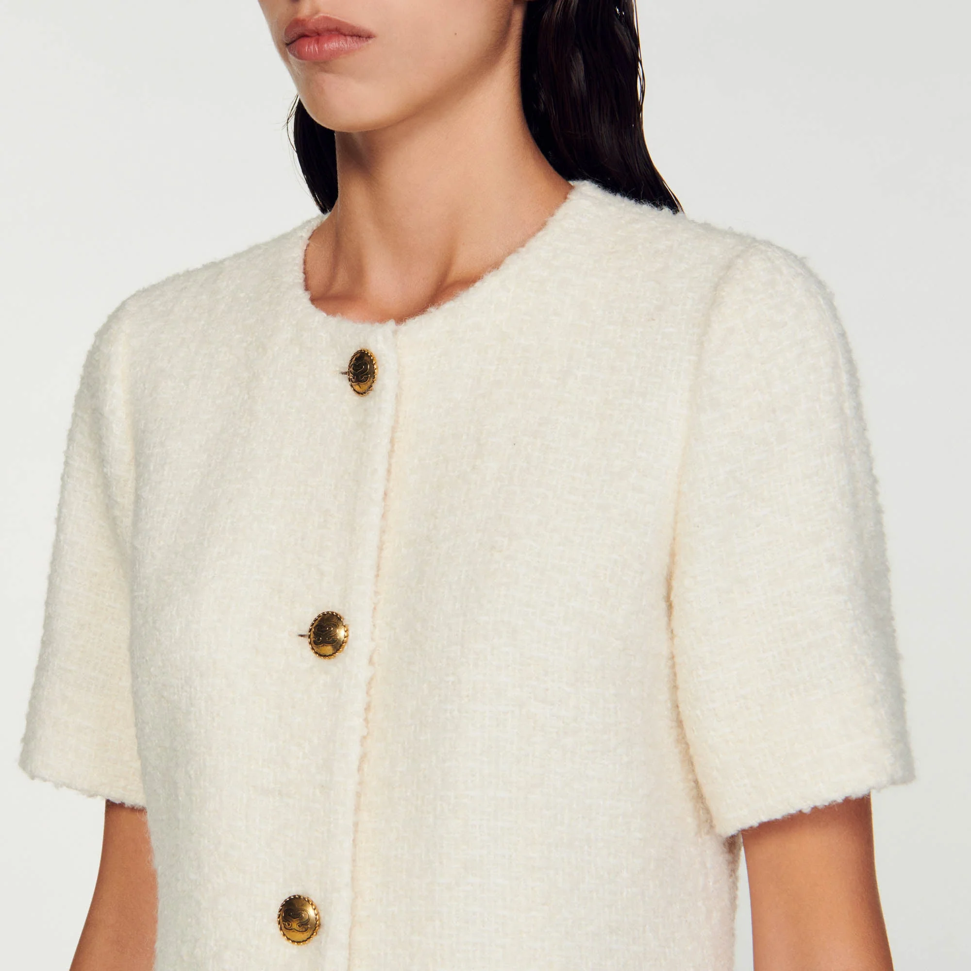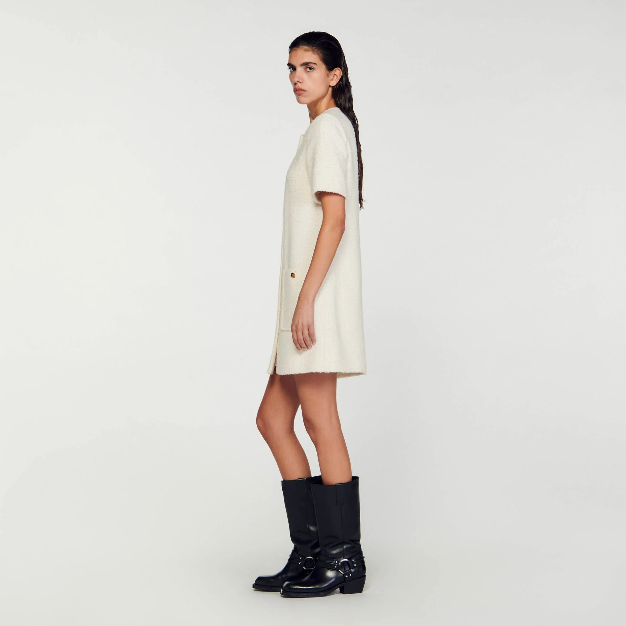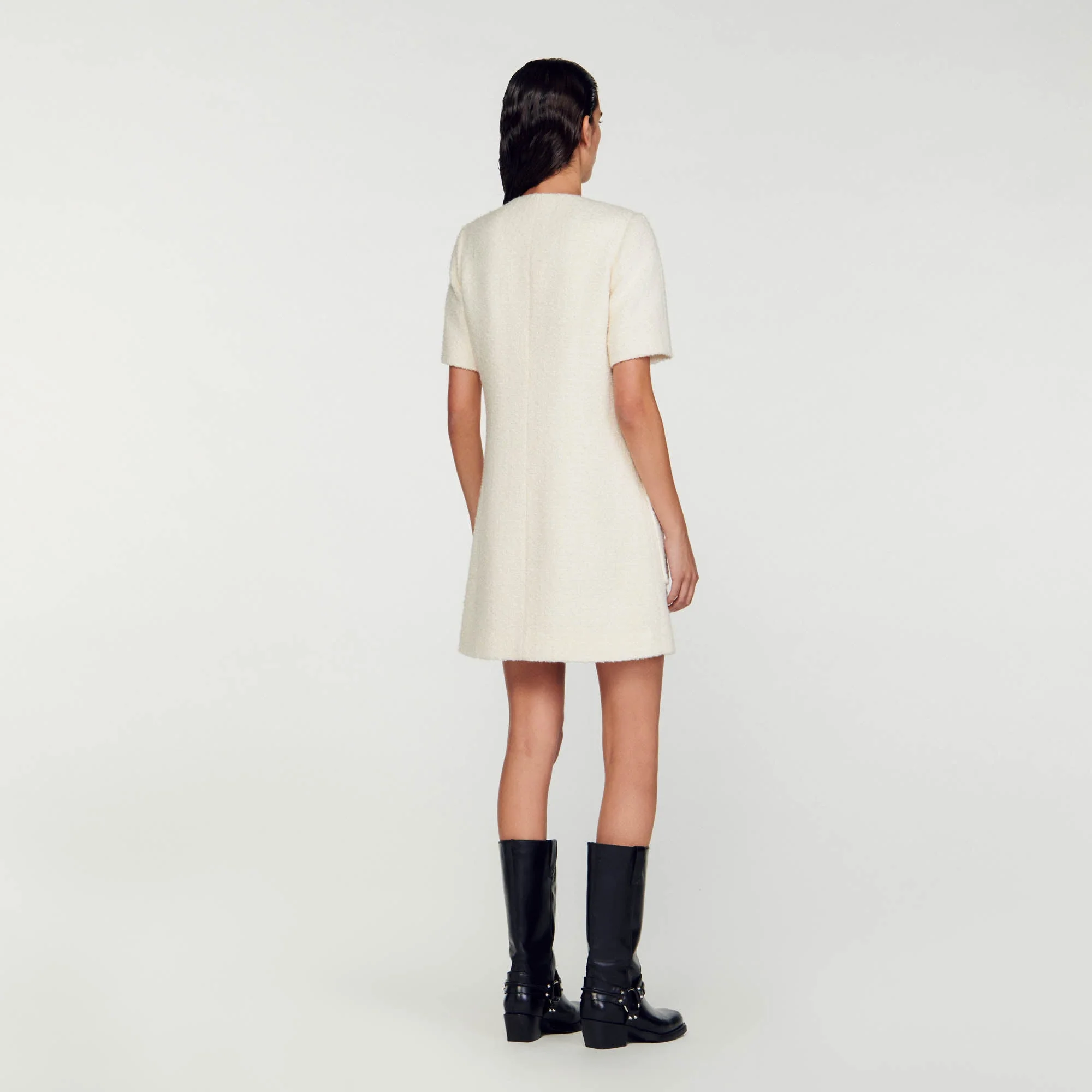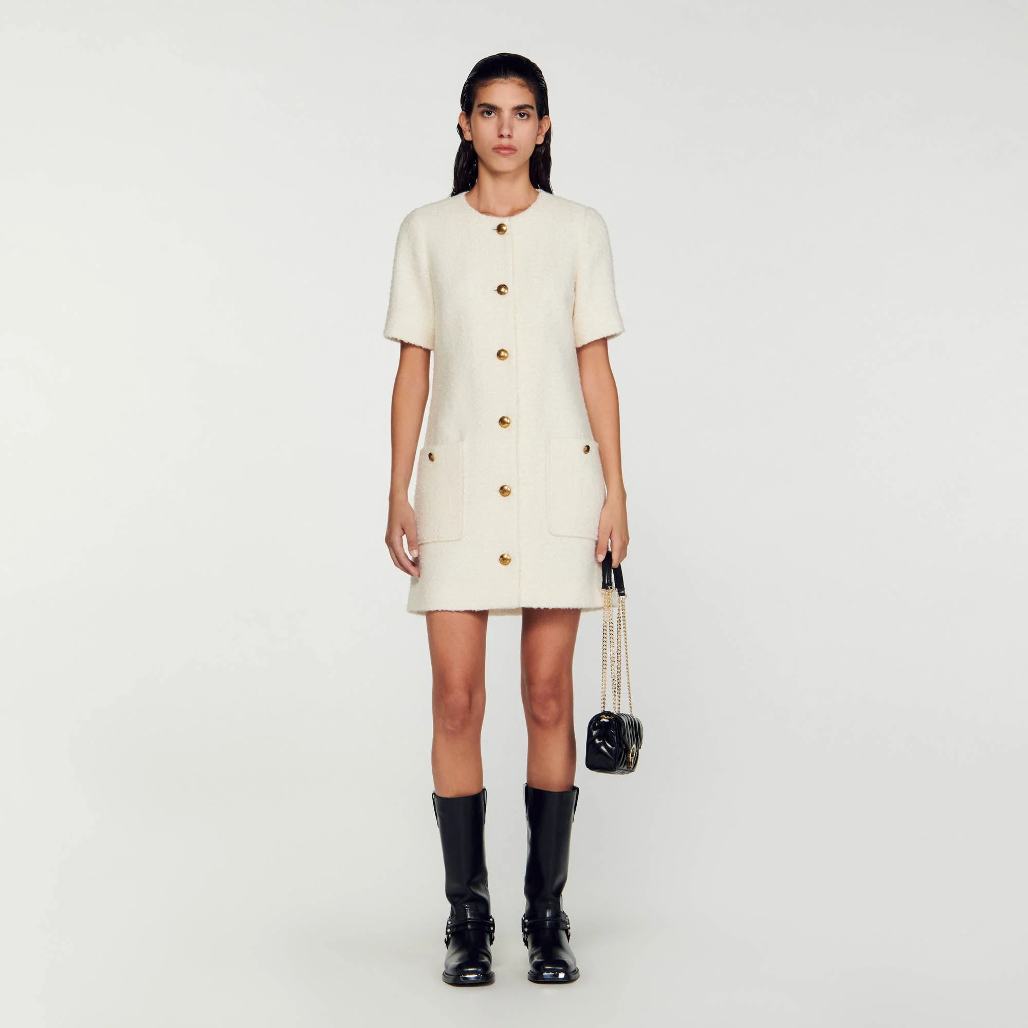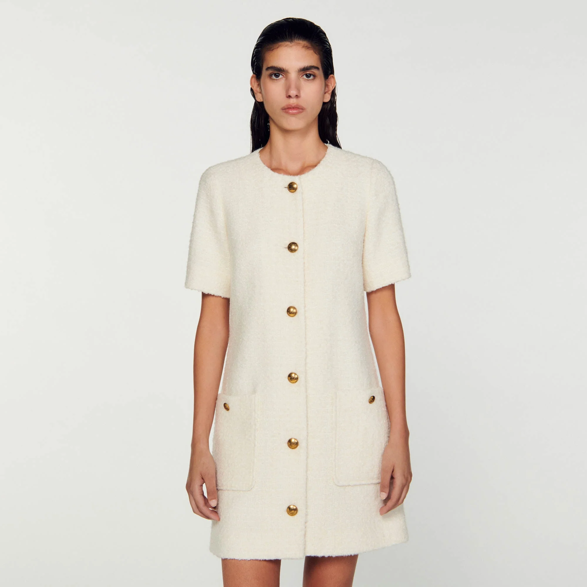Vestido corto de tweed de estilo abrigo, con cuello redondo, manga corta y un cierre de botones de fantasía.• Vestido corto de tweed Sandro Femme