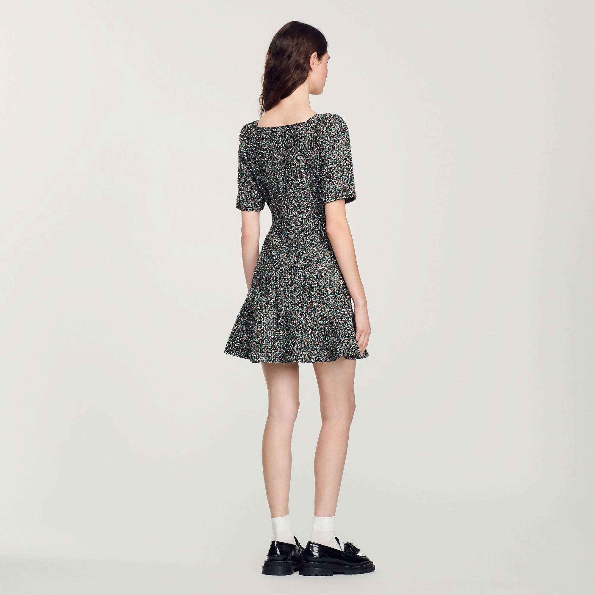 Vestido corto de tweed de manga corta y escote cuadrado abotonado, con bolsillos de parche.