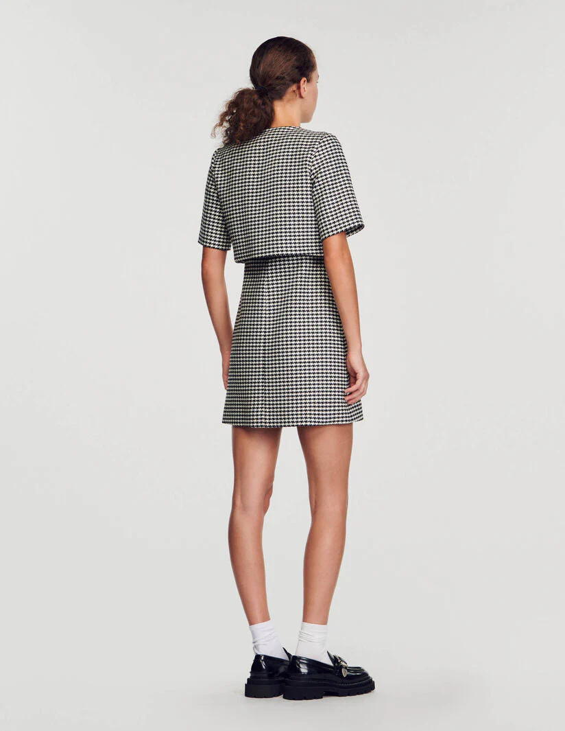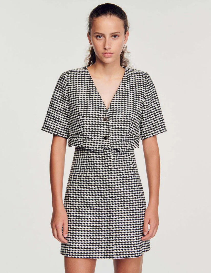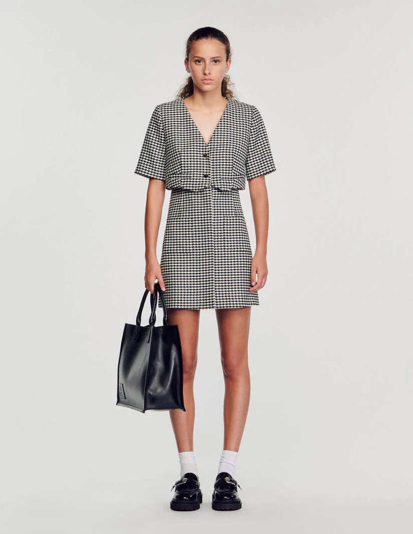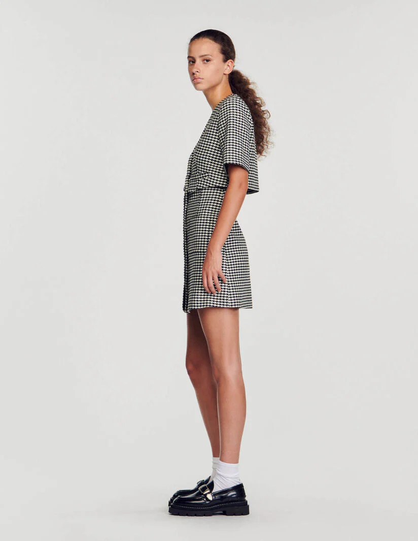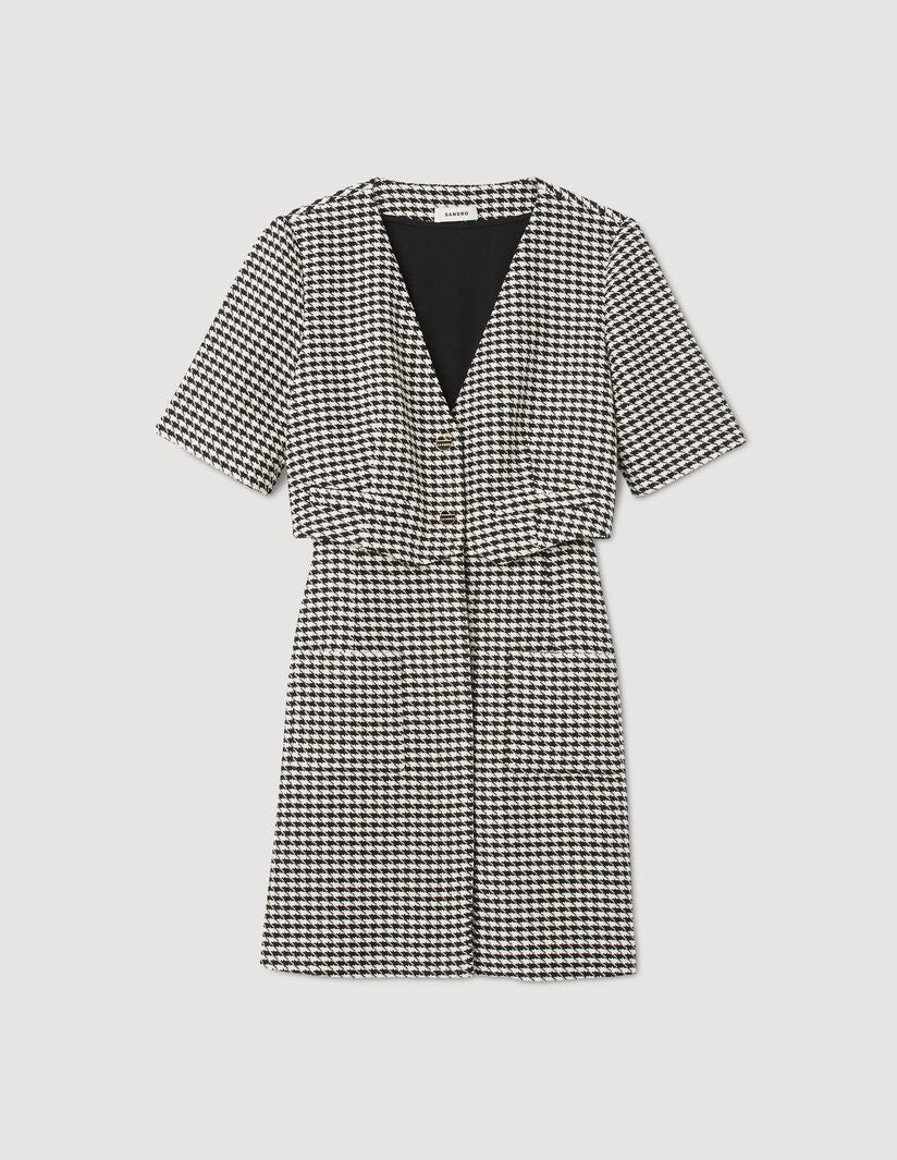 Vestido corto efecto 2 en 1 de manga corta y escote en V cruzado de tweed, con parte superior superpuesta abotonada y falda recta, sublimado con un motivo pata de gallo.• Vestido corto 2 en 1 de tweed Sandro de mujer