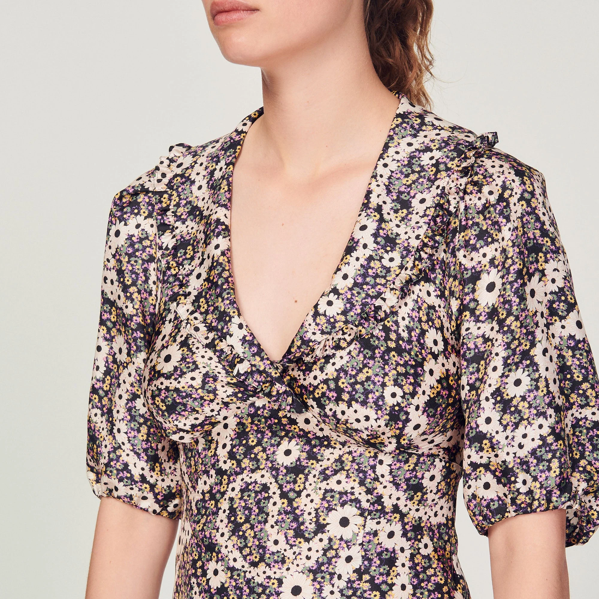 Vestido corto fluido de manga 3/4 ligeramente abullonada y escote en V con cuello amplio, sublimado con un estampado de cachemira floral.