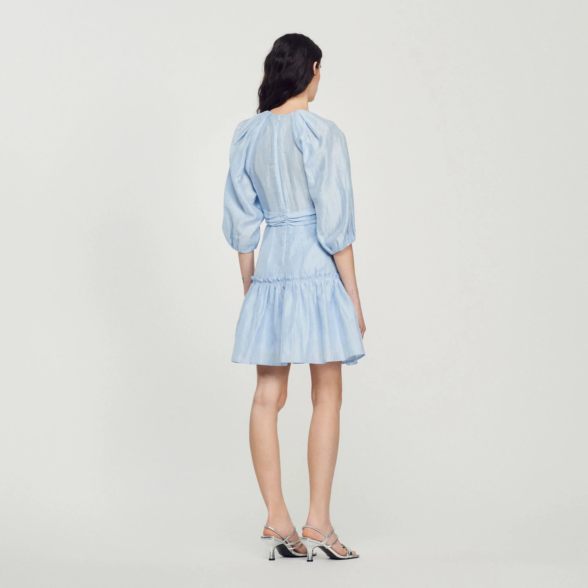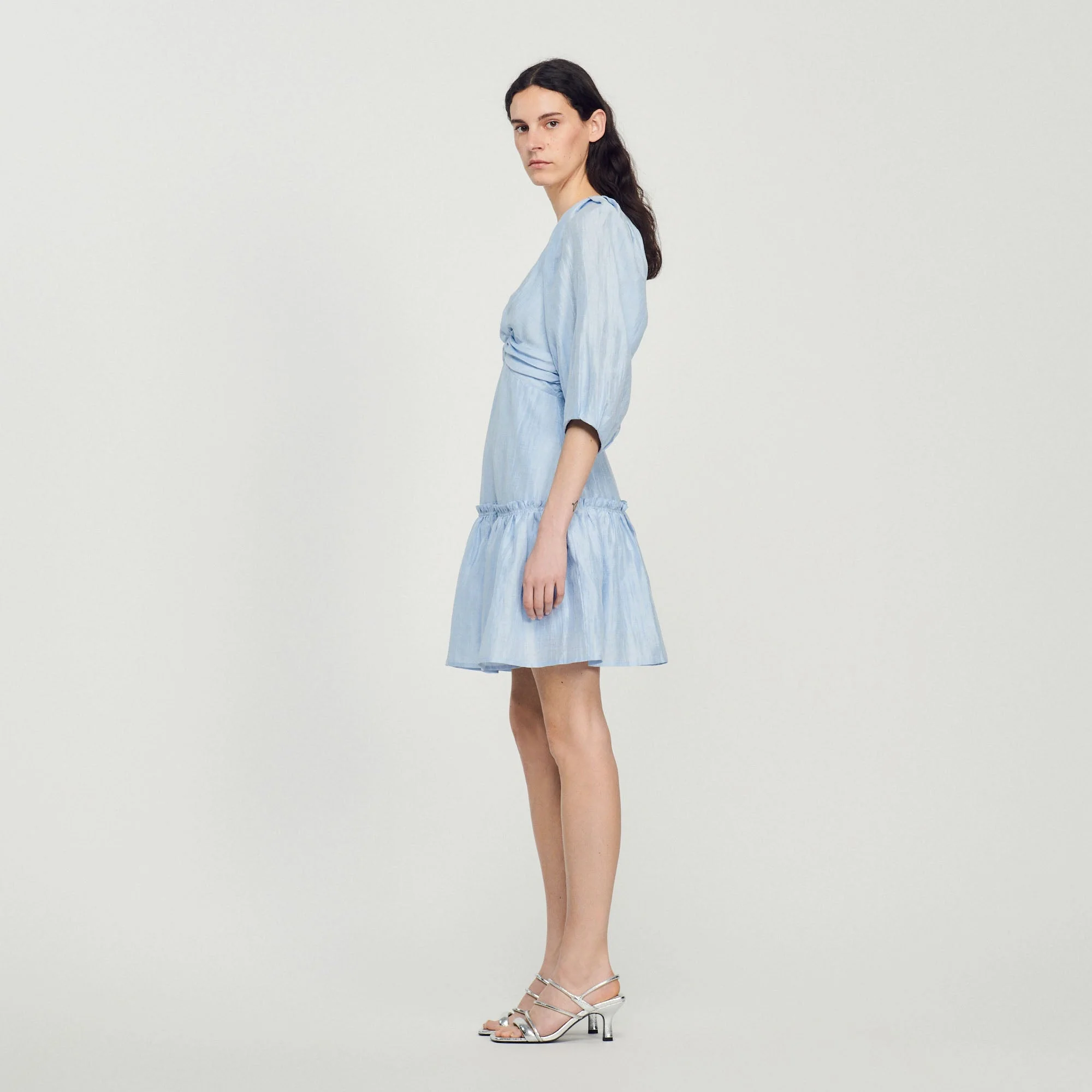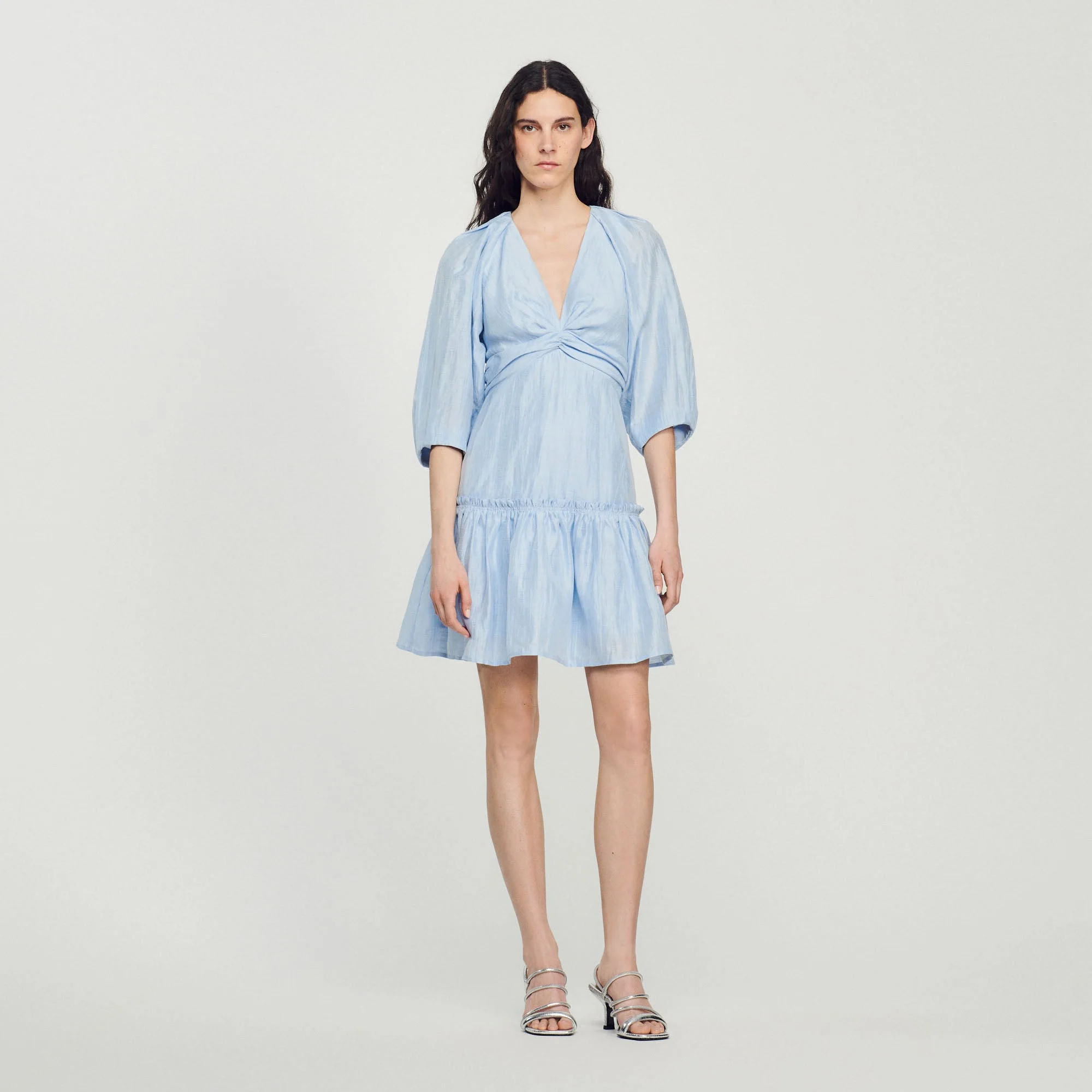Vestido corto de manga 3/4 voluminosa y elástica, y escote en V fruncido, con falda evasé con un volante.• Vestido corto Sandro de mujer