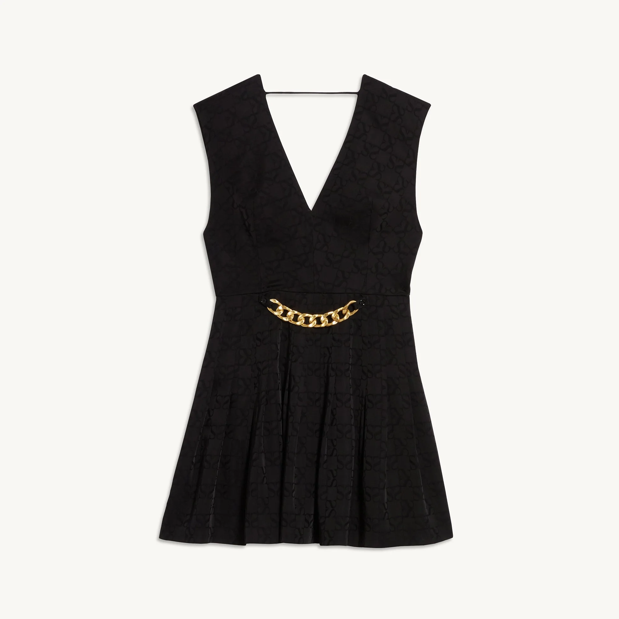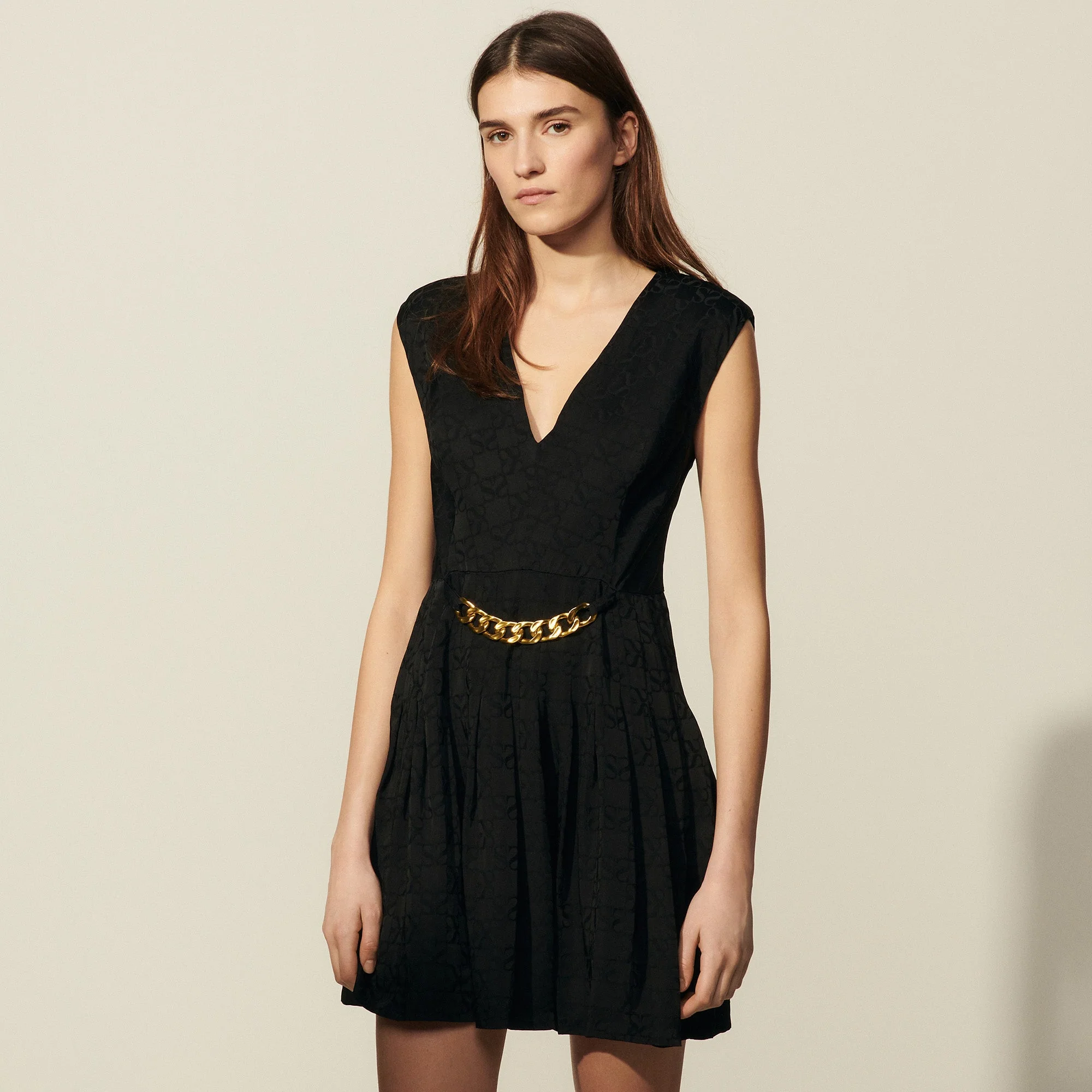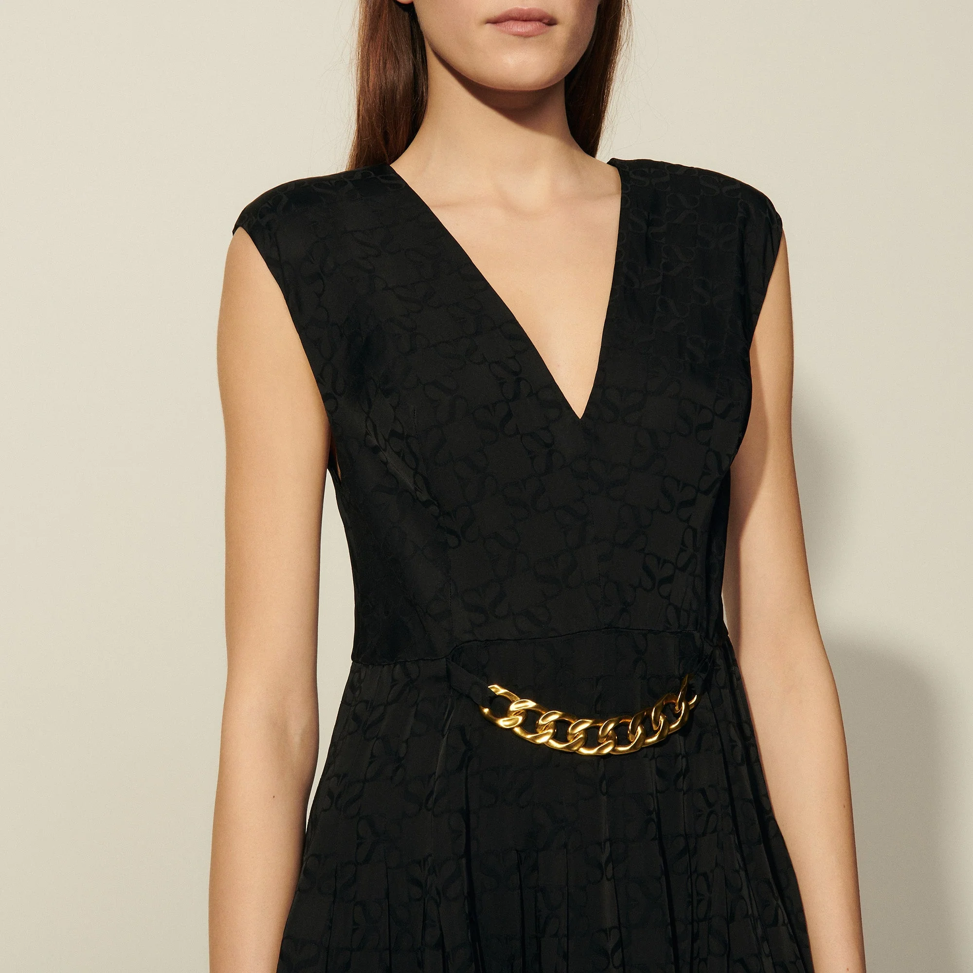 Vestido de mujer Sandro Vestido corto sin mangas de jacquard tono sobre tono Escote en V Sujeción en el escote de la espalda Cadena extraíble en la falda Parte superior ajustada y falda evasé Cremallera invisible en mitad de la parte trasera La modelo lleva la talla 36 Référence : SFPRO01570 COMPOSICIÓNTejido principal: 100% viscosa Botones: 100% nácar