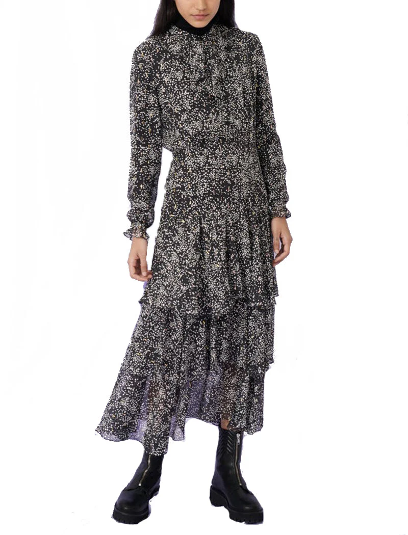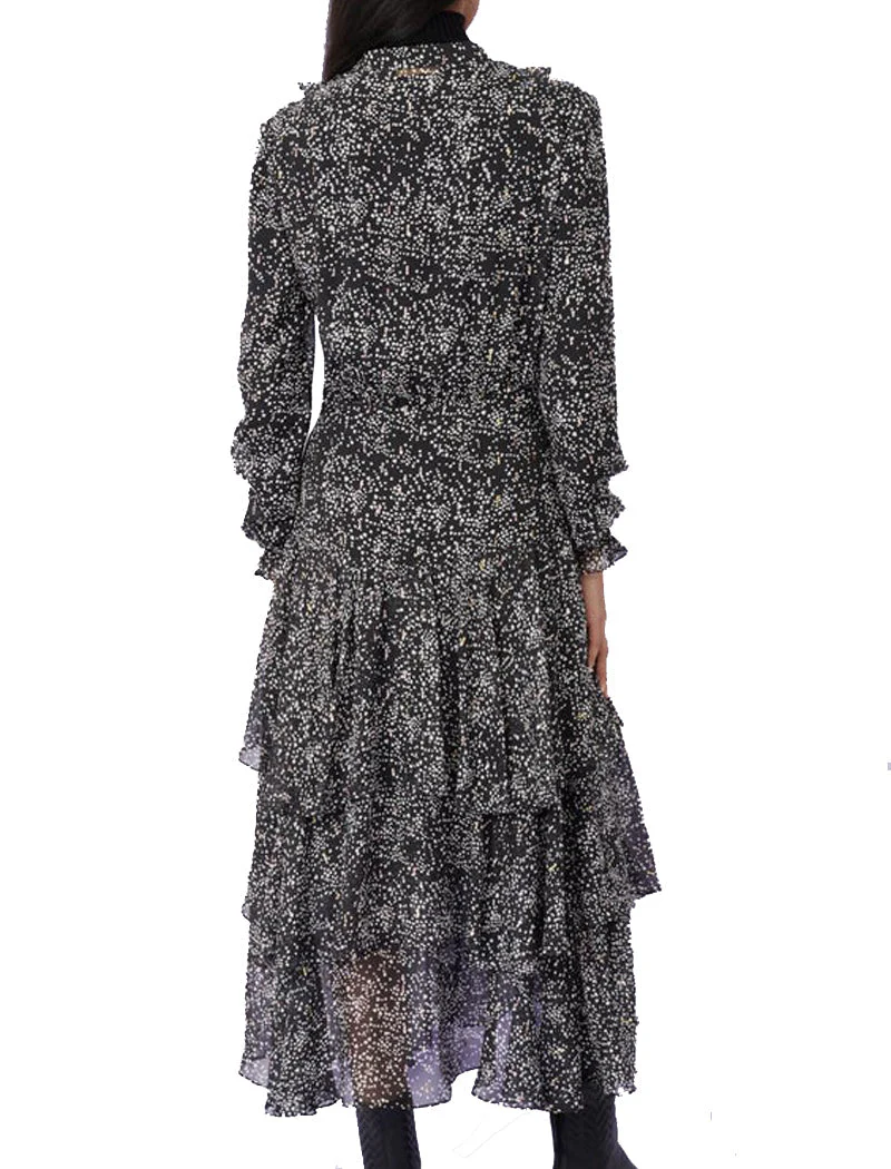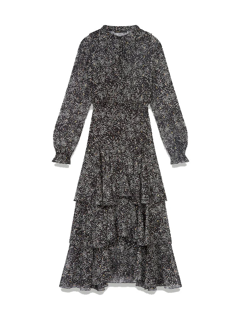 Vestido largo de seda con volantes, detalles de lúrex y estampado de lunares. Una prenda vaporosa con frunces en la cintura y en los puños, y volantes desde el cuello hasta la falda. Para combinar con botas urbanas de tipo motorista y una chaqueta corta para un look más informal. Forro opaco Largo a los tobillos