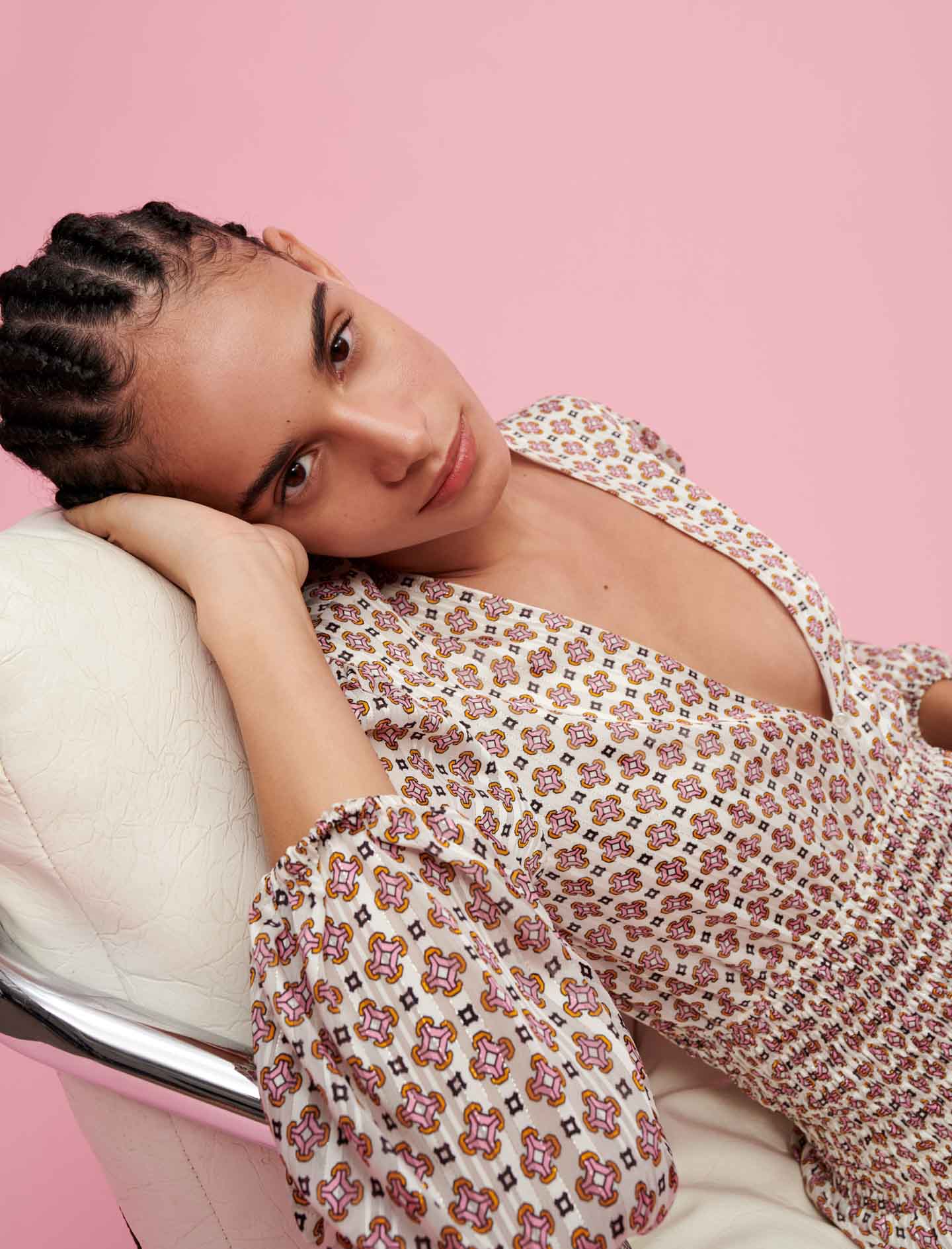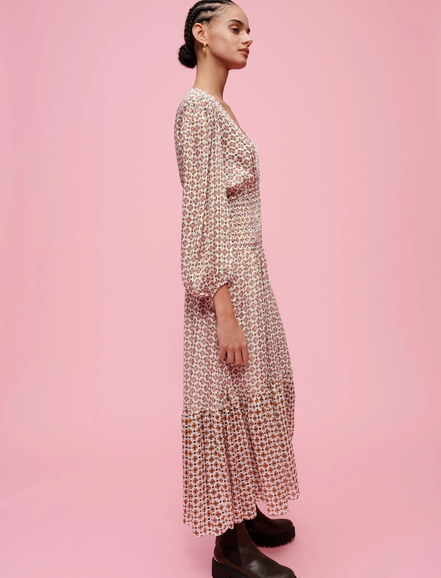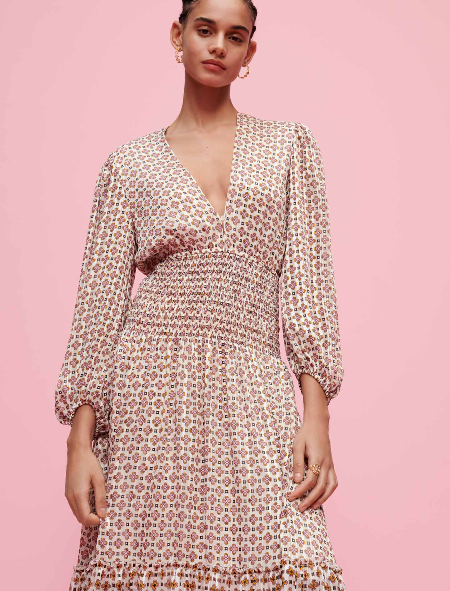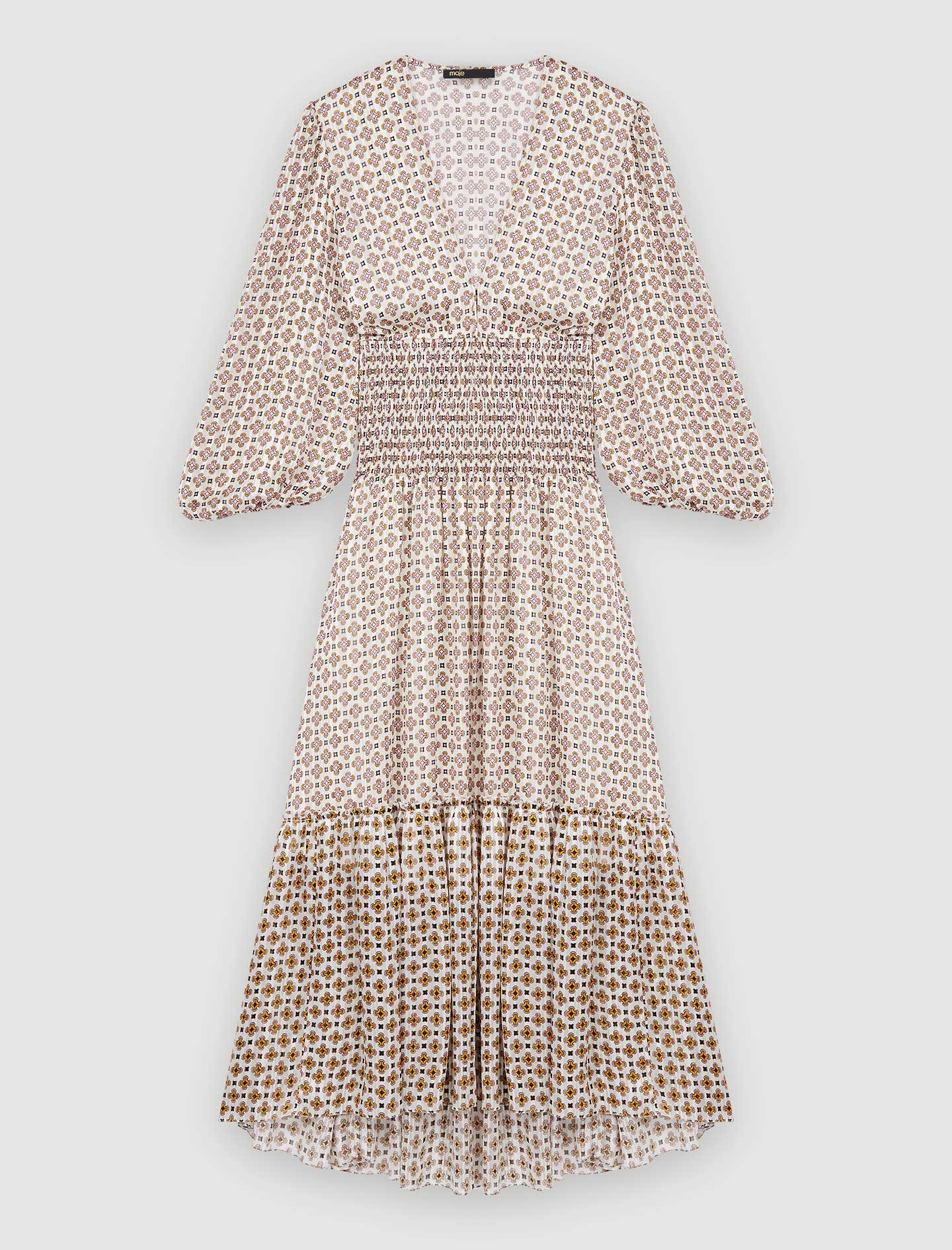 Vestido largo y fluido de muselina ligera. Estampado geométrico degradado. Escote de pico con botones. Mangas de largo medio y amplias ajustadas en el puño con una goma. Cinturilla fruncida. Forro de viscosa. Volante en el bajo. Vestido de día, ideal para una ceremonia.