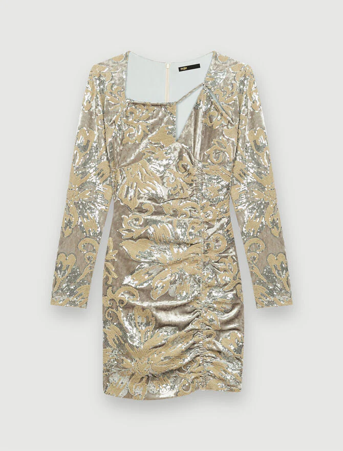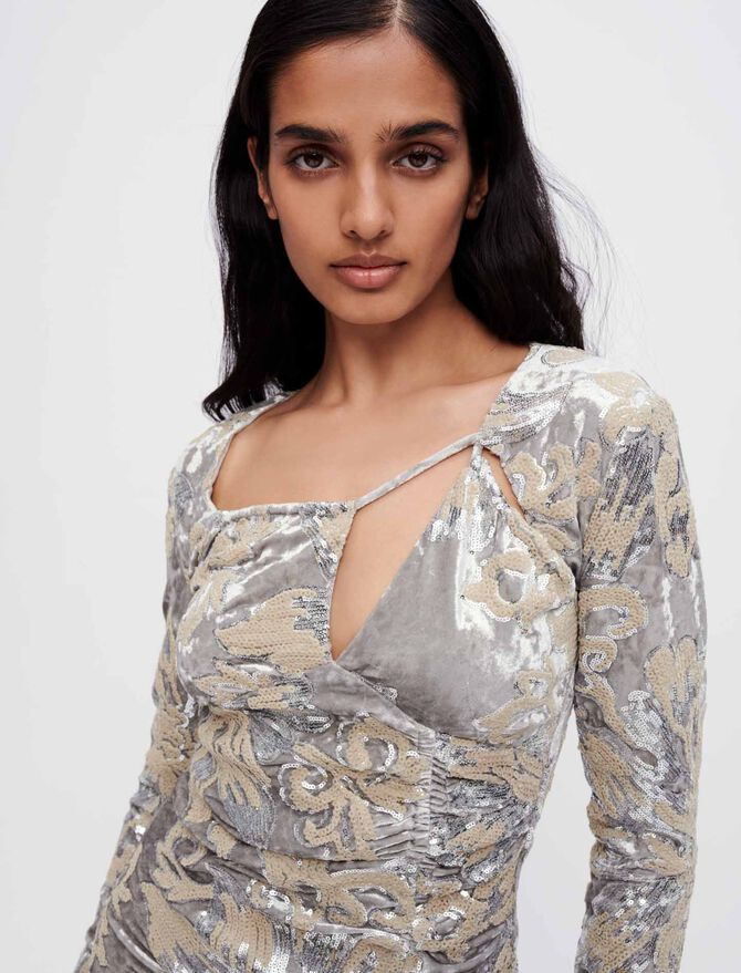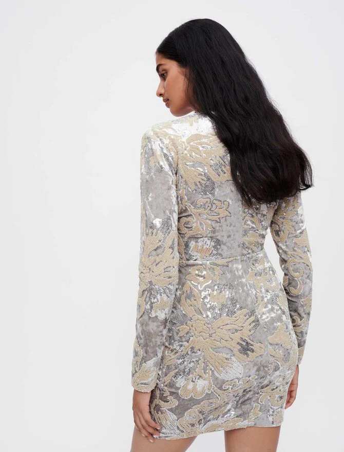 Vestido corto y ceñido de terciopelo con lentejuelas plateadas bordadas en toda la prenda. Motivo floral. Mangas largas y ajustadas. Completamente forrado. Escote con efecto trampantojo y tirantes. Cremallera invisible en la espalda. Aplique en coulisse en la parte delantera y abertura en el bajo. Drapeado en la parte delantera. Ideal para la noche o para una ceremonia.