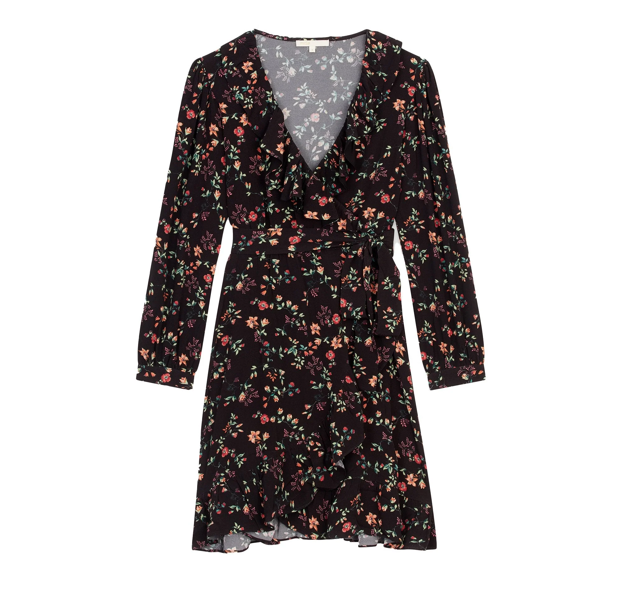 VESTIDO NEGRO ESTAMPADO, MARCA MAJE. VESTIDO CORTO CUELLO V CON CORBATA MANGA LARGA, NEGRO CON ESTAMPADO DE ROSAS. TEJIDO PRINCIPAL:100% VISCOSA;. LAVADO = LAVADO MODERADO 30 ° / BLANQUEADO = SIN BLANQUEO / SECADO = NO USAR SECADORA / PLANCHADO = PLANCHAR A UNA TEMPERATURA MÁXIMA DE 110 ° C SIN VAPOR / PRENSADO = LIMPIEZA EN SECO PROFESIONAL, PC Y HC, TRATAMIENTO NORMAL.