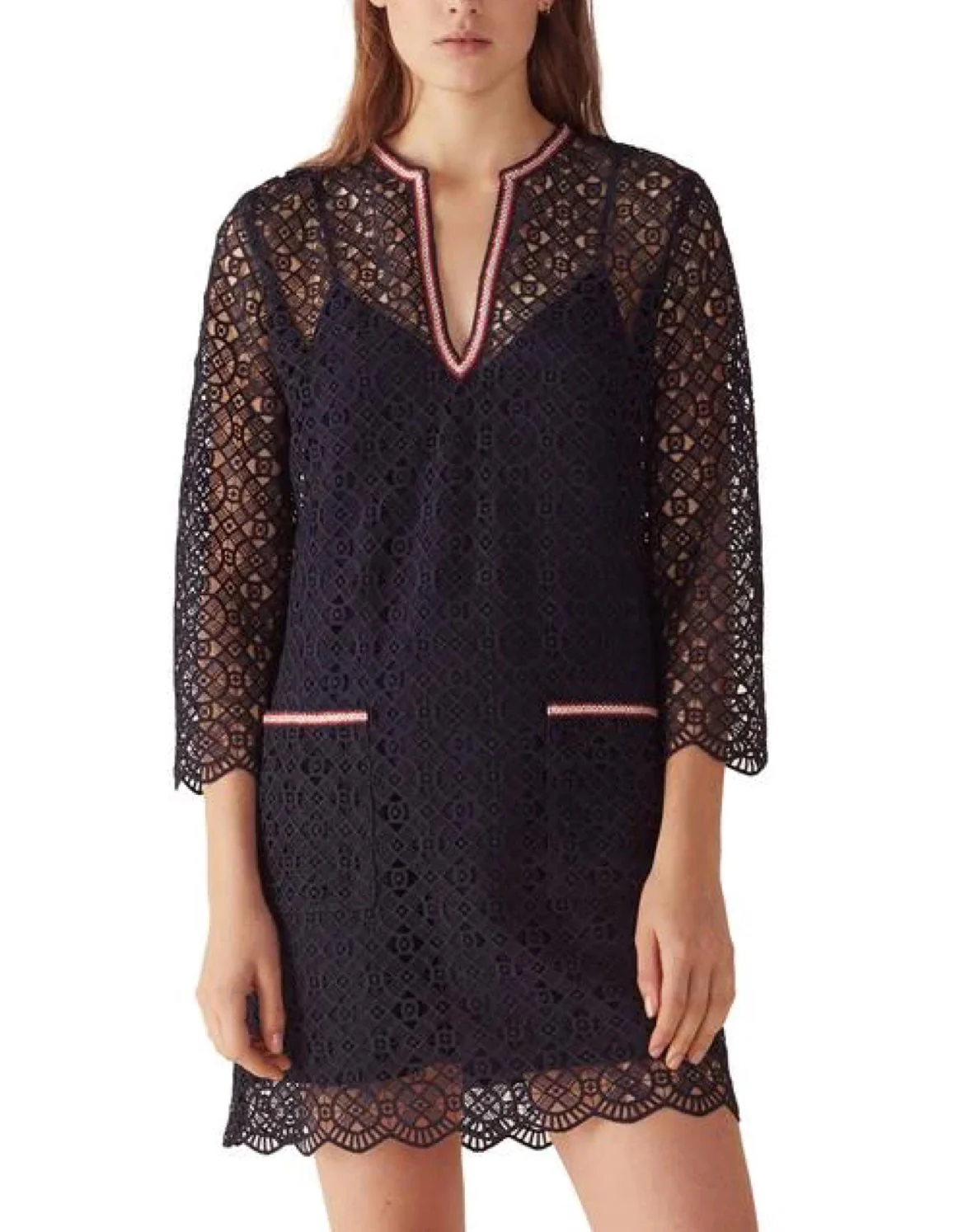 Vestido Corto De Encaje, Manga 3/4 Escote V, Marca Sandro. Consultar Composición E Instrucciones De Lavado En Etiqueta Interna.