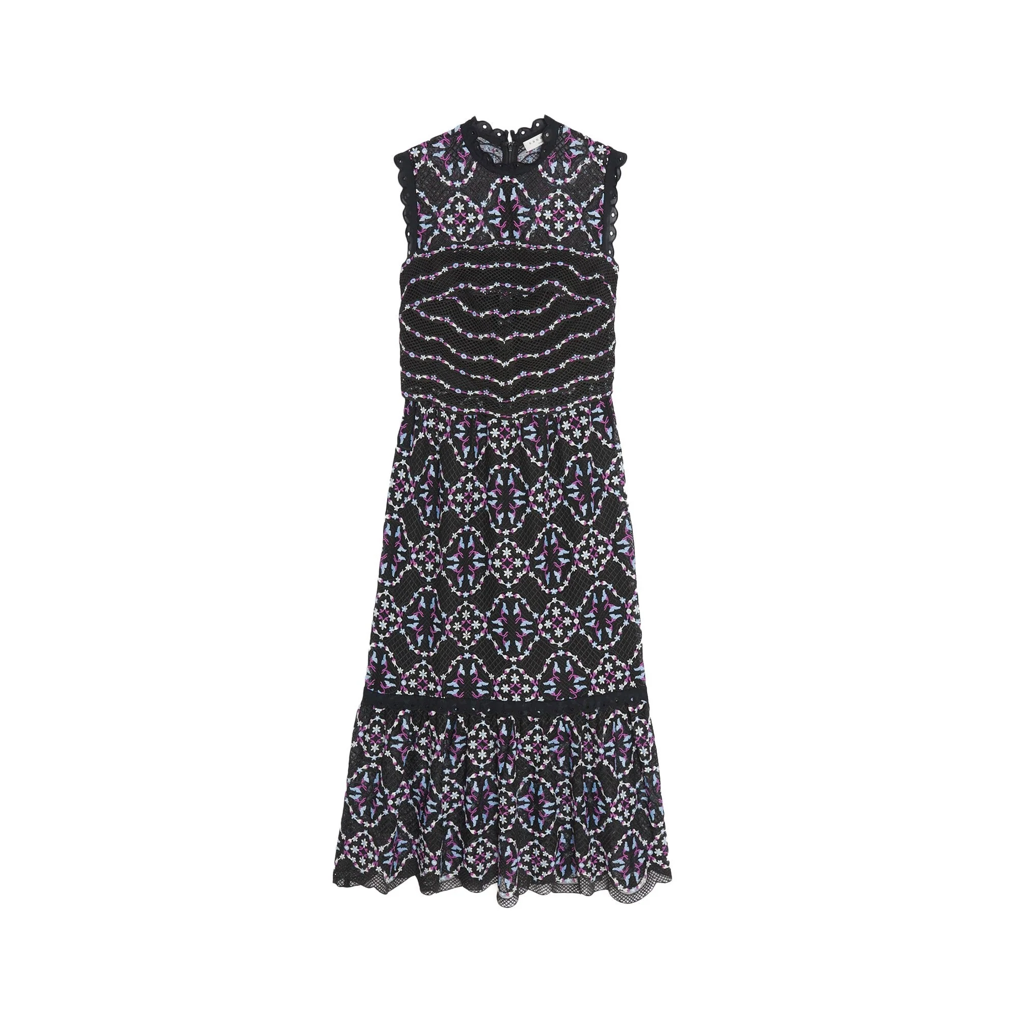 VESTIDO LARGO DE ENCAJE, SIN MANGAS, CUELLO REDONDO., MARCA SANDRO. 90% POLIAMIDA 10% POLIÉSTER. LAVADO A MANDO DELICADO, SIN BLANQUEADOR, NO SECADORA. REVISAR ETIQUETA INTERNA DE LAVADO PARA MÁS INFORMACIÓN..