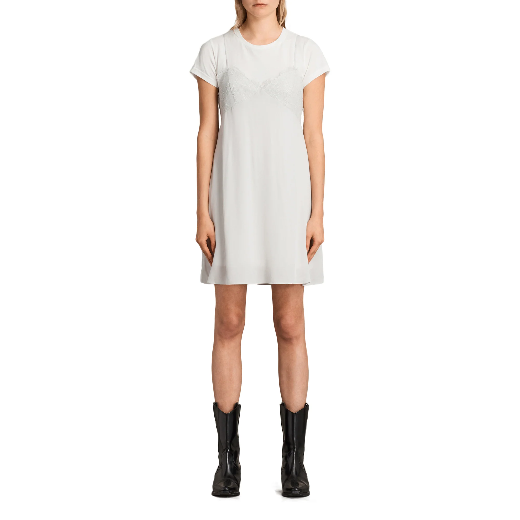 VESTIDO IVES, MARCA ALLSAINTS. VESTIDO CORTO, CUELLO REDONDO MANGA CORTA, VESTIDO DE CAPA CON TIRANTES FINOS, ESCOTE CORAZÓN Y RIBETES FESTONEADOS, SILUETA RECTA.