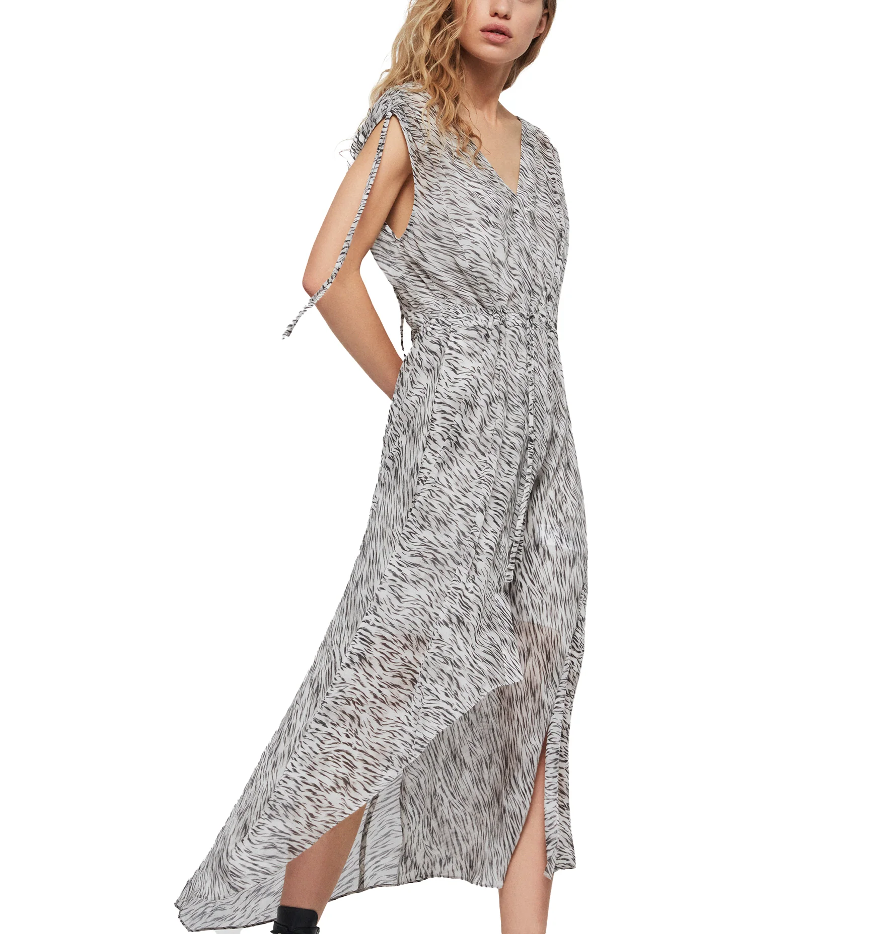 VESTIDO KAMILA ZED, MARCA ALLSAINTS. VESTIDO LARGO ASIMÉTRICO SIN MANGAS CORTE FLUÍDO, JARETAS AJUSTABLES EN HOMBROS Y CINTURA, ESCOTE EN V EN ESPALDA, ESTAMPADO . 100% VISCOSA, FORRO 100% POLIÉSTER. LAVADO EN SECO.
