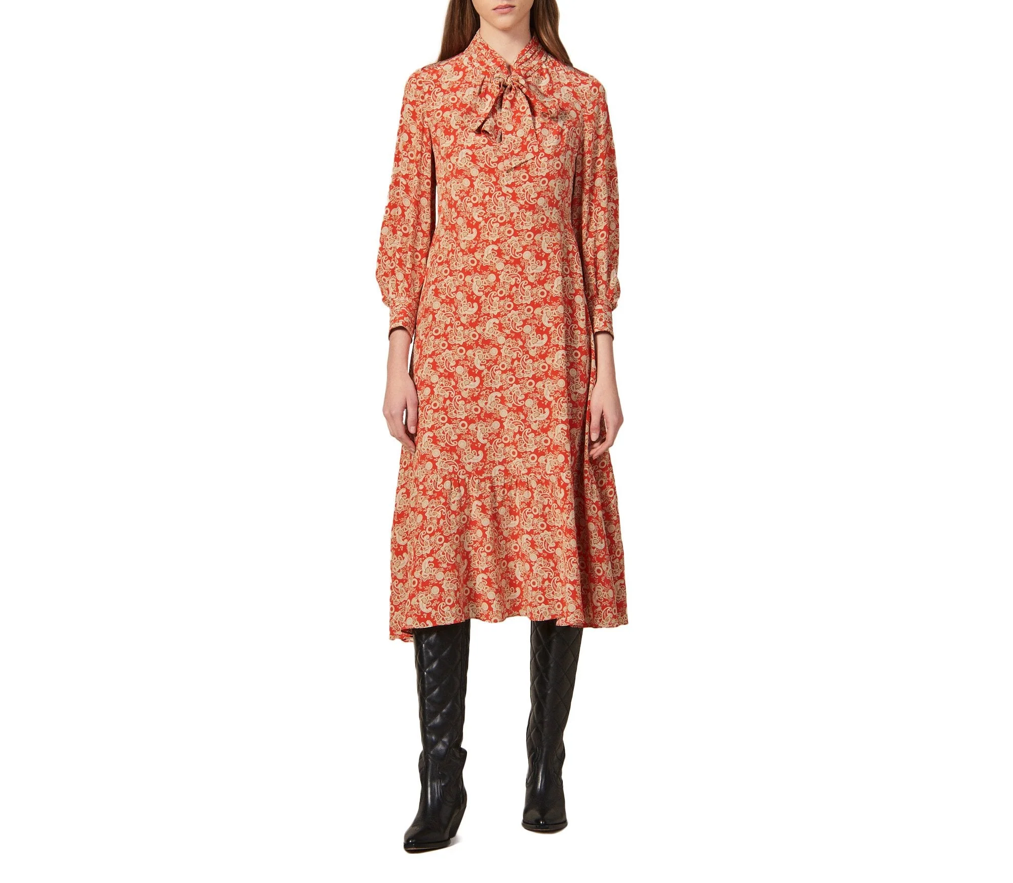 VESTIDO LARGO ESTAMPADO, MANGA LARGA Y MOÑO EN CUELLO, MARCA SANDRO. 100% SEDA. LIMPIEZA EN SECO PROFESIONAL. REVISAR ETIQUETA INTERNA DE LAVADO PARA MÁS INFORMACIÓN.