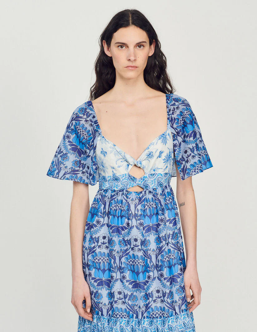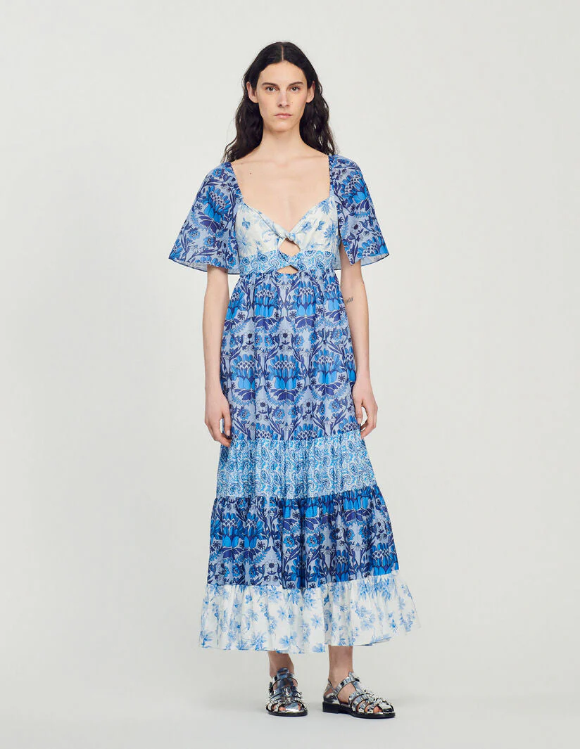 Vestido largo fluido de manga corta avolantada y cuello en V con detalles retorcidos, sublimado con un estampado de fular, con parte inferior de la falda evasé y parte trasera con lazos anudables.• Vestido largo fluido Sandro de mujer