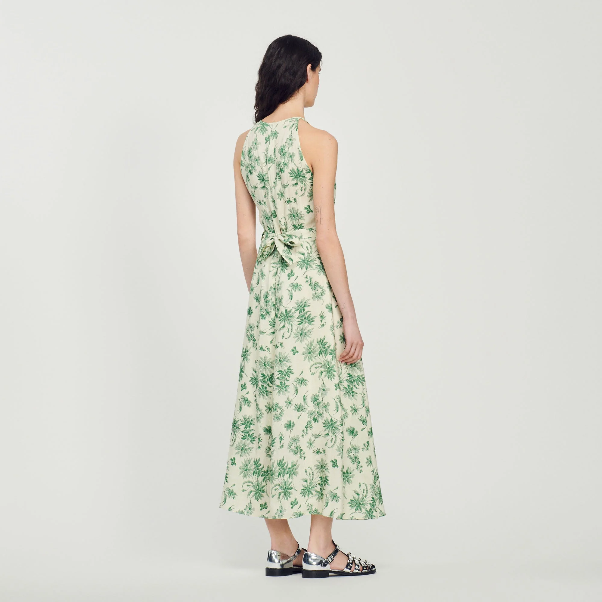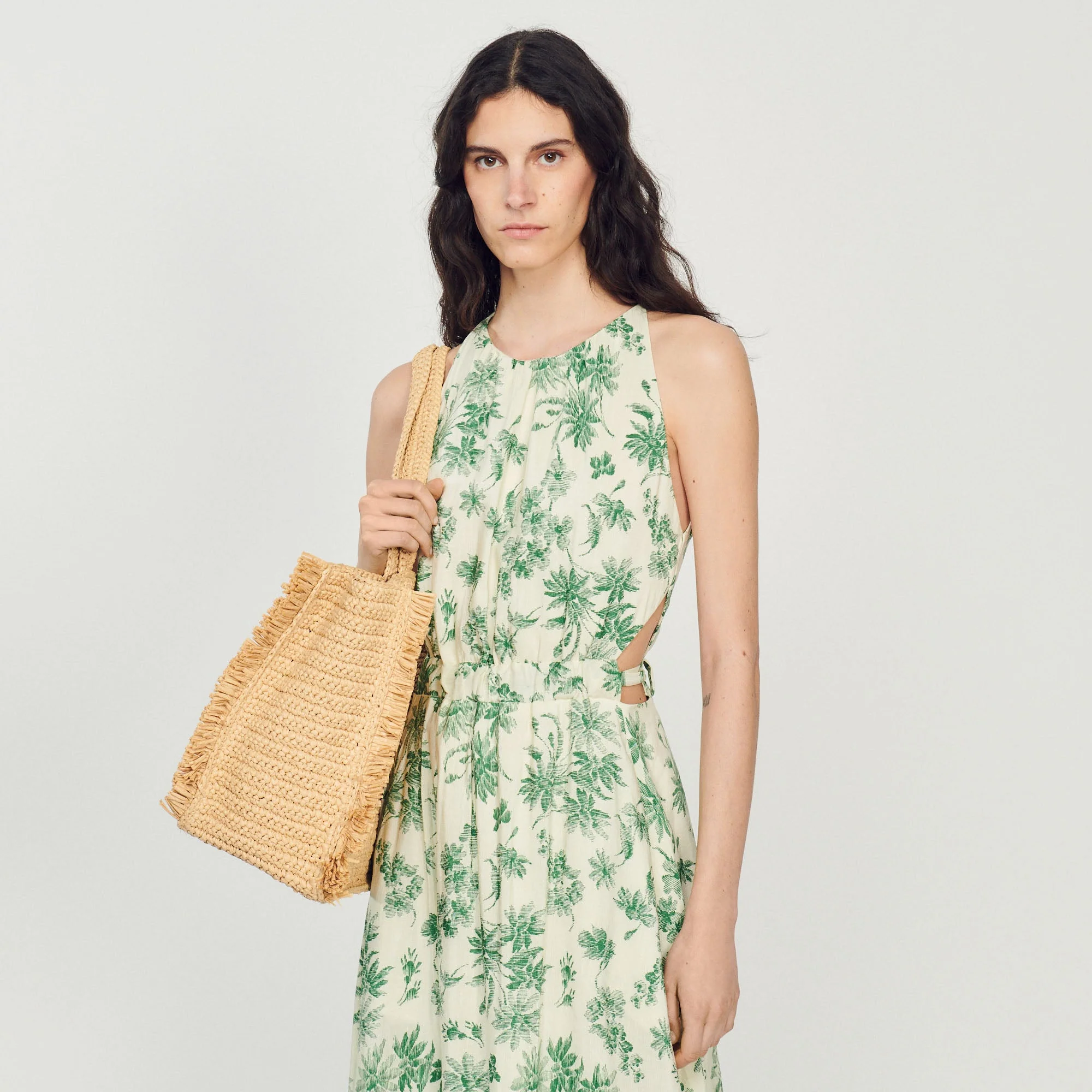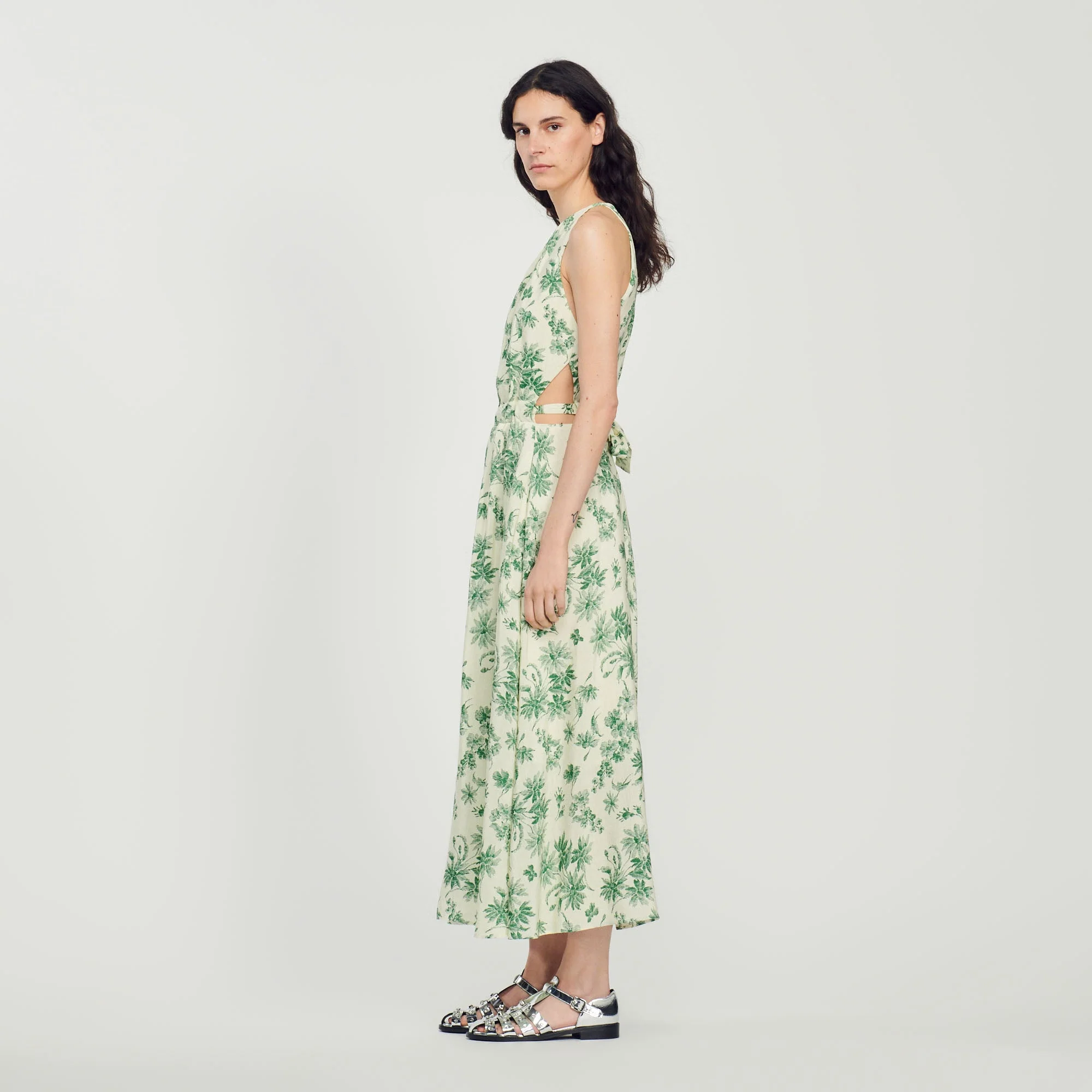 Vestido largo sin mangas y de cuello redondo, con elástico en la cintura y calados en los laterales, sublimado con un estampado de palmeras «Fleur de Jouy».• Vestido largo Sandro de mujer