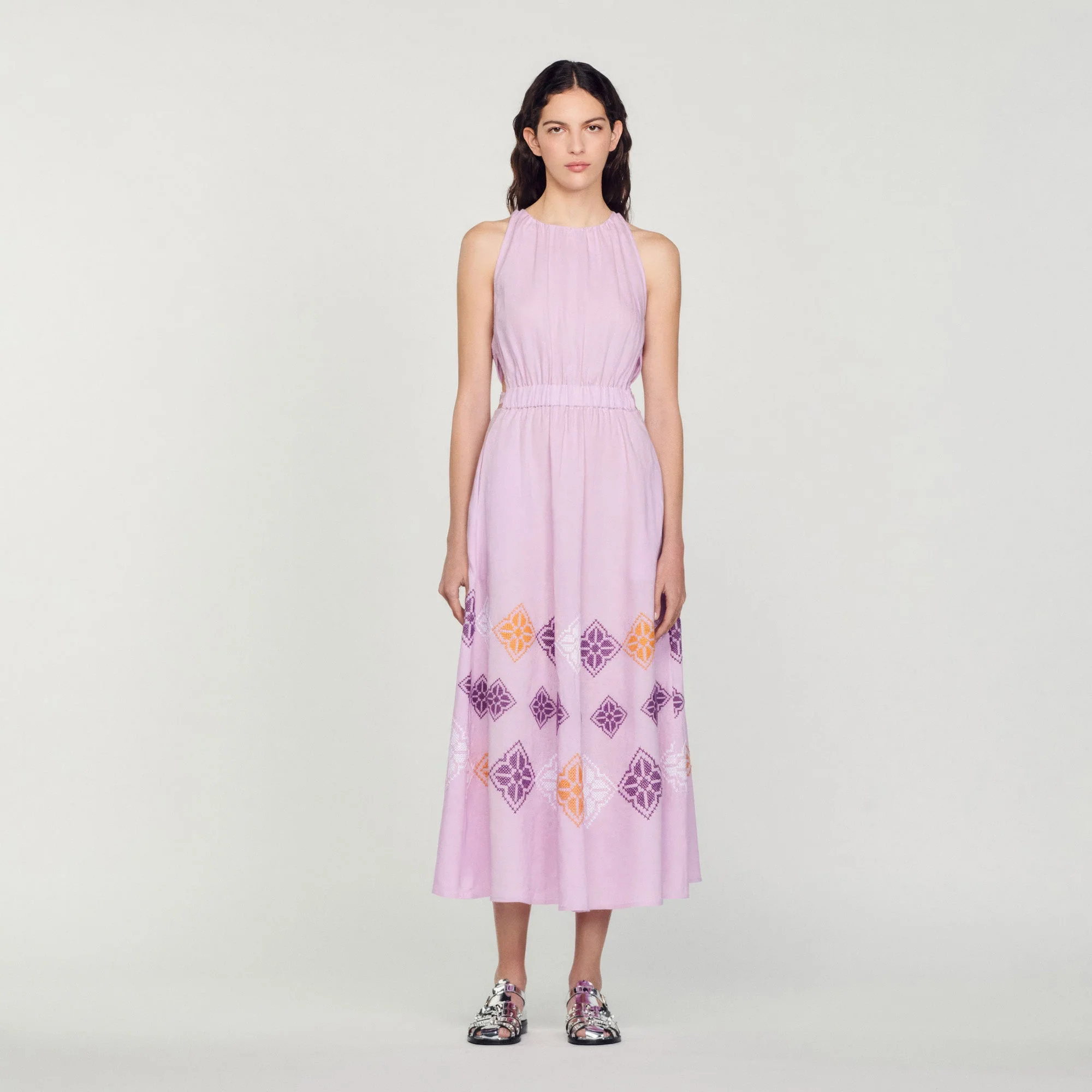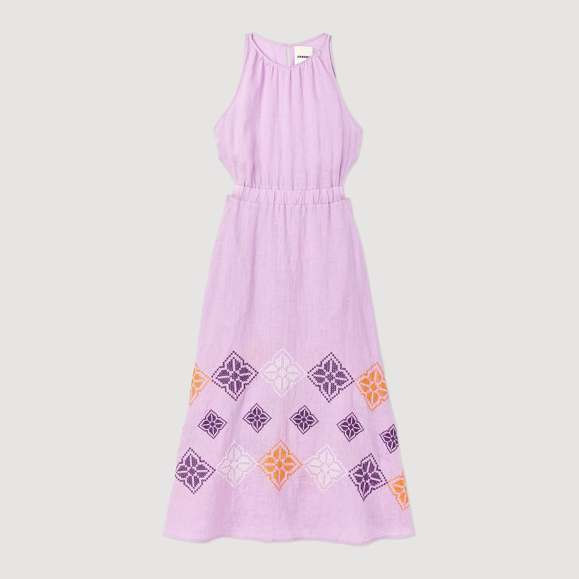 Vestido largo sin mangas y de cuello redondo de lino con elástico en la cintura y aberturas caladas en los laterales, sublimado con bordados con motivos florales geométricos.• Vestido largo Sandro de mujer