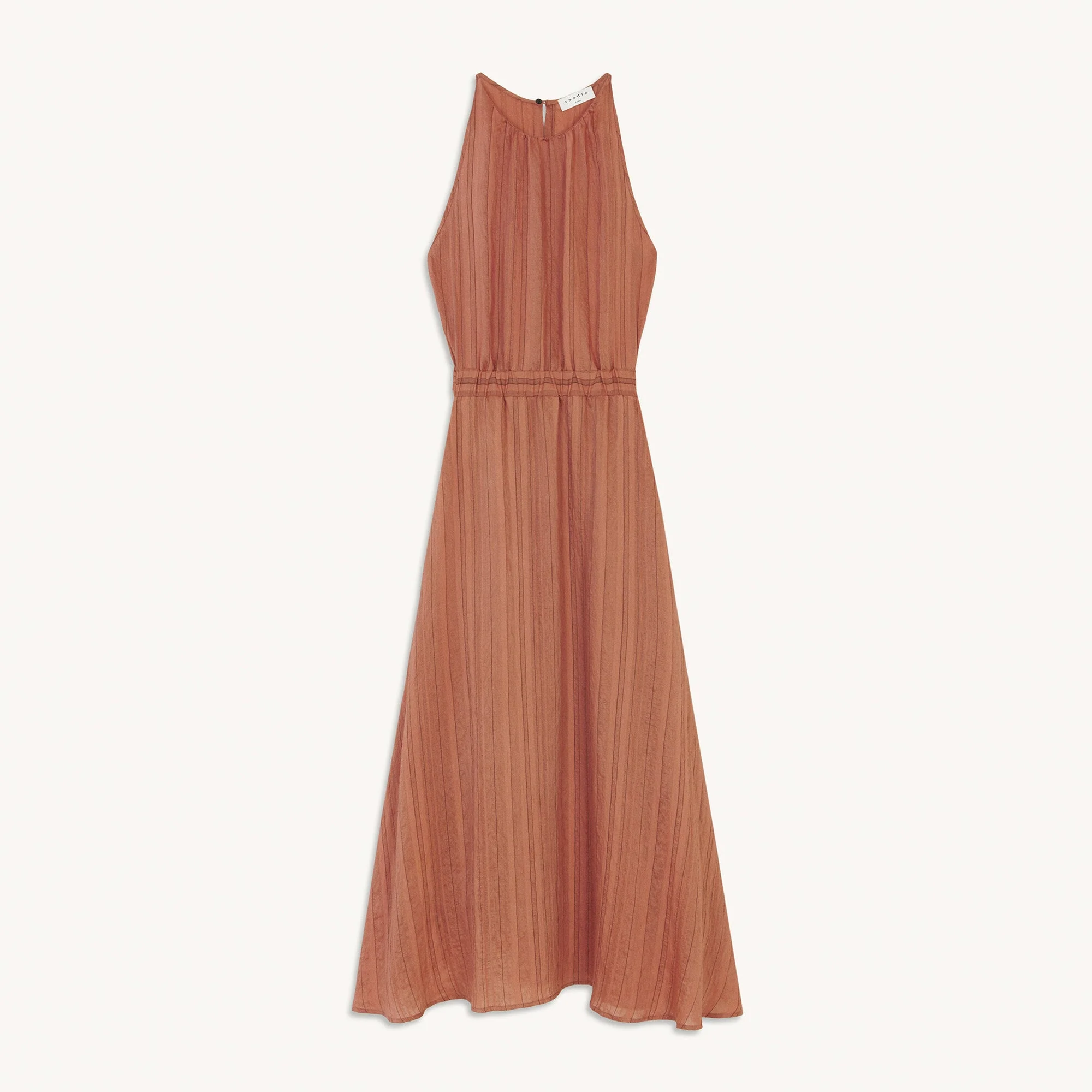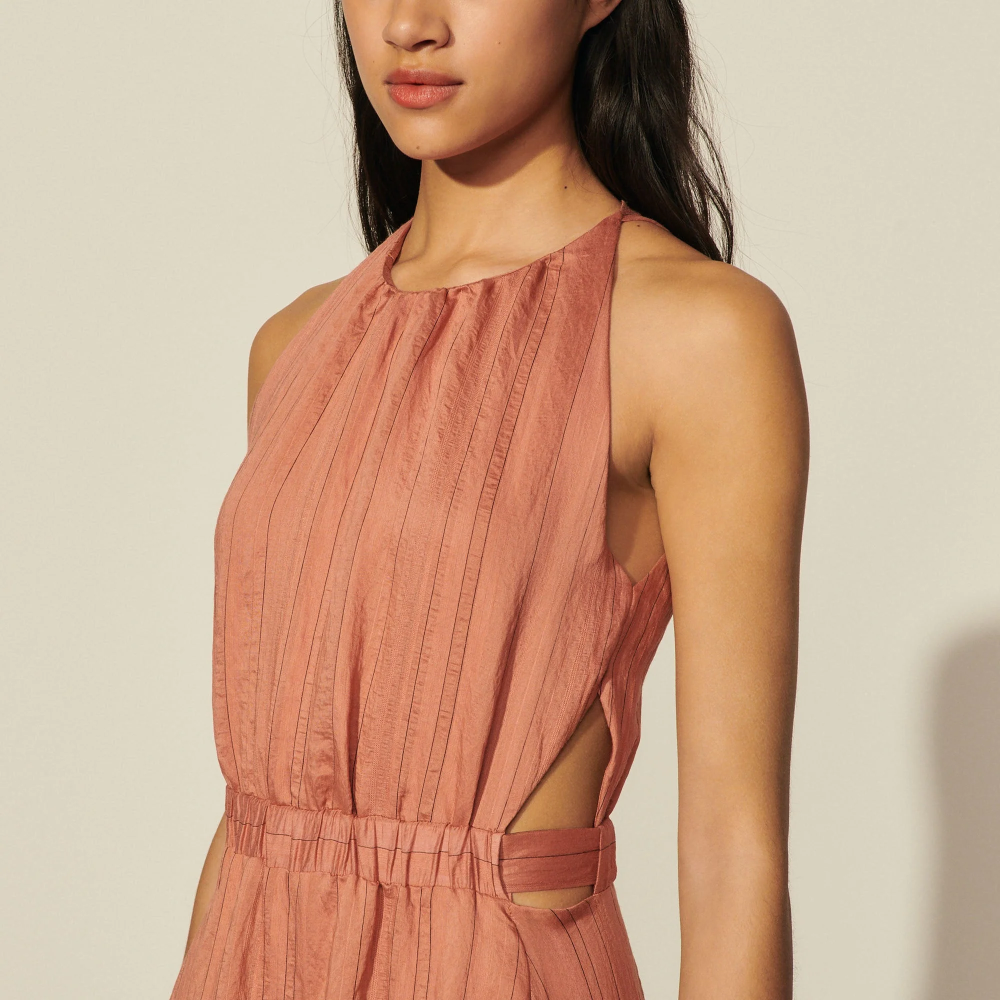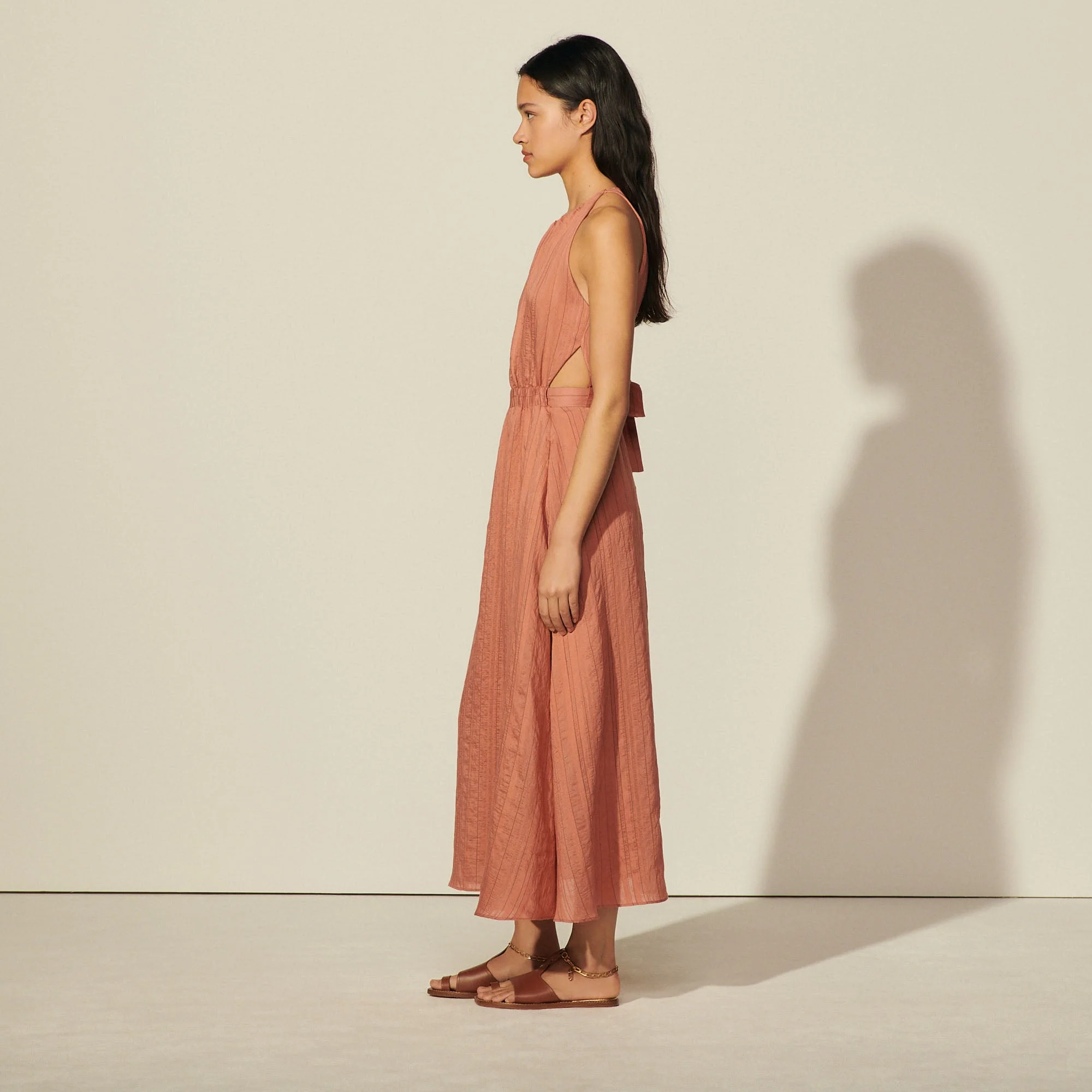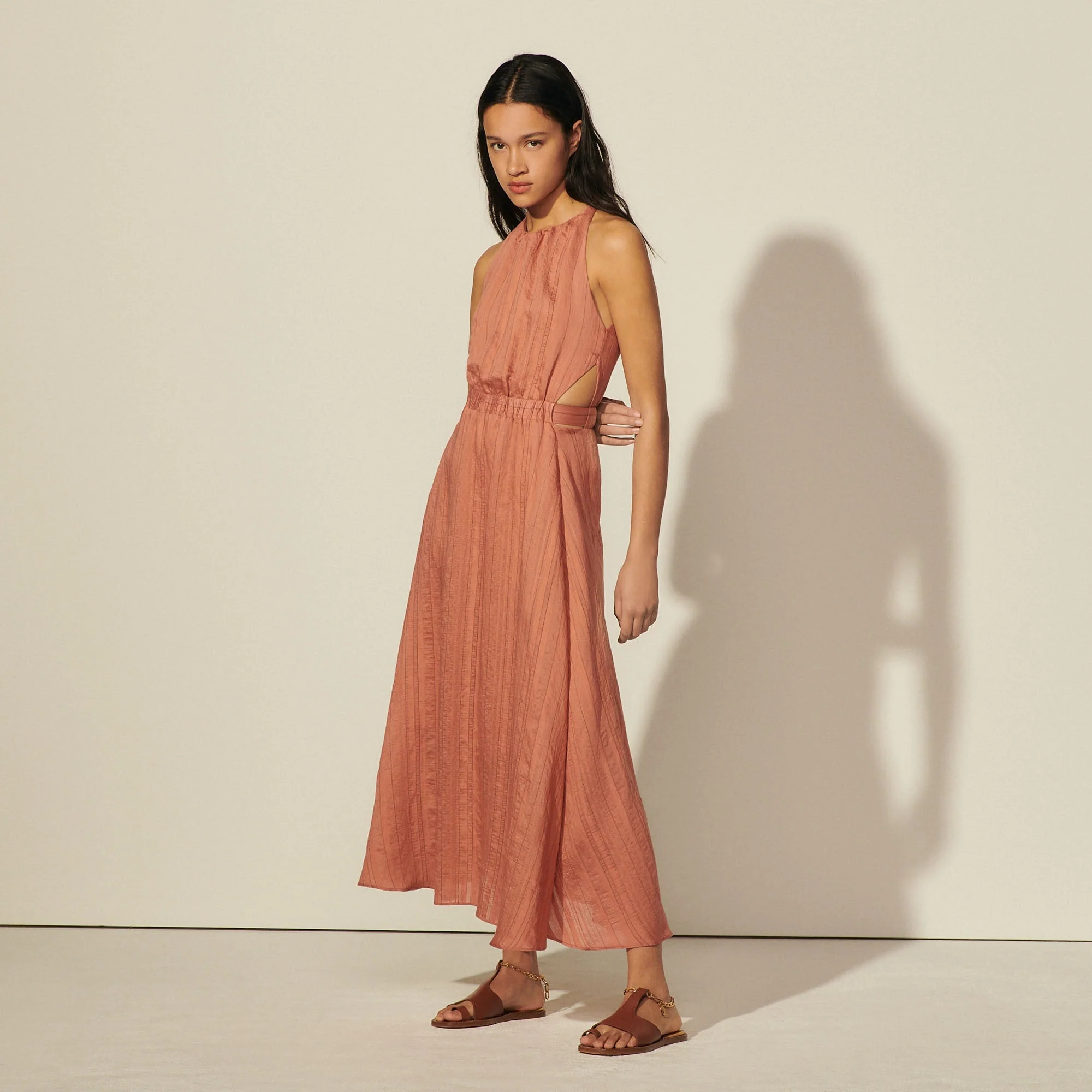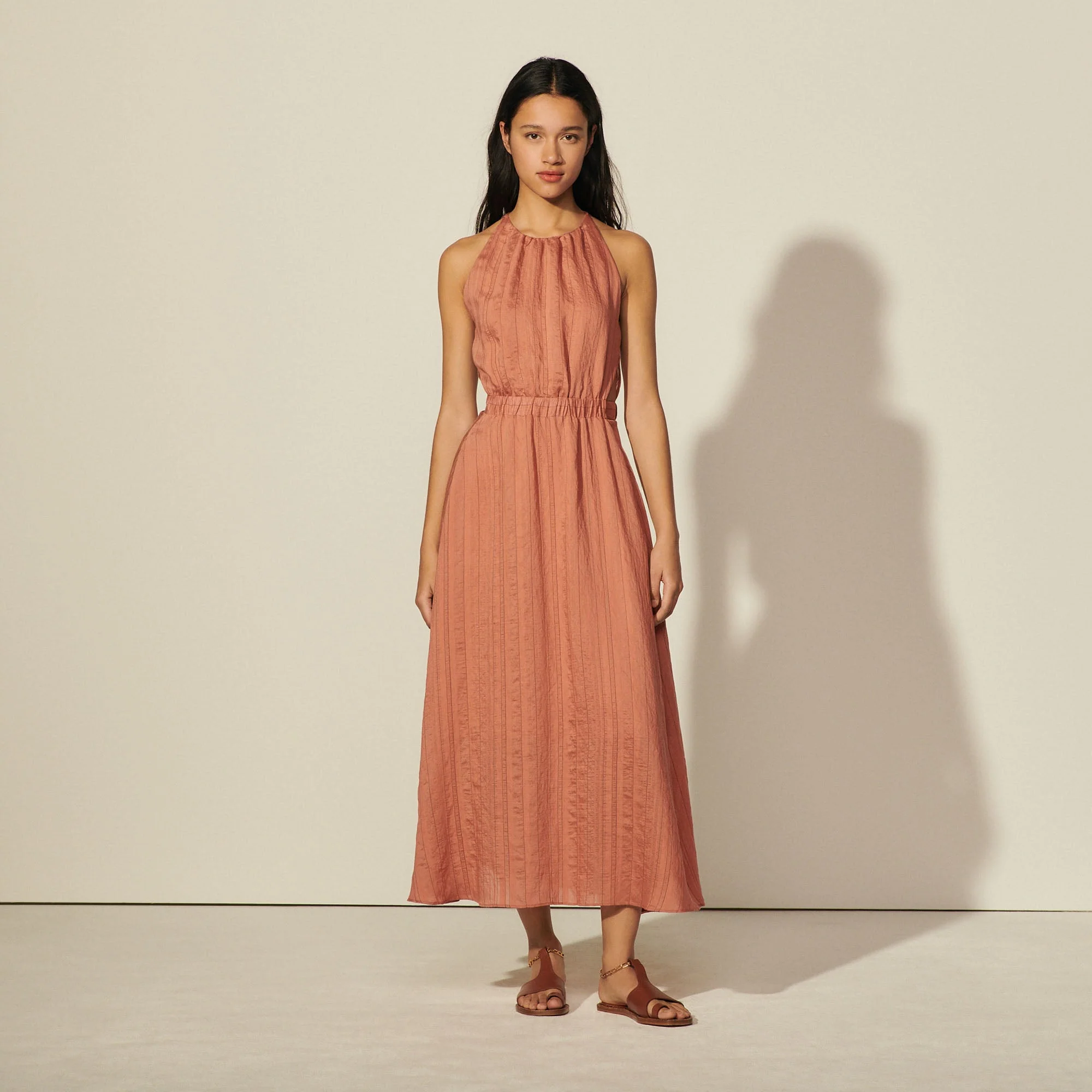 Vestido de mujer Sandro Vestido largo sin mangas de tejido de rayas finas Escote redondeado Sisa americana Talle marcado por aberturas y cordones corredizos anudables Falda evasé voluminosa La modelo lleva la talla 36 REFERENCIA : SFPRO01854 COMPOSICIÓNTejido principal: 72% viscosa, 27% nailon, 1% poliéster Botones: 100% nácar Forro: 100% poliéster