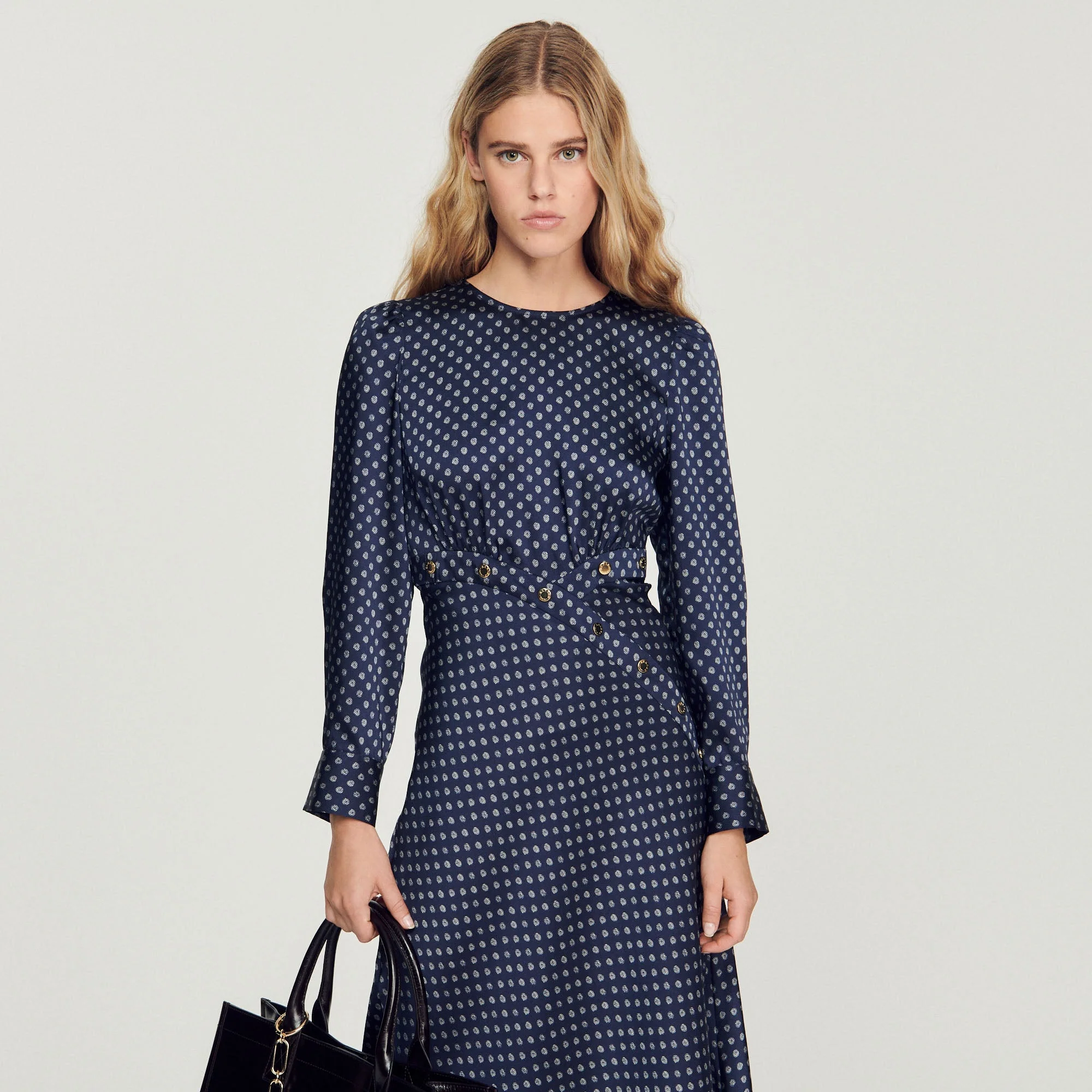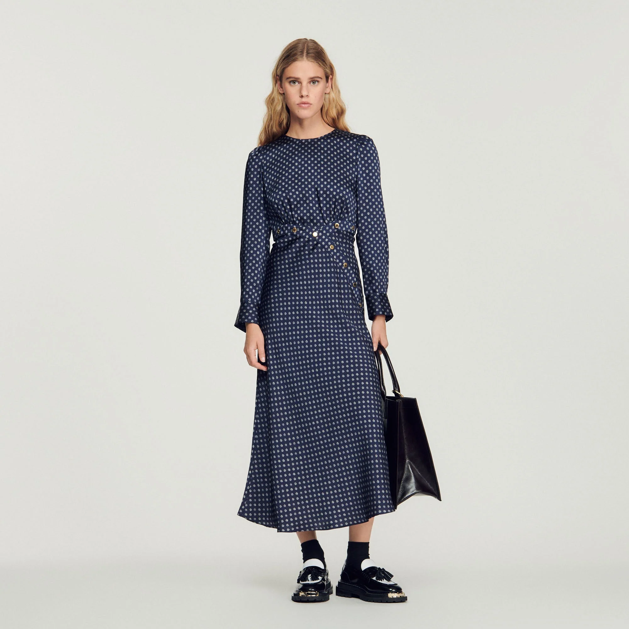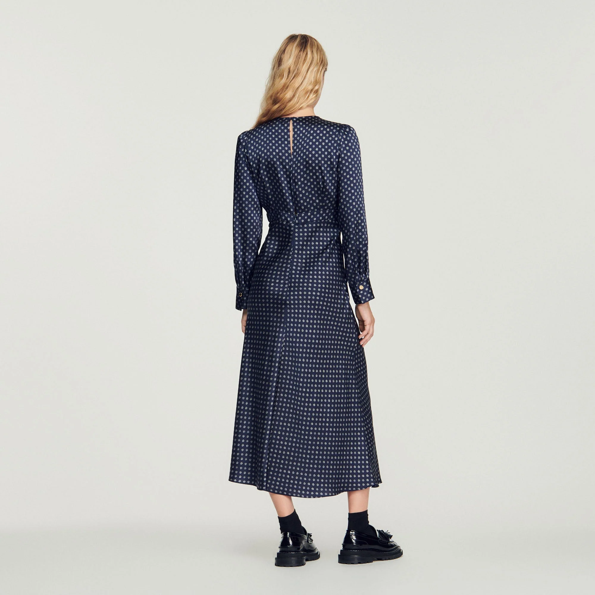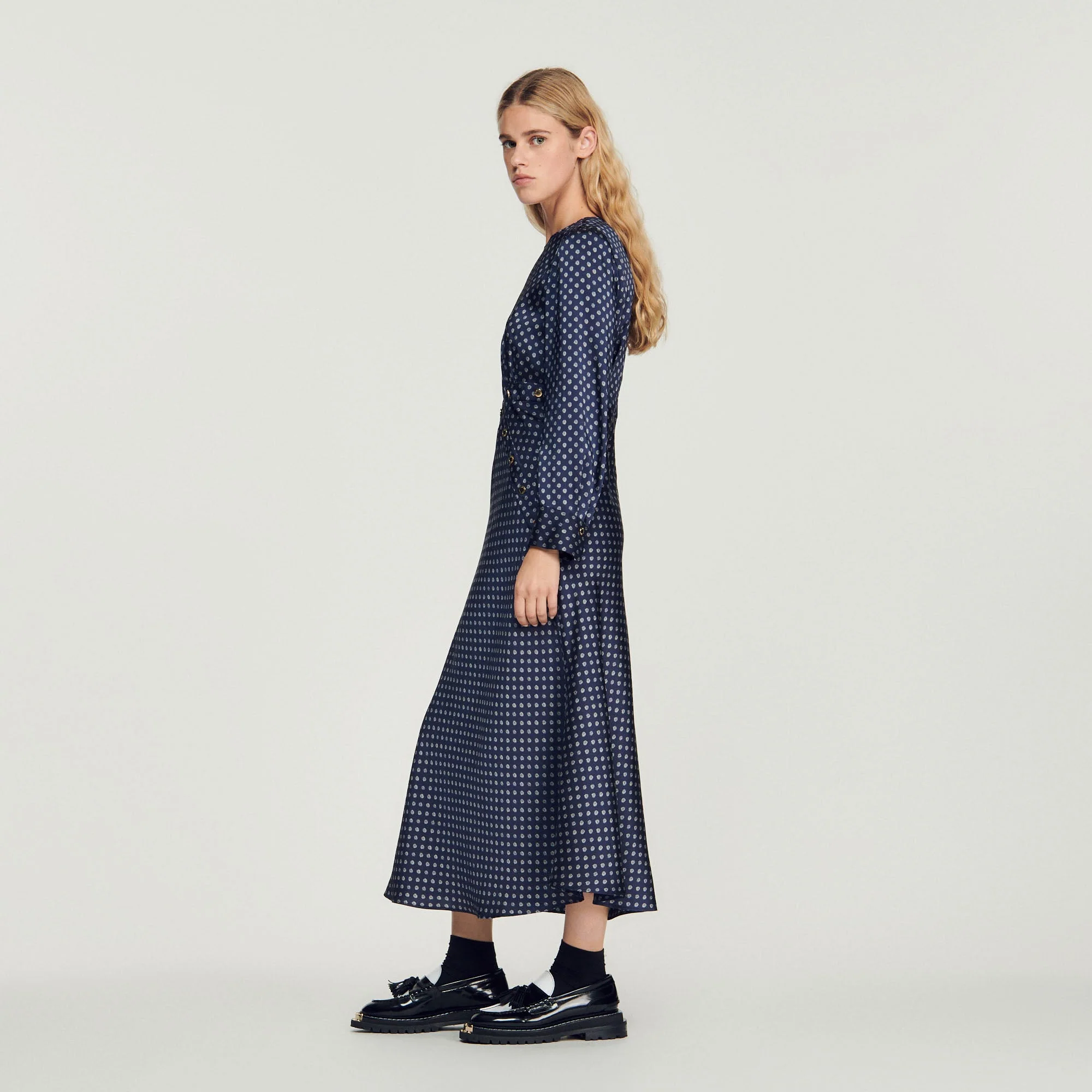 Vestido largo fluido de manga larga y cuello redondo, sublimado con un estampado de pequeños lunares y detalles de botones.
