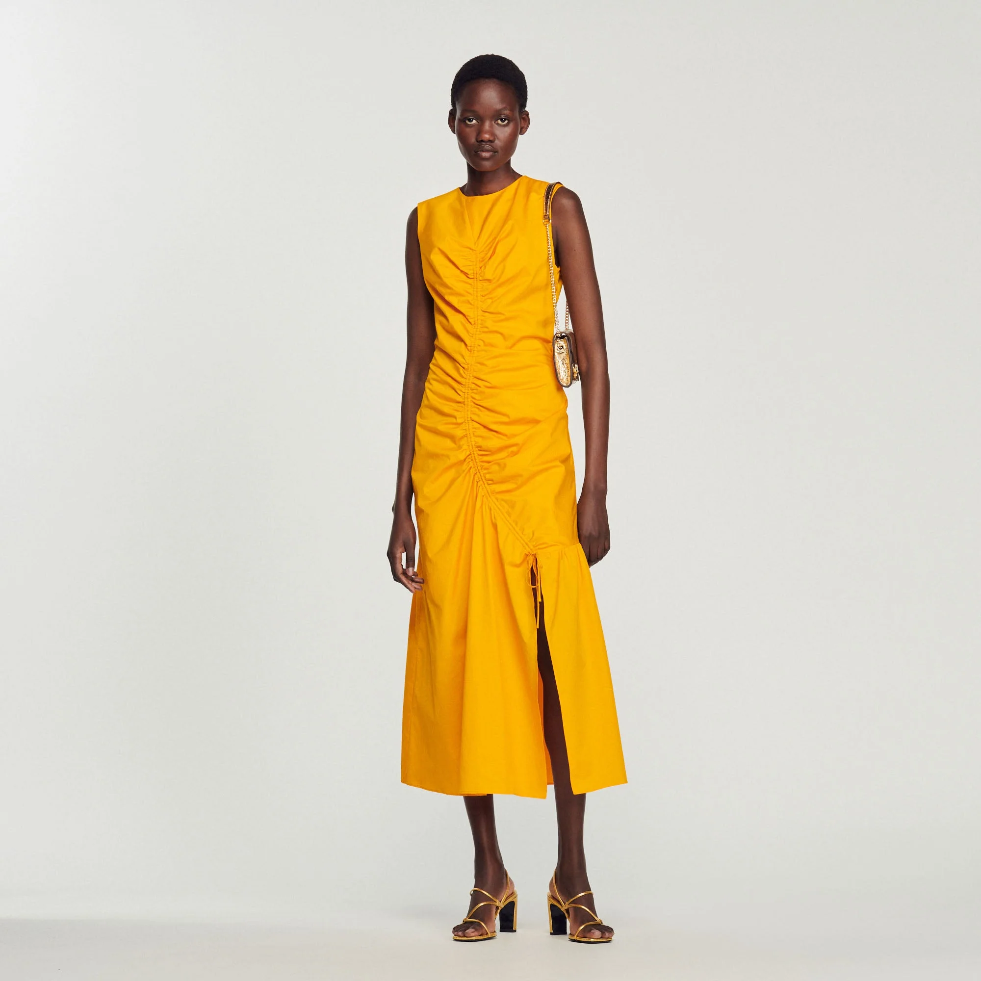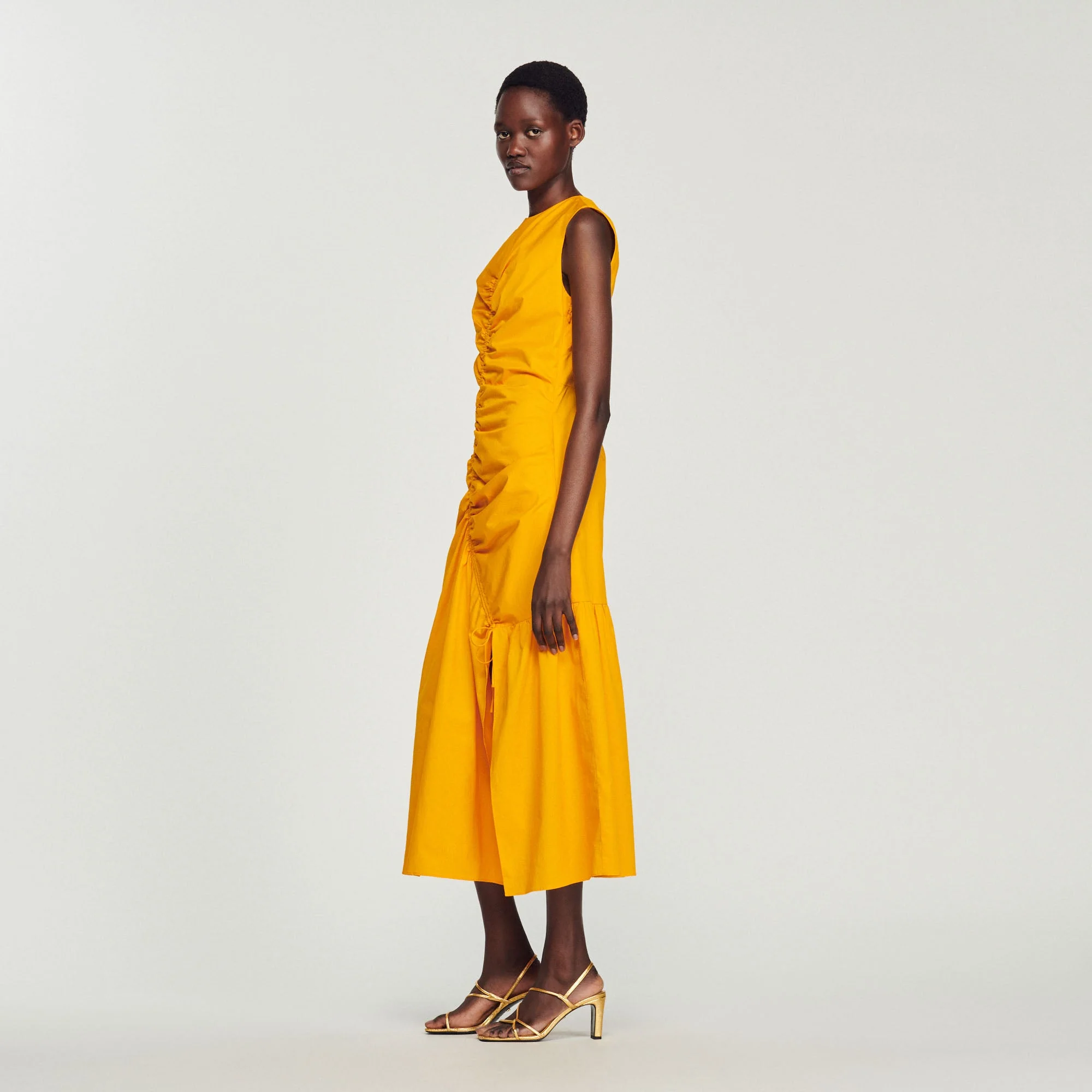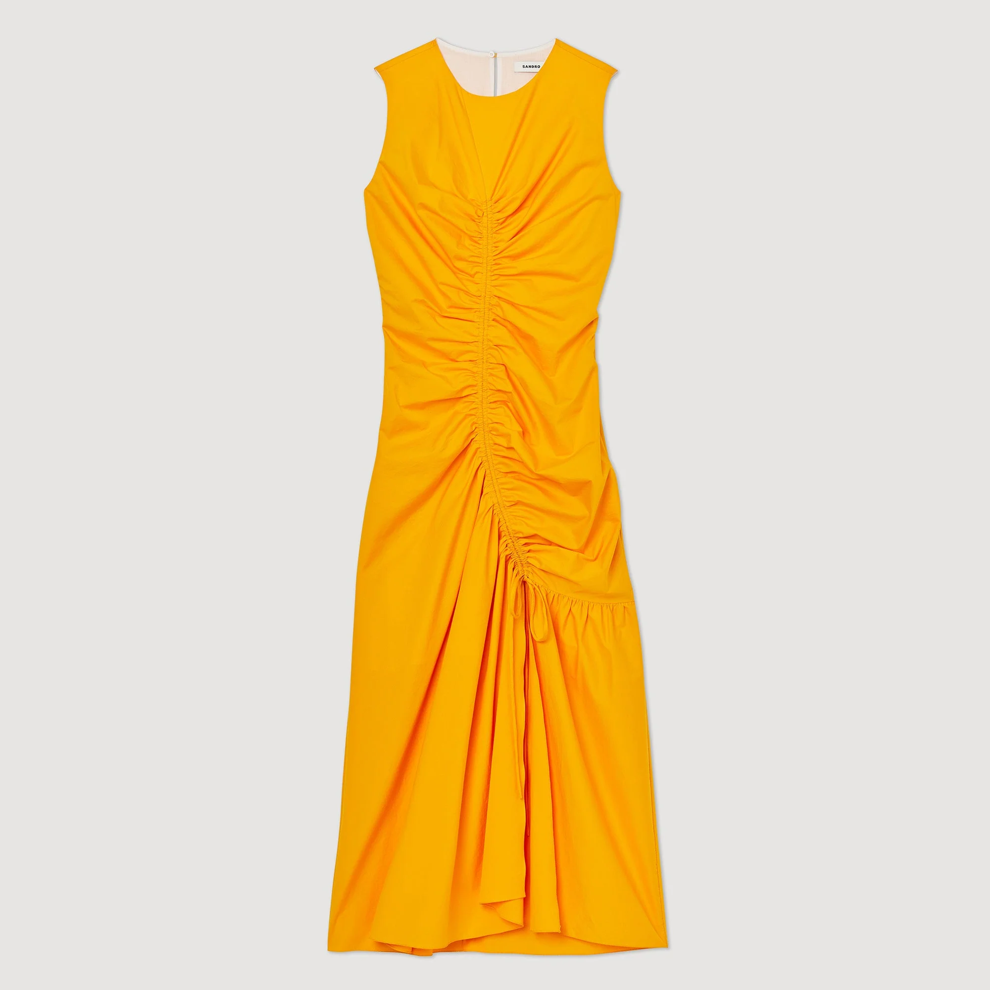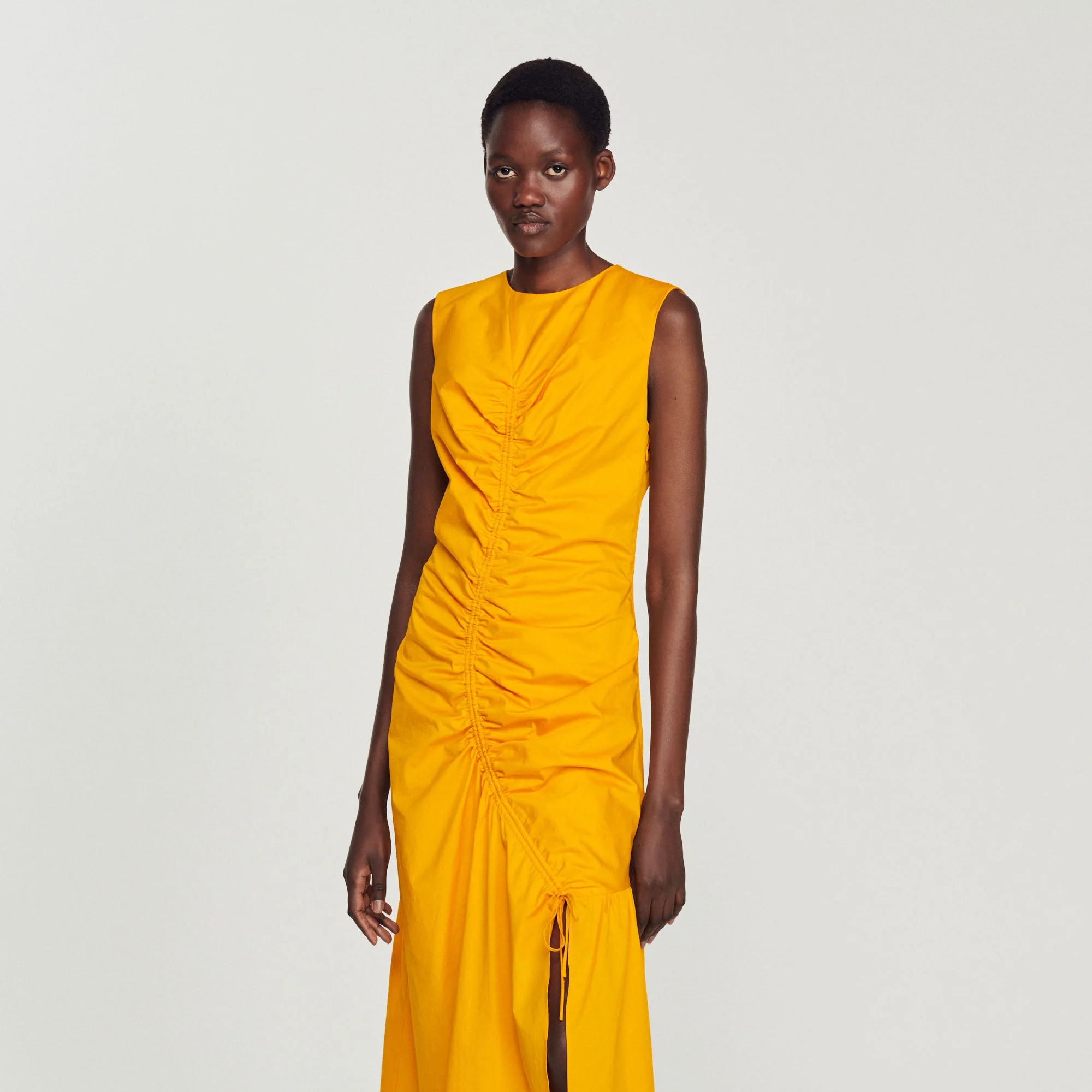 Vestido largo asimétrico sin mangas, con cuello redondo y cordones corredizos que revelan un juego de drapeados en la parte delantera.• Vestido largo Sandro de mujer