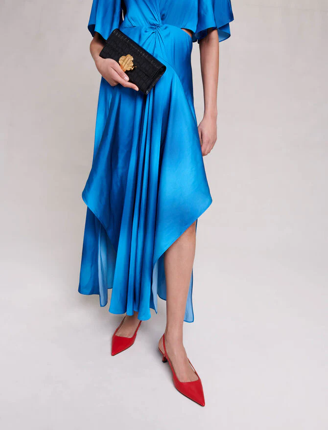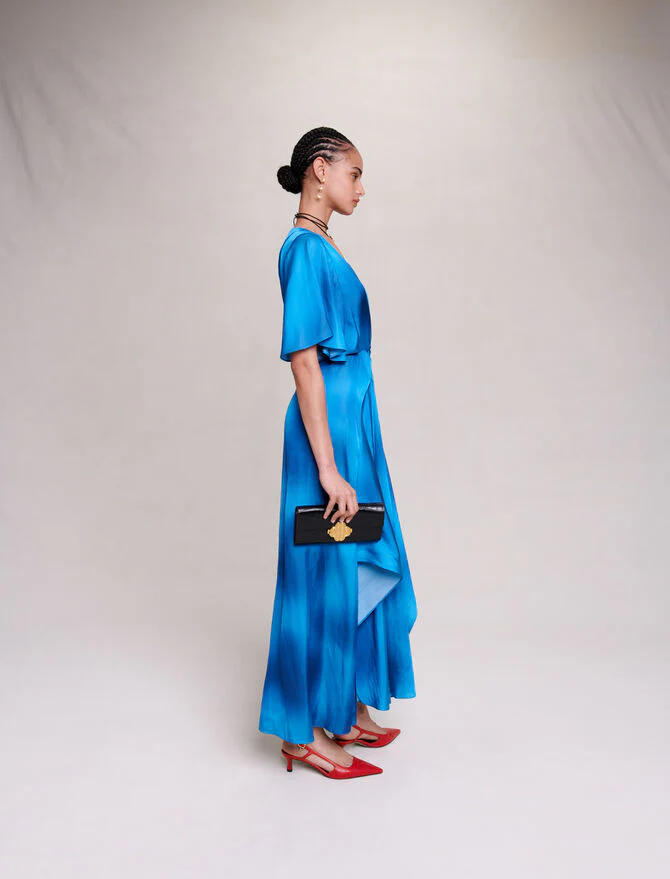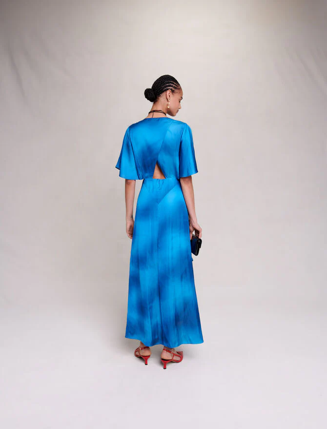 Sumérjase en la nueva colección de Maje, de inspiración británica y con un toque romántico. Las piezas intemporales de su guardarropa reciben una vuelta de tuerca artística para resaltar sus figuras con estilo.Delicadamente satinado, este vestido largo de paracaídas con un motivo «tie-dye» azul tiene un aspecto libre y asertivo.Con un cierre de cremallera y un escote en V, revela recortes calados a los lados, una parte posterior cruzada abierta y un efecto retorcido en la cintura. Sus mangas de mariposa y su falda asimétrica en punta aportan un toque de ligereza a la figura.Para llevarlo tanto de día como de noche, resalte su «look» con bisutería con carácter y botas de estilo del oeste.Ref.: MFPRO03097El tejido principal de esta prenda está fabricado íntegramente con poliéster reciclado. Un nuevo hilo fabricado a partir de residuos plásticos o textiles, para una mayor circularidad.En Maje, imaginamos el futuro. Compartimos el objetivo de reducir, un poquito más cada temporada, el impacto en el medio ambiente de las prendas que diseñamos.