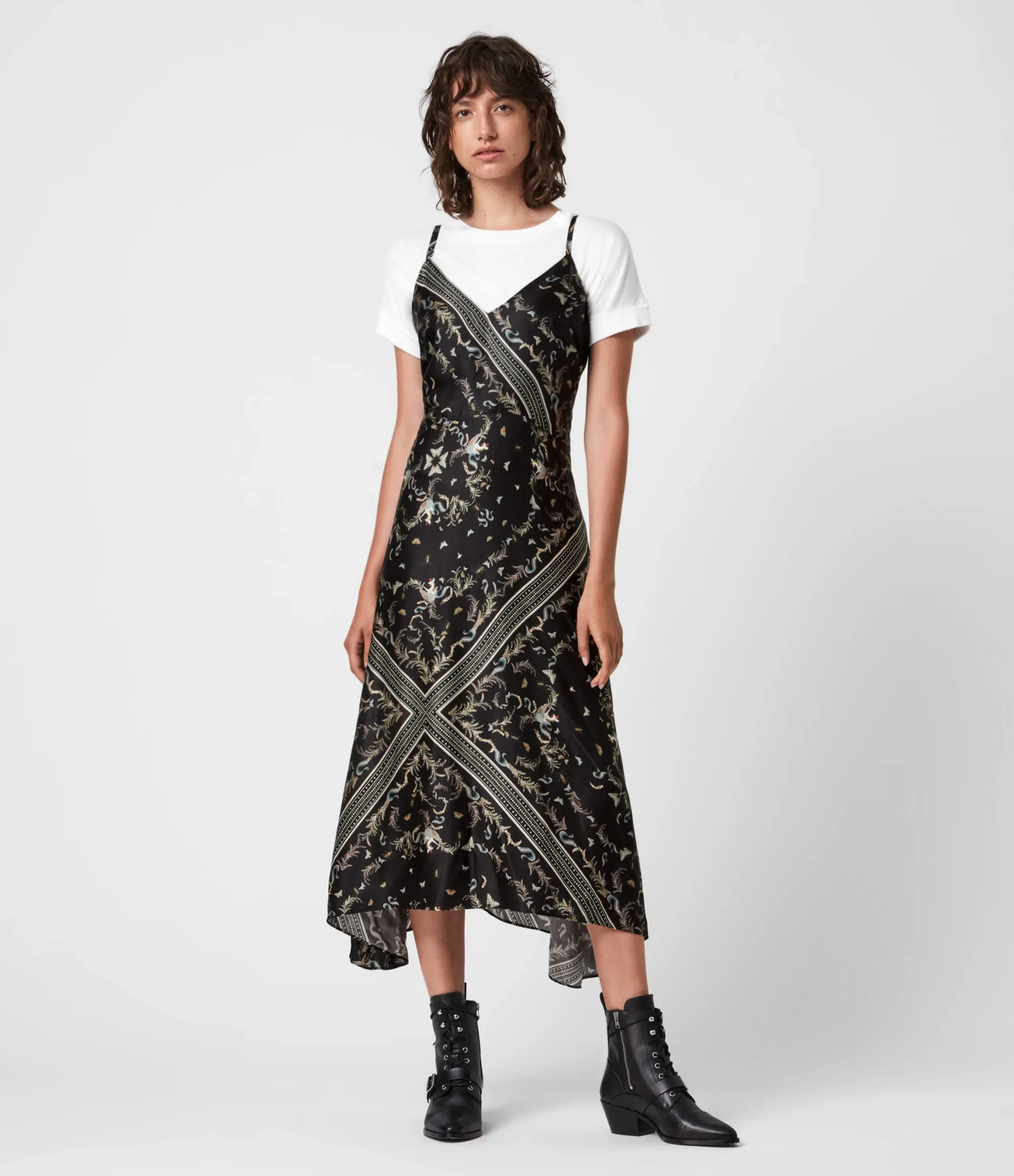 Vestido Larisa Assam Negro para mujer , marca AllSaints. Consultar composición e instrucciones de lavado en etiqueta interna. Los tallajes numéricos para esta marca están expresados en tallas británicas, para conocer su equivalencia, consulta el cuadro de tallas